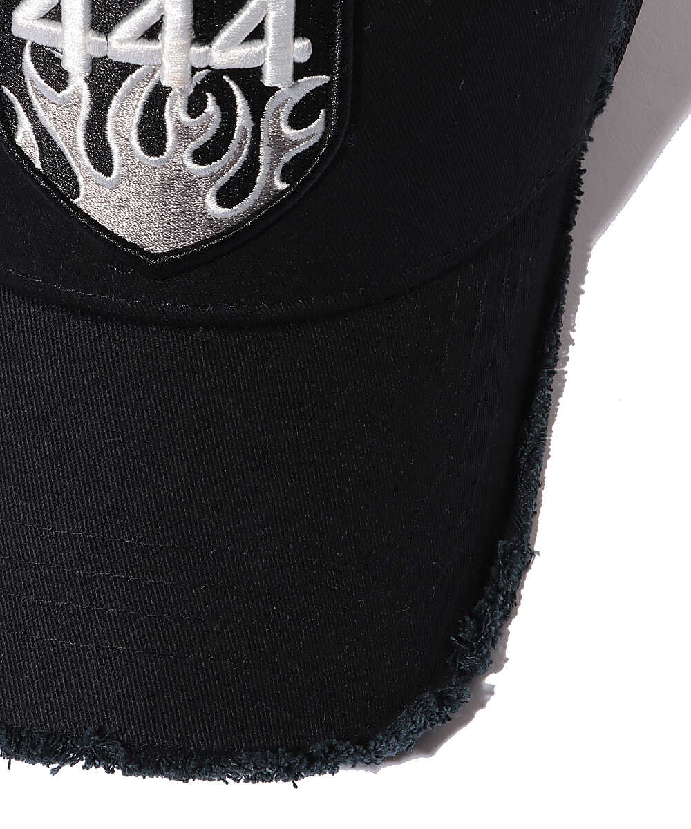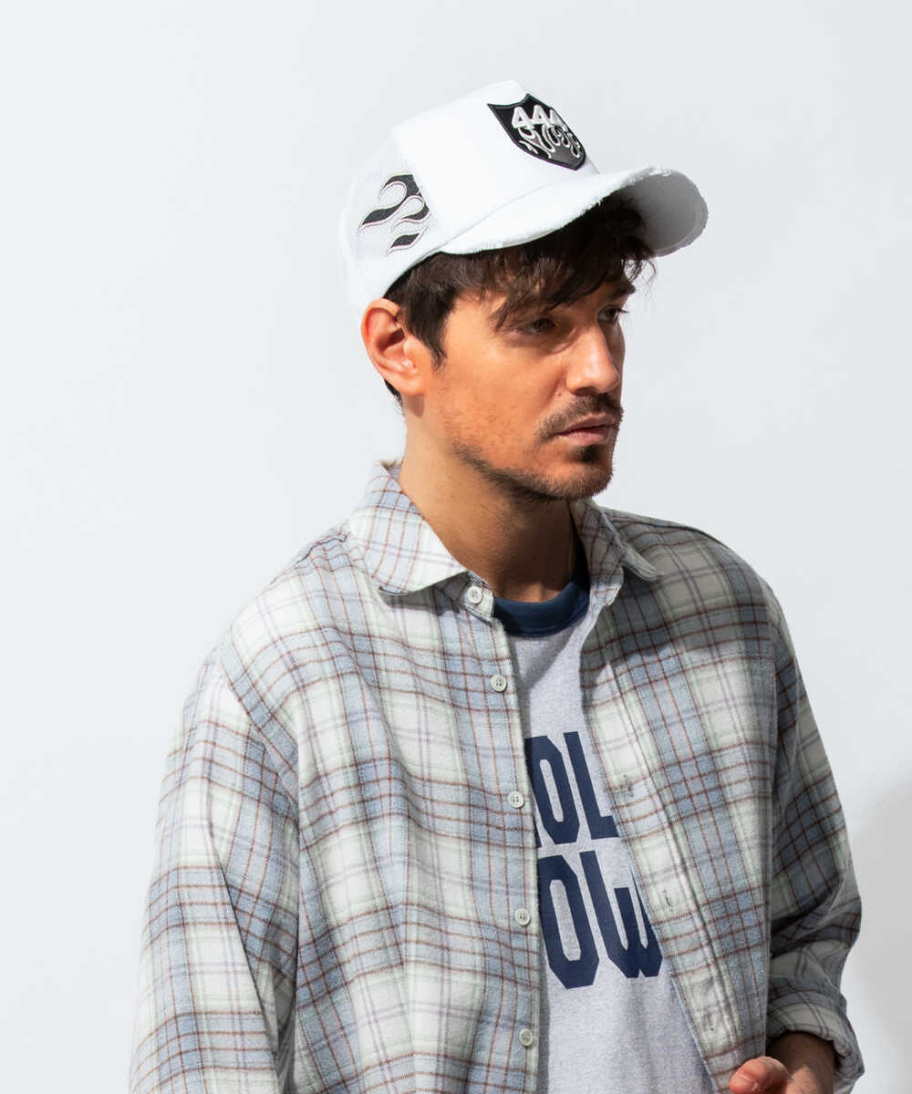 ラフなキャップをダメージ加工やワッペンなどで、見事にファッションアイテムとして成立させた1品。フロントにあしらわれた"444"の刺繍パッチが存在感抜群だ。丁寧なダメージ加工もさることながら、サイドのエンブレムなどは手作業でひとつひとつ取り付けられているというのだから驚き。