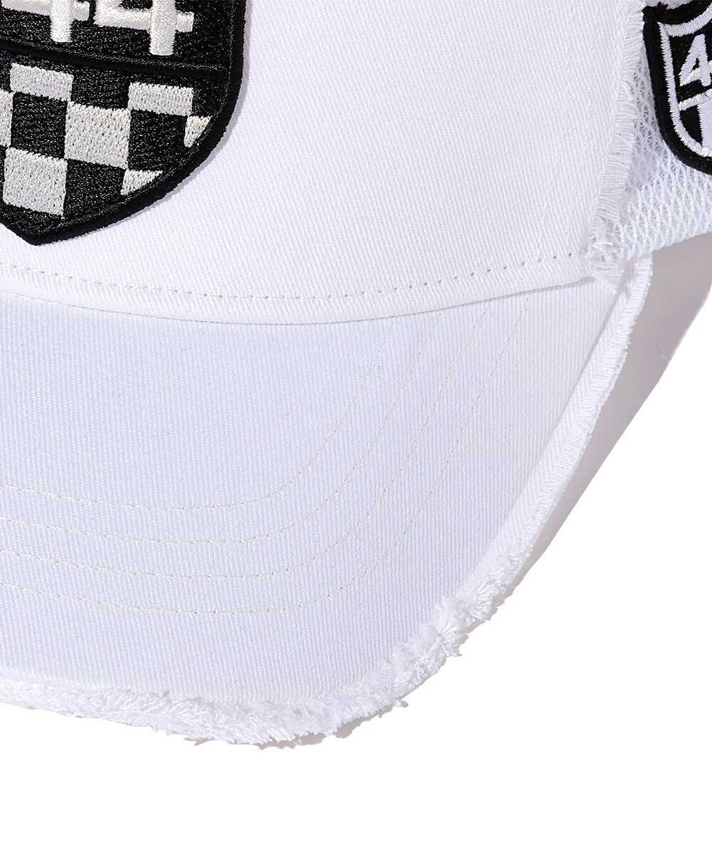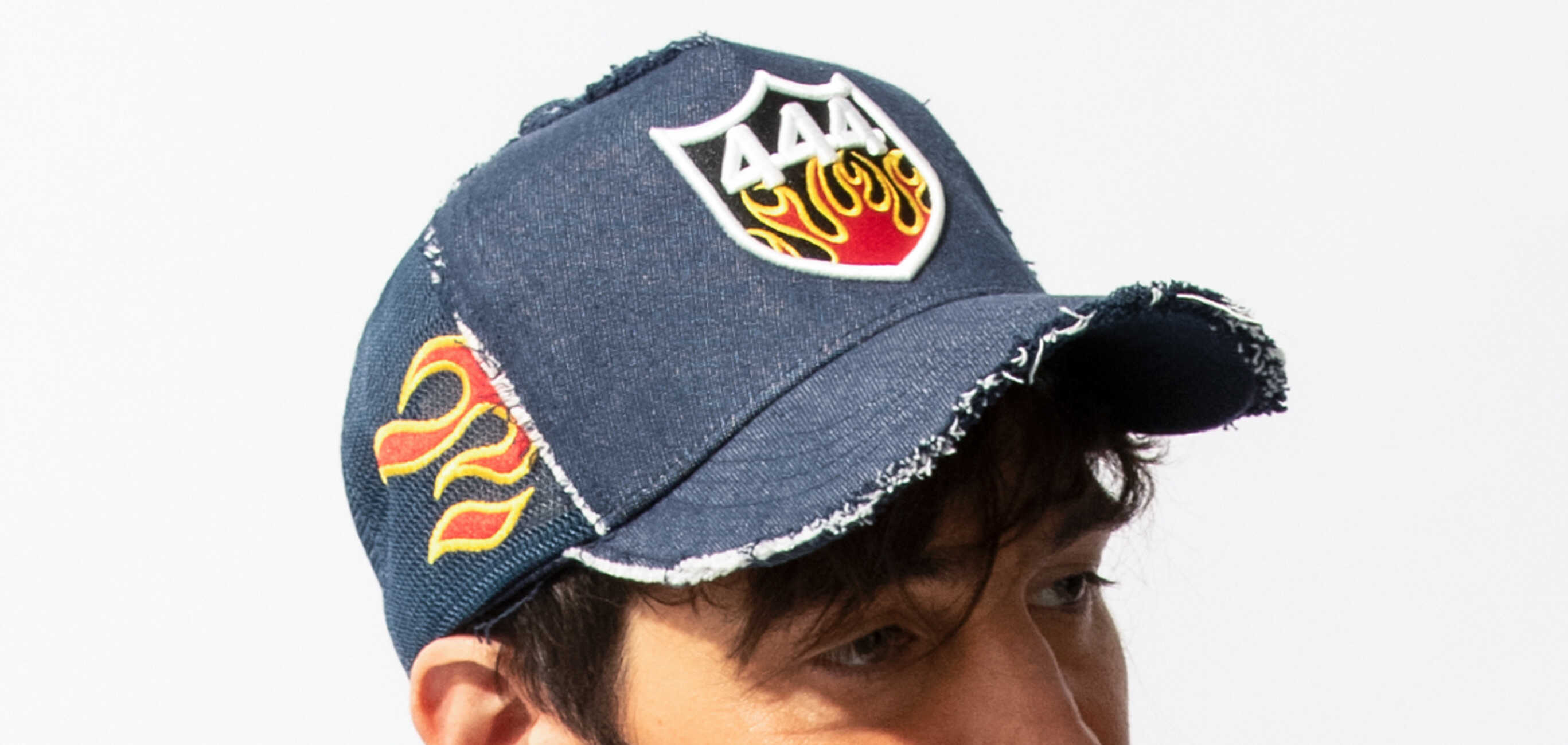 コチラはブランドのアイコンでもある"444"の数字をチェッカーフラッグと融合させ、軽快なムードに仕立てた1品。キャップをぐるりと囲むようにスターマークをあしらっており、これはアメリカンフラッグからインスピレーションを受けたものなんだとか。同じくダメージ加工も施されており、ふんだんにアクセントが盛り込まれている。