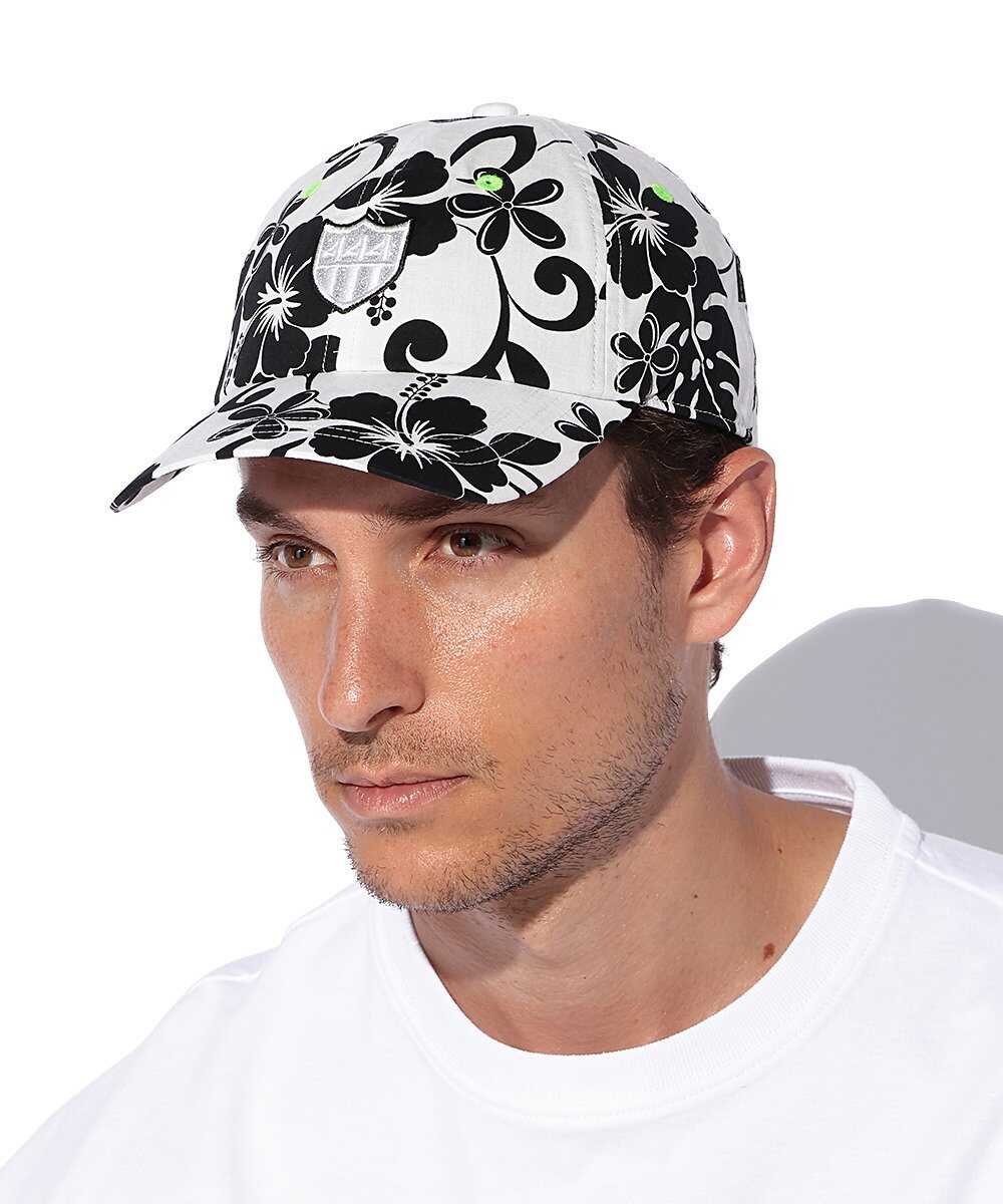最後にご紹介するのが、この総柄デザイン。ハイビスカスを取り入れたアロハ柄を、全面にあしらった1品だ。他のキャップと同様に色味を抑えることで、派手見えしない都会的なデザインに落とし込んでいる。さりげなく通気孔の穴の刺繍をアクセントカラーにしているのも見逃せない。