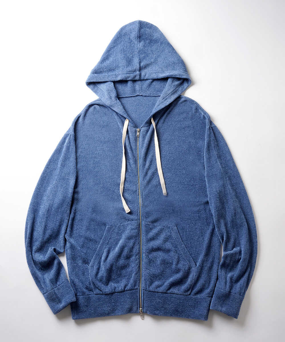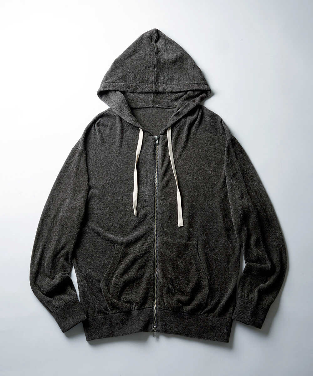 肌寒い朝晩にサラッとに気兼ねなく羽織れるジップパーカは、今の時季に欠かせないアイテム。パイルのようにふっくらとしたニット仕立てのパーカは、身体を優しく包み込んでくれる。上品な光沢感と、平紐コードのカジュアルさが絶妙なバランス。
