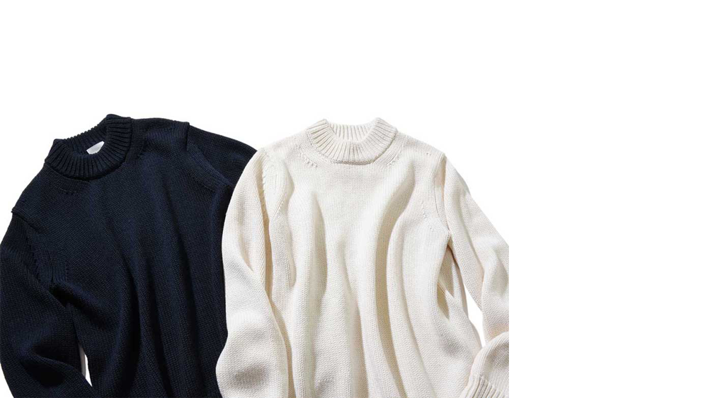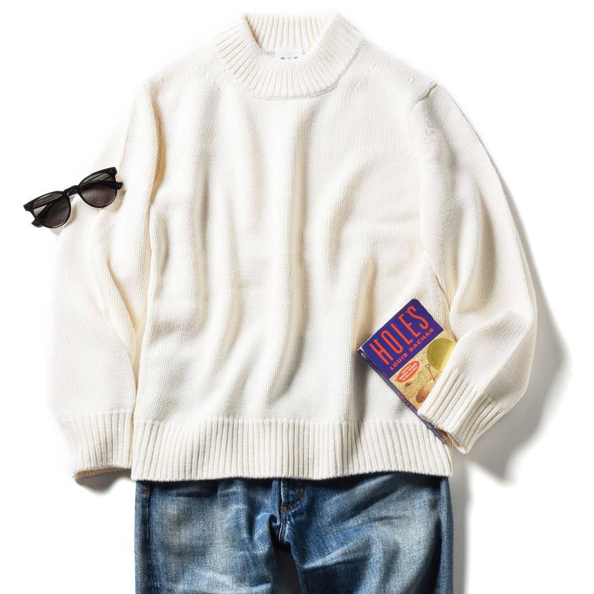 やや光沢のある上質なウールを使い、ざっくりローゲージに編み上げたモデル。タートルネックより首元がすっきり仕上がり、それでいて暖かいハイネックも特徴だ。太ピッチのリブはアクセントとしても機能。上品さとリラックスを両得できるので、大人のカジュアルコーデにおすすめ。