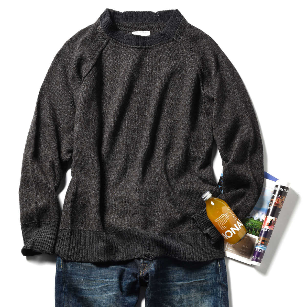 ニットは上品なイメージがあるけど、こちらはラグランスリーブのカジュアル顔。ネイビーのリブもカジュアルさを盛り上げている。ちウール×ナイロンを使用しているので、ミドルゲージながらニットとしてのウォーム感も確保。
