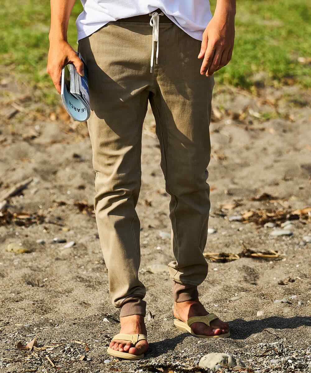 スウェットパンツを穿いているかのようなリラックス感と、それでいてスタイリッシュに見える細身シルエットが人気の〈ダブルピー ウエストポイント〉のイージーパンツ。これをベースに、サイドにカーゴポケットをあしらった1本がこちら。すっきりシャープな仕上がりはそのまま、さりげない男らしさを披露できるし、淡いベージュカラーがなんとも大人の余裕あふれる仕上がりとなっている。ストレッチ性バツグンの生地感や、腿の内側はガゼットクロッチと呼ばれる切り替えを施し、生地を多く使うことで実現した楽ちん設計は健在。シルエットは研究し尽くした、やや細身の仕上がり。脚に沿うようなシルエットで脚長効果もバツグンだ。