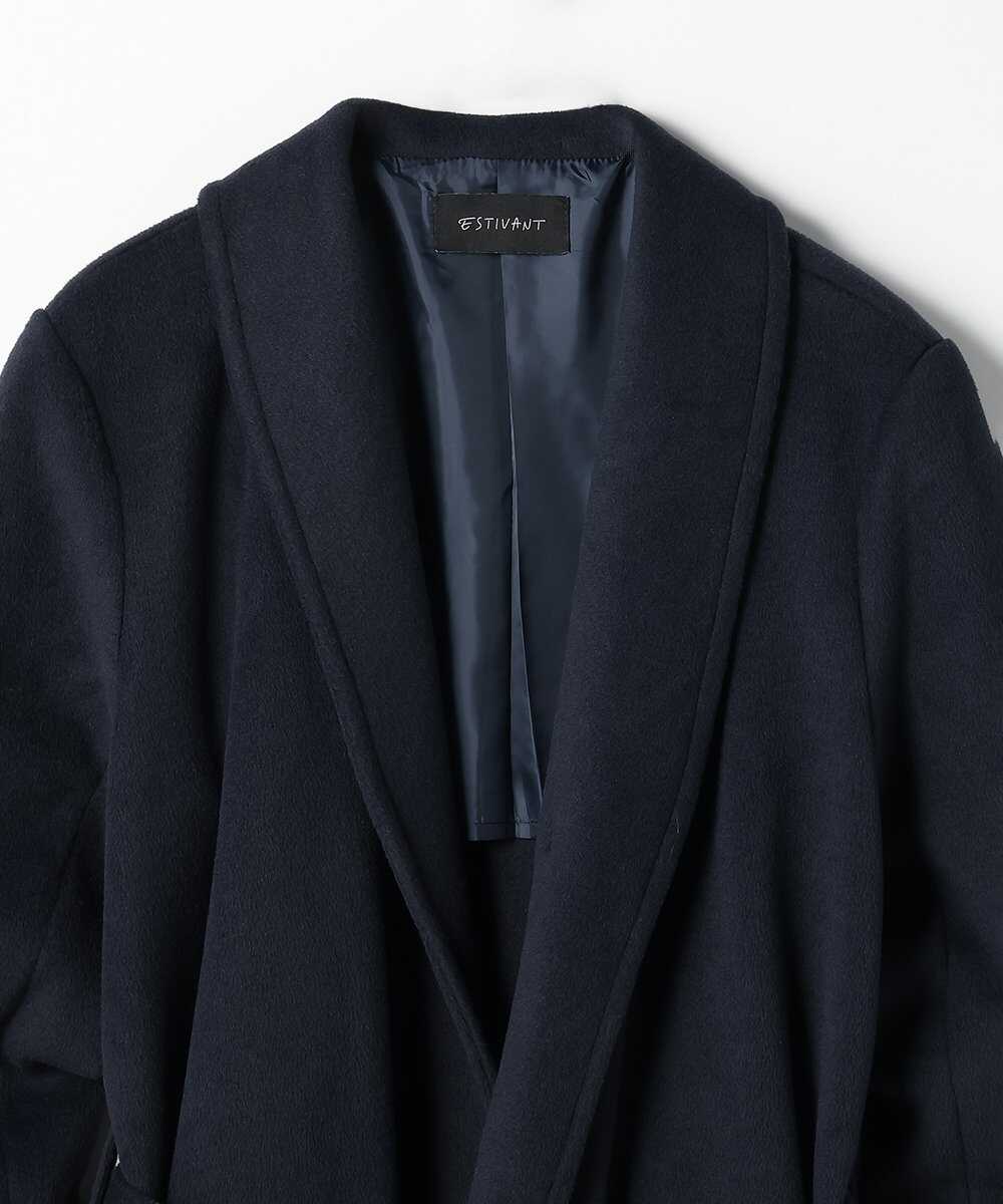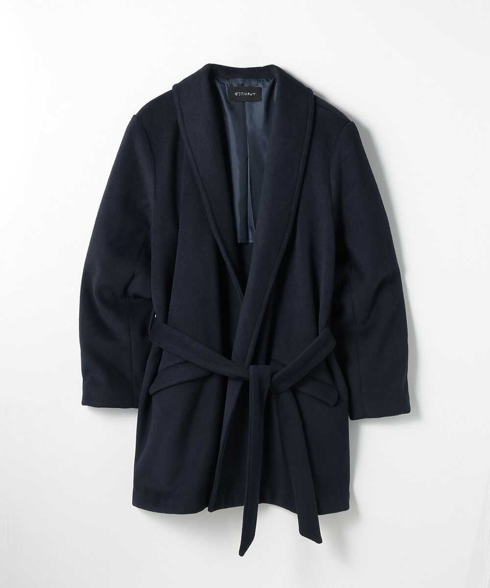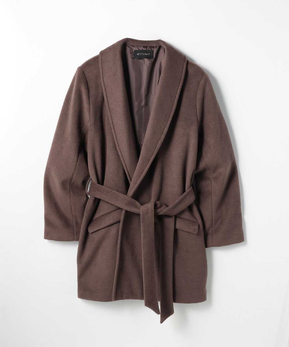 ミドル丈のコートは、ボタンレスのフロントと付属のベルトでまるでガウンのような出立ち。リラックス感を演出しつつも、生地感やショールカラーで大人の余裕を披露できる。肩パッドなしのアンコン仕立てで軽やかな着心地だ。