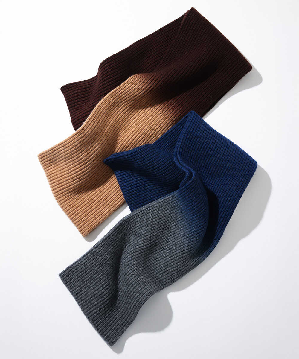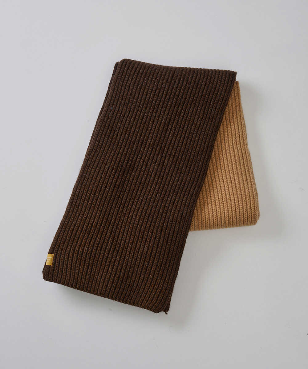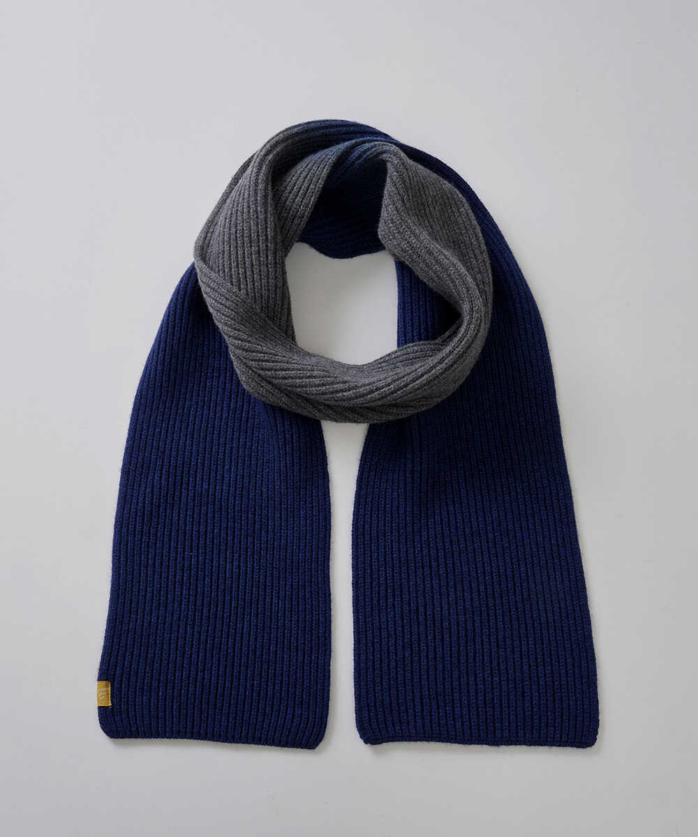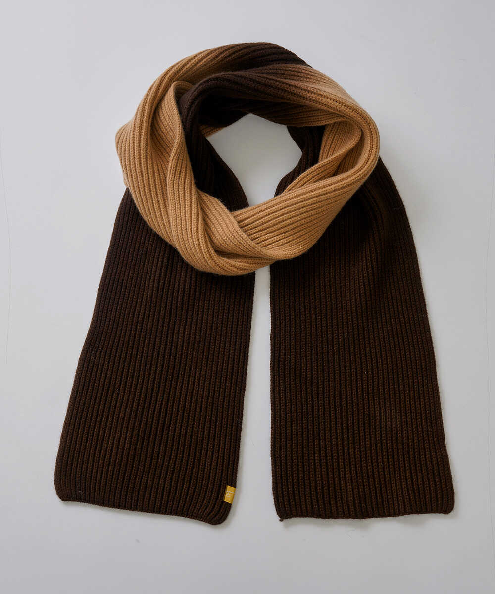 生地が途中からグラデーションして別の色に変わっていくマフラー。シンプルで普通に陥りがちなマフラーを、カラーバランスでこなれた1品にアレンジしたアイテムだ。結んだり、そのまま垂らしたりして、誰でも簡単に首まわりにアクセントを出せるのが嬉しい。