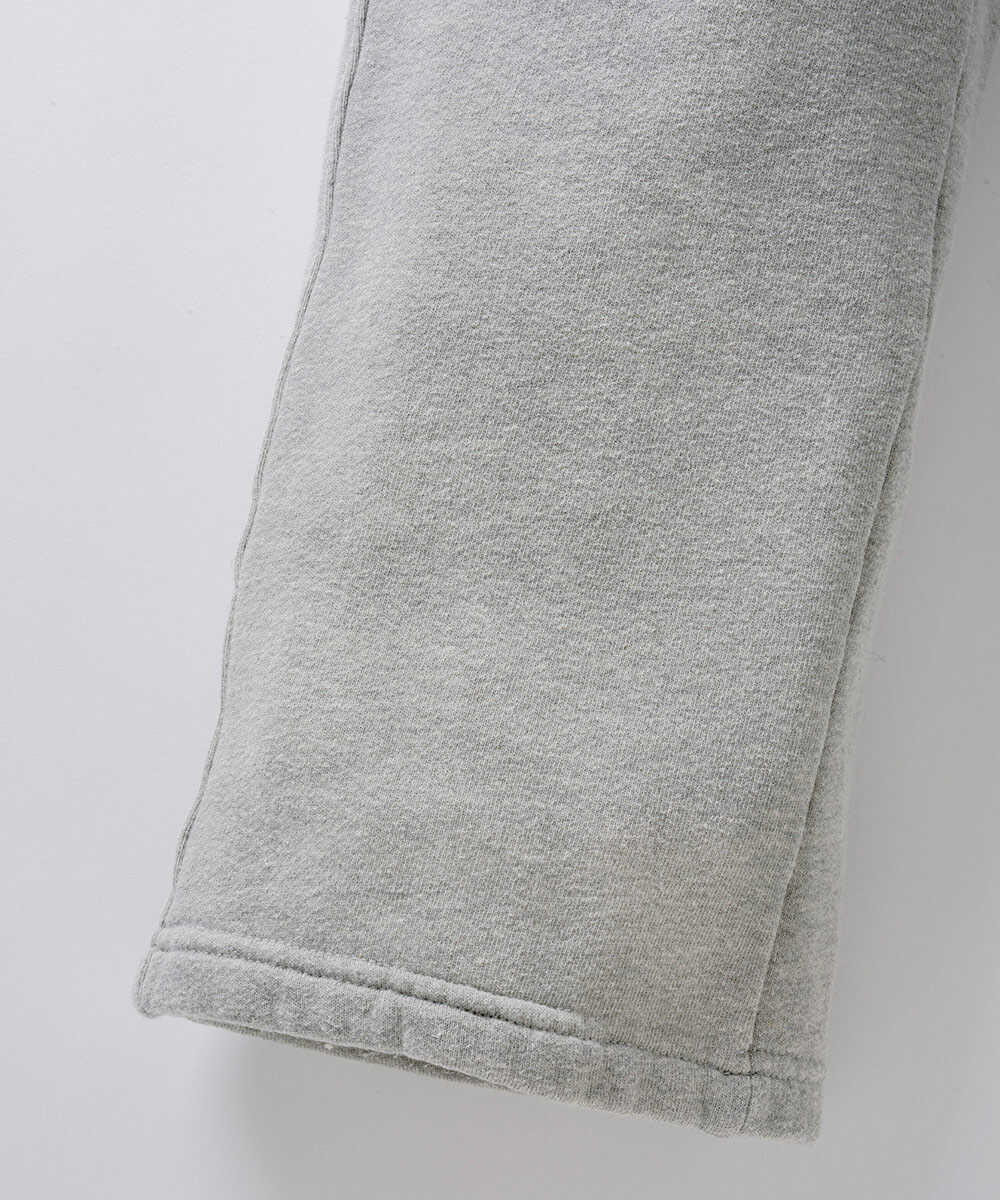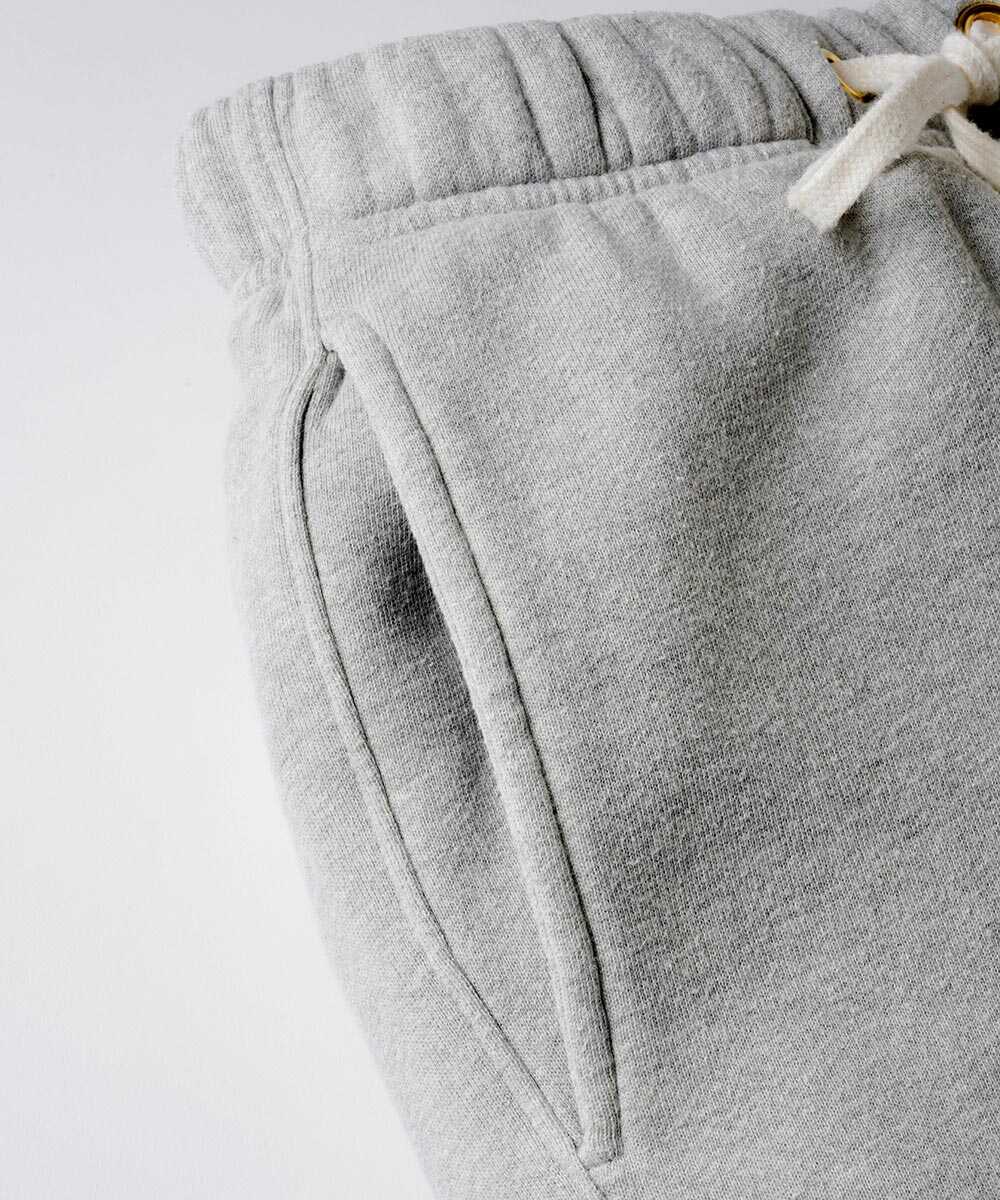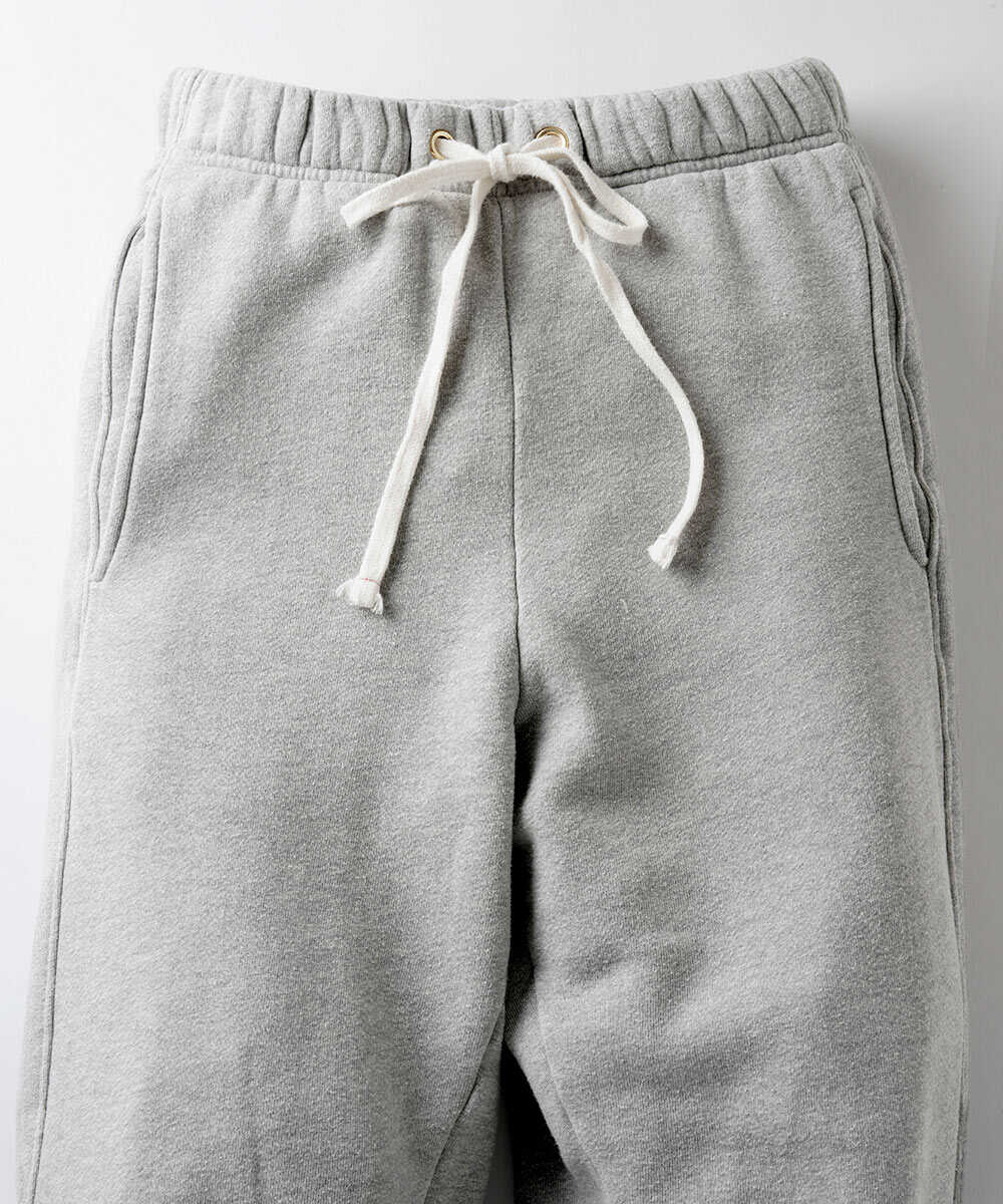 肉厚なグレースウェットパンツは、ドローコードを通すハトメがゴールドになっており、上品さも持ち合わせている。安っぽくない生地感が◎