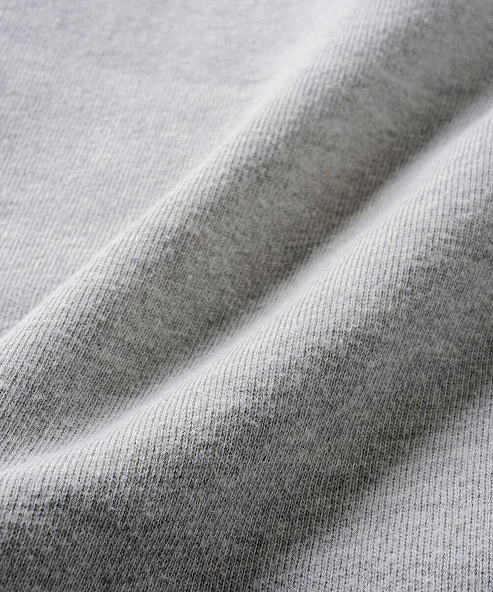 先ほどご説明したとおり、裾にリブがあるのですっきりとした見た目に。カラー展開はこのネイビーとキャメル。さらに同素材のジップアップパーカもあり、セットアップでの着用もレコメンドしたい。