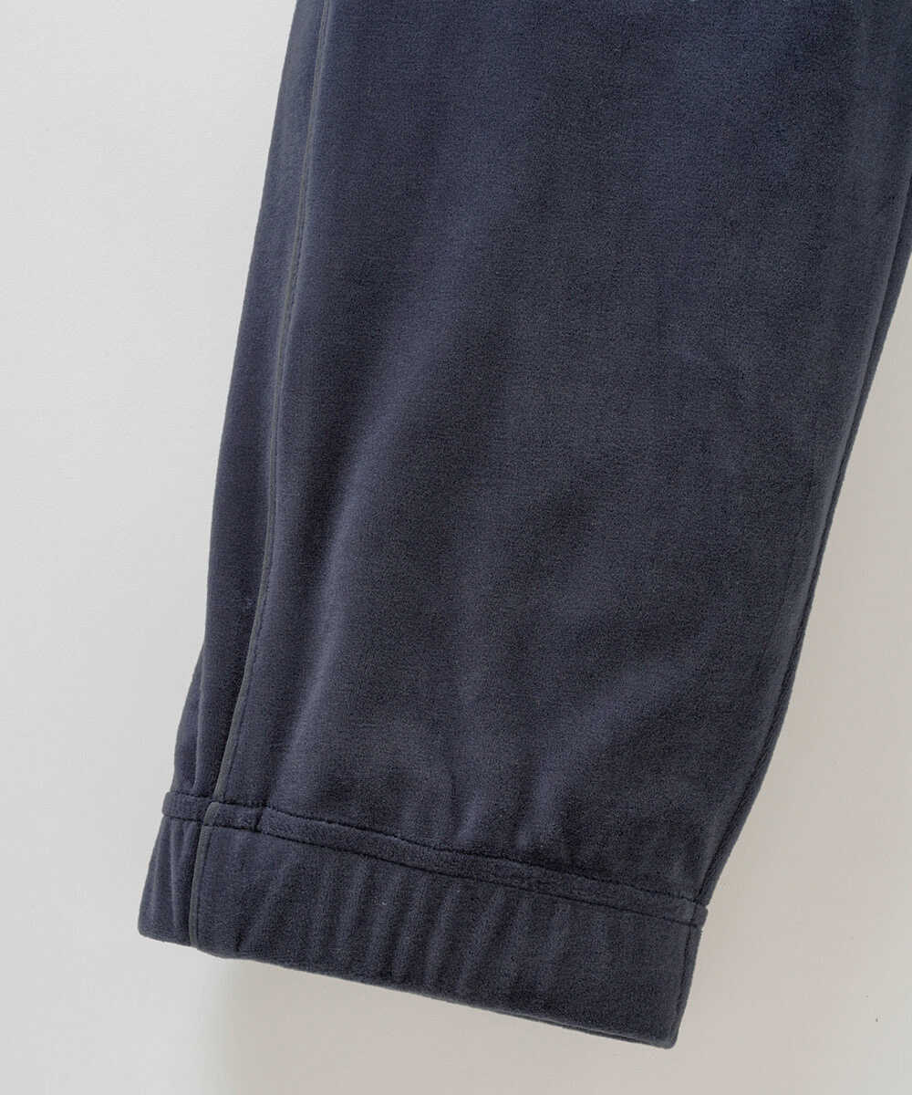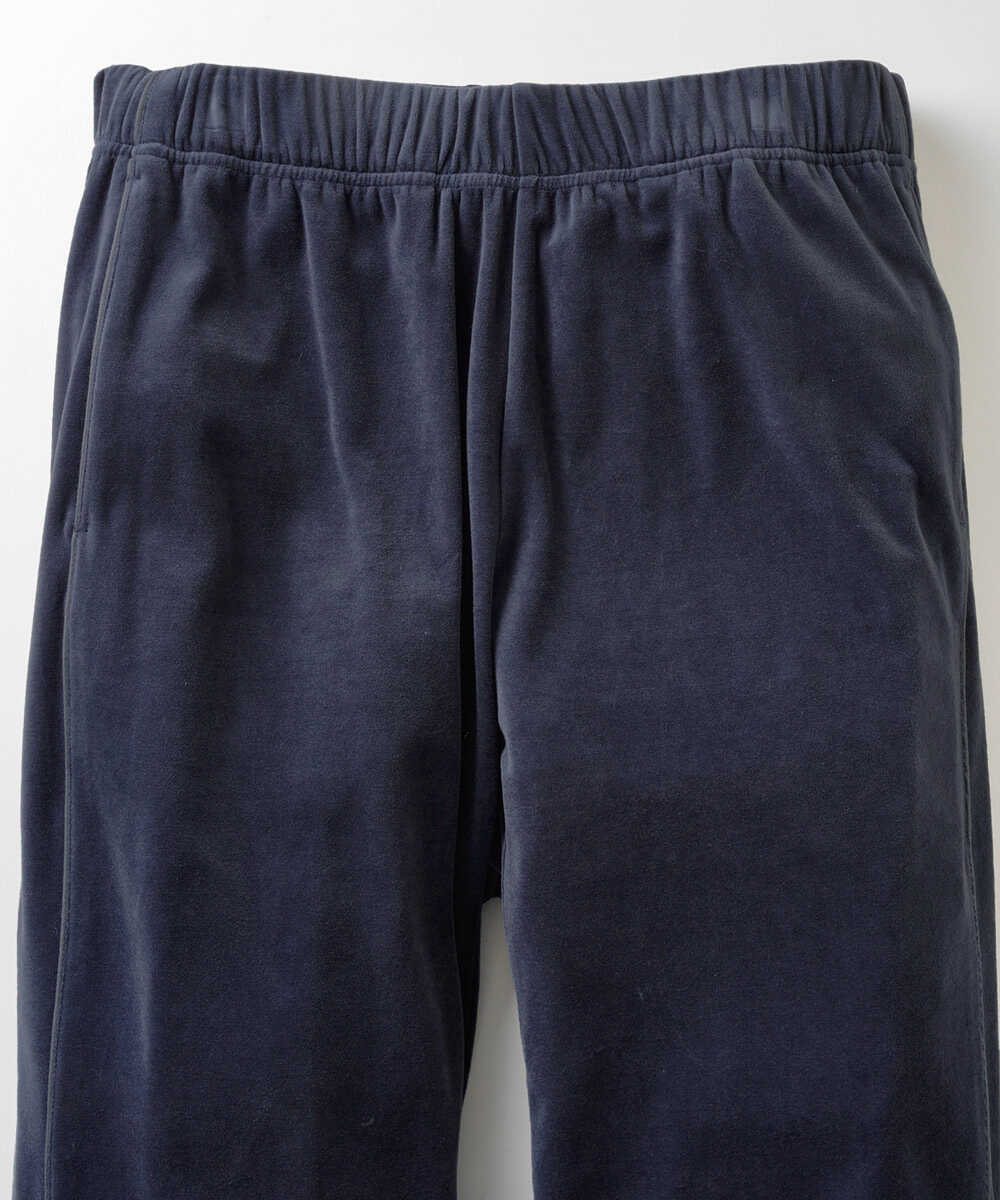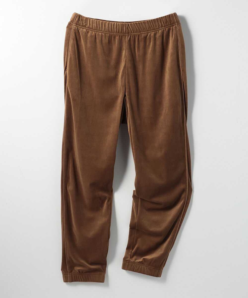 一段上の着心地のよさを求めるなら、ベロア素材はどうだろうか。コーデュロイよりも色気を出しやすい艶があり、包まれるような気持ちよさを味わえる。この1本は生地のドレープ感を生かしつつも、裾にさりげなくリブを作ることで足元がスッキリと見えるように制作。大人スポーティスタイルにうってつけな仕上がりだ。