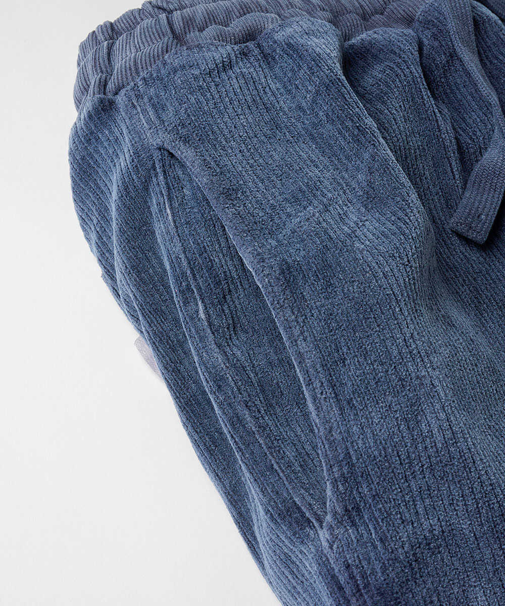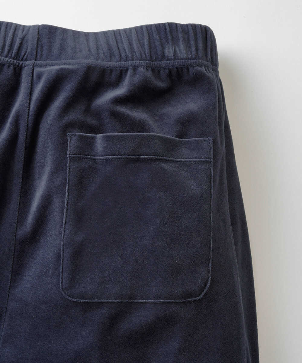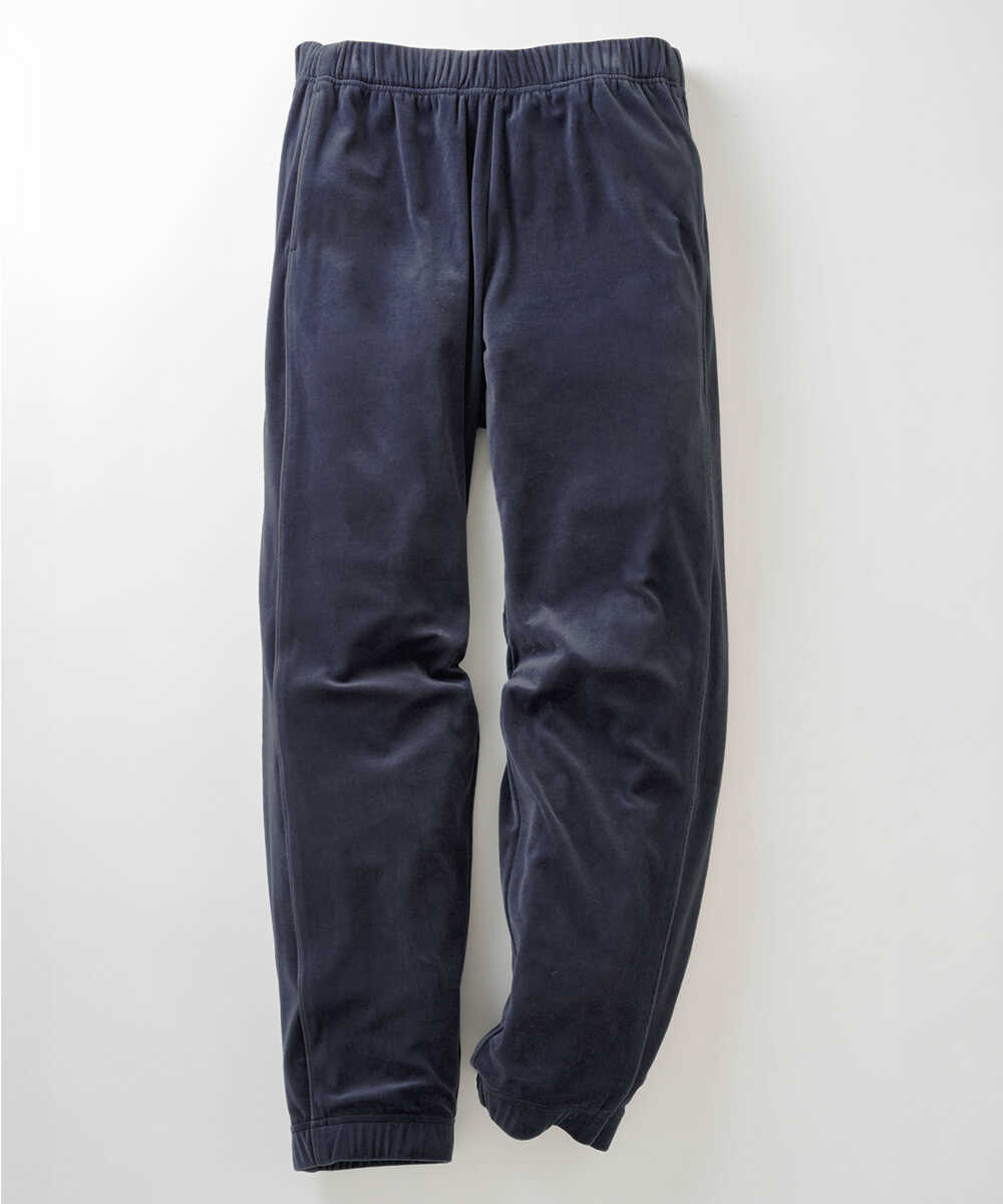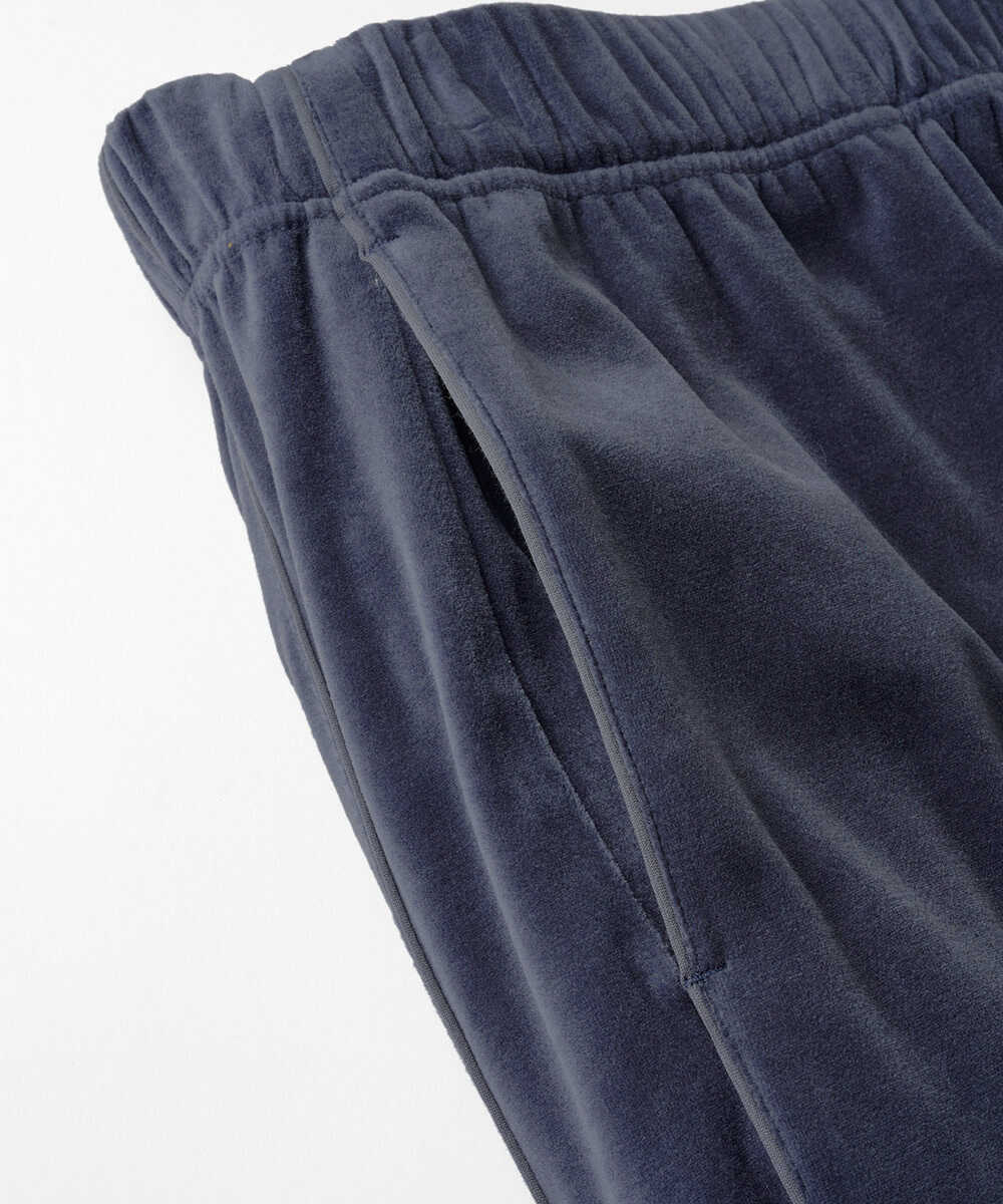 一段上の着心地のよさを求めるなら、ベロア素材はどうだろうか。コーデュロイよりも色気を出しやすい艶があり、包まれるような気持ちよさを味わえる。この1本は生地のドレープ感を生かしつつも、裾にさりげなくリブを作ることで足元がスッキリと見えるように制作。大人スポーティスタイルにうってつけな仕上がりだ。