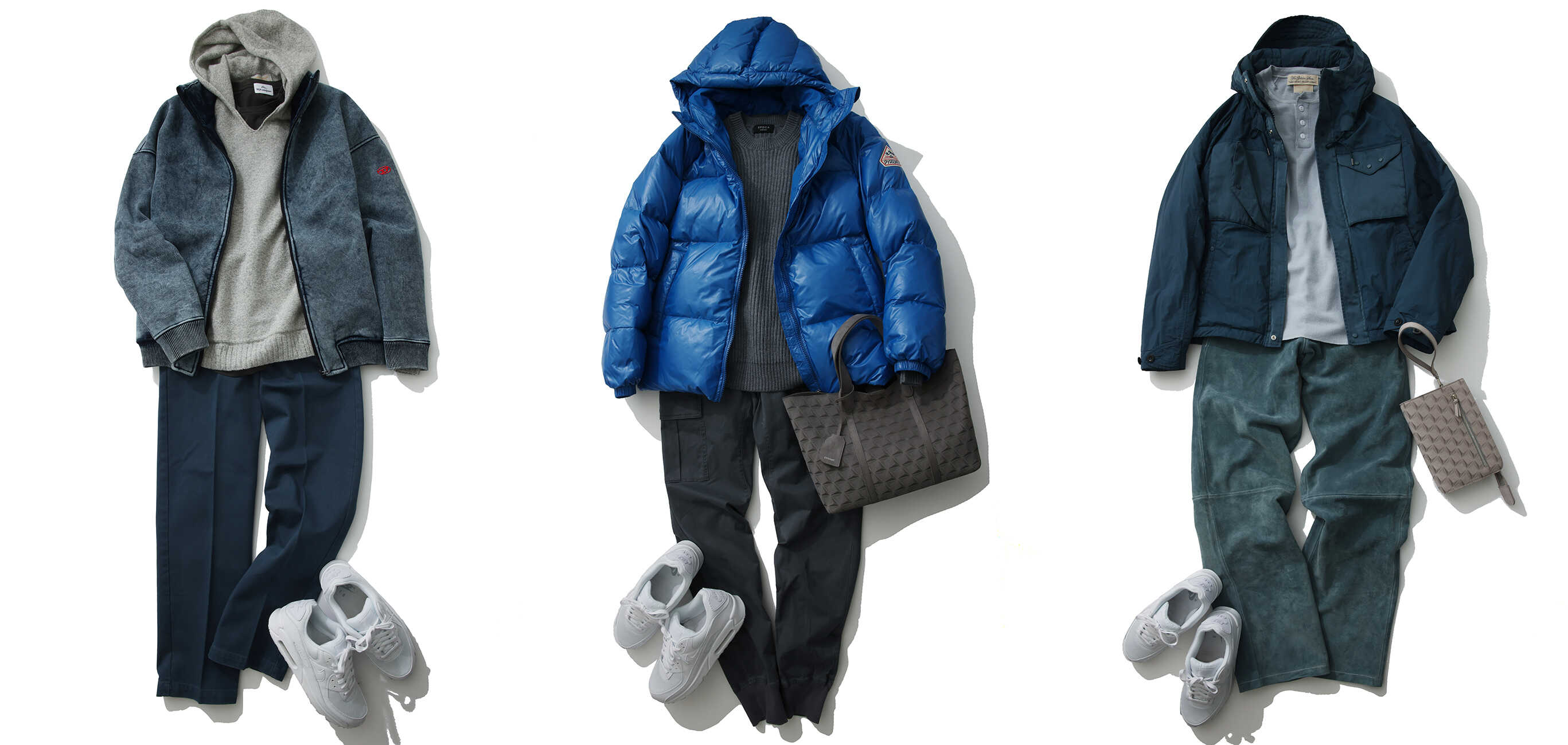 コチラはなんともアイキャッチなブルーのダウンを主役にしたコーデ。アウターが目立つように、他のアイテムをすべてグレーに統一しているのがわかるはず。で、ポイントなのがその濃度。ライトグレーだと、ちょっと真冬には軽すぎた印象になってしまうので、チャコールグレーで引き締めているってわけ。さらにそれぞれの素材感を変えているのもチェックしてほしい。これで同調しすぎず、着こなしに立体感が生まれ、こなれ感に繋がる!