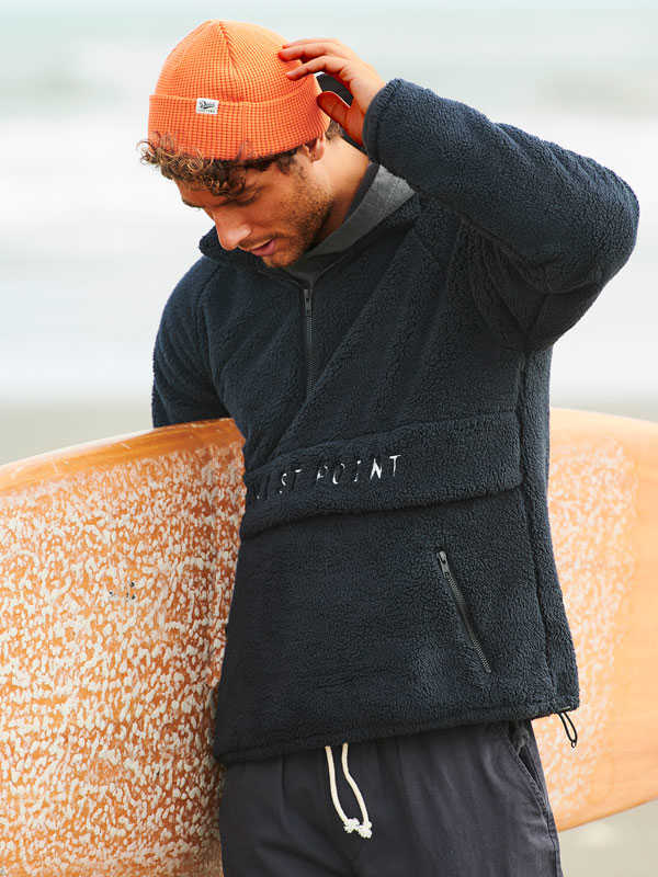 温かで優しい肌触りのフリースプルオーバーは、海上がりの疲れた体にもうってつけ。ボリューミーなフリースはときに子供っぽく見えるけど、黒でまとめると大人っぽい雰囲気に仕上がる。海に似合う褪せブラックをセレクトし、こなれ感をさらに倍増させると完璧。