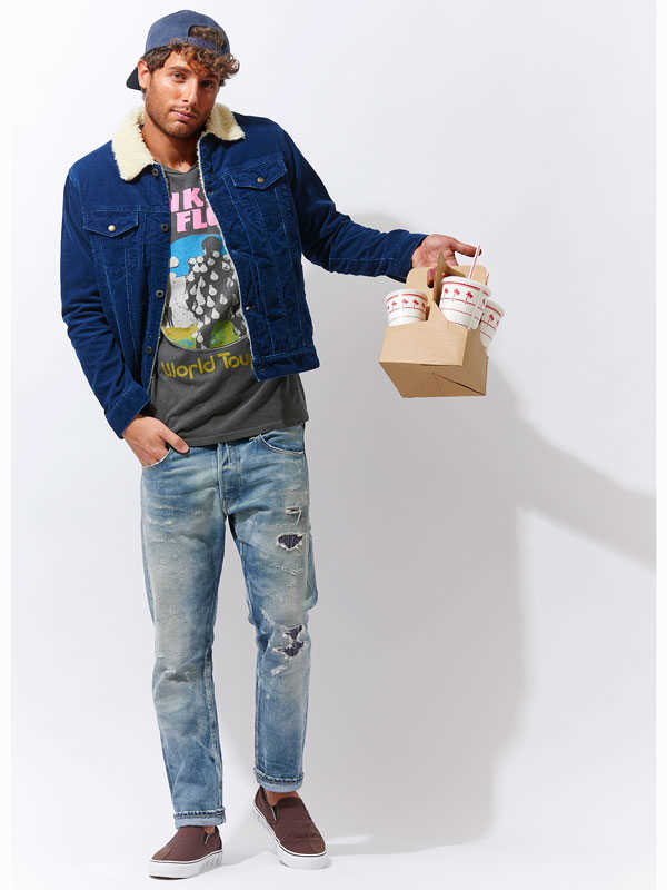 インディゴのボアジャケットは、ダメージたっぷりの薄青デニムとの相性がすこぶるいい。インナーは褪せ黒のプリントTをチョイスし、遊び心とこなれ感がさらに味つけしている。パッチワーク風デザインが印象的な茶のスニーカーは、着こなしを引き締める効果も。