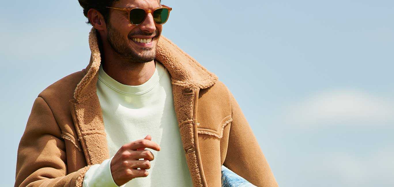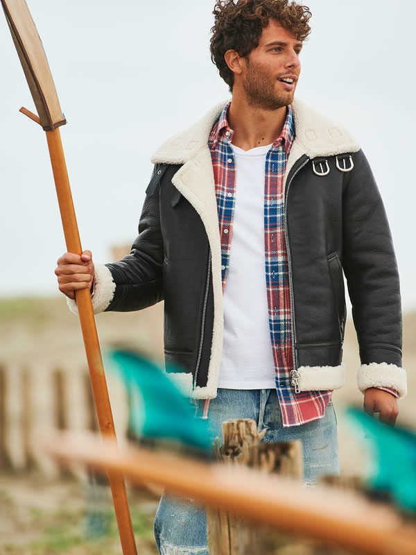 内側のボアも同色で仕上げることで、男らしく武骨なランチコートにリュクスな雰囲気もプラス。シープスキンレザーは防寒性に優れているのはもちろん、弾力があって肌触りもよく気持ちのいい着心地が味わえる。海にも街にもハマるアウターなので、ワードローブにあるとヘビロテで活躍すること必至だ。