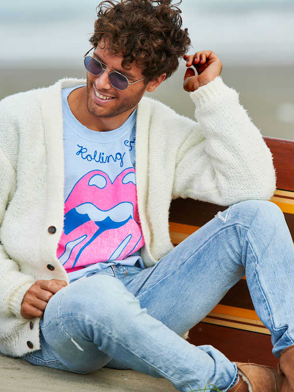 風合いは独特だけどデザインはシンプルなカーディガンなので、存在感あるプリントTとも好相性。デニムも薄青をチョイスして全体を淡色系でまとめている。これからの時季はダークトーンが多くなりがちだから、このコーデなら街でも海でもパッと目を引くはず。