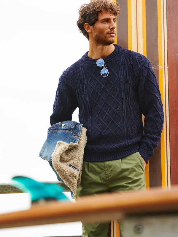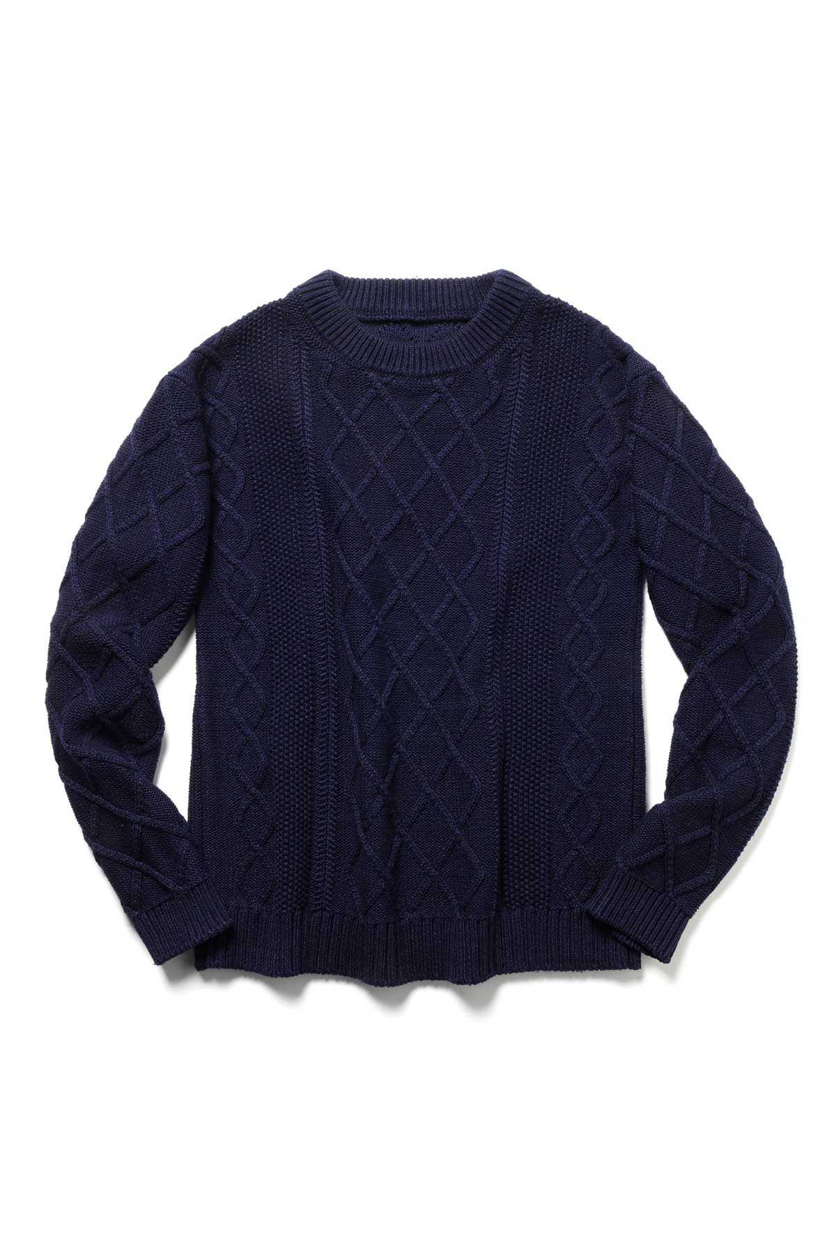 デニム調の色みを染色で表現した糸を使用することで、ケーブルニットならではのほっこり感を中和。ウォッシュ加工を施しているので適度に味もあり、潮っぽくこなれたムードも醸し出している。インディゴアイテムで心配な、色移りの心配もなし。味デニムはもちろん、チノパンやスウェットパンツとも文句なしの相性だ。スウェット感覚で気軽に取り入れてほしい。