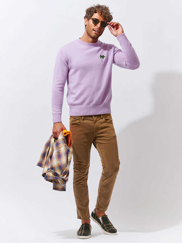 ラベンダー×ブラウンというトレンドカラーの組み合わせが目を引く着こなし。ネルシャツとスニーカーは差し柄にもなるチェックを選択。パンツと同系色なので目立ちすぎることなく、スタイリングにうまく調和している。ヤシの木の刺繍も絶妙なアクセントに。