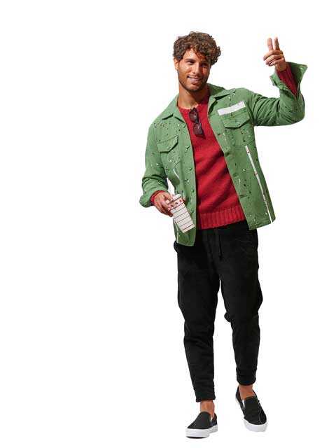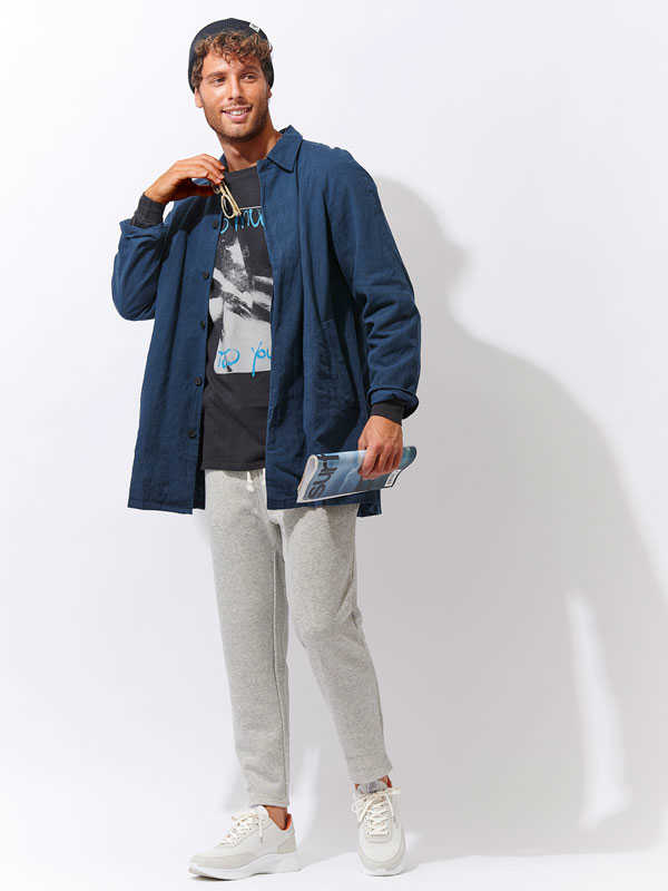 ラフなフリースパンツを街で取り入れるなら、きちんと感のある襟付きアウターがおすすめ。ペインティングが施された個性派ミリJKが、スタイリッシュさを高めるスパイスにもなっている。インナーはフリースの風合いとリンクしたミドルゲージニットを選択。