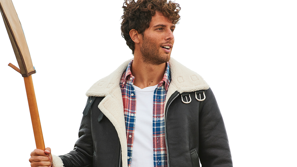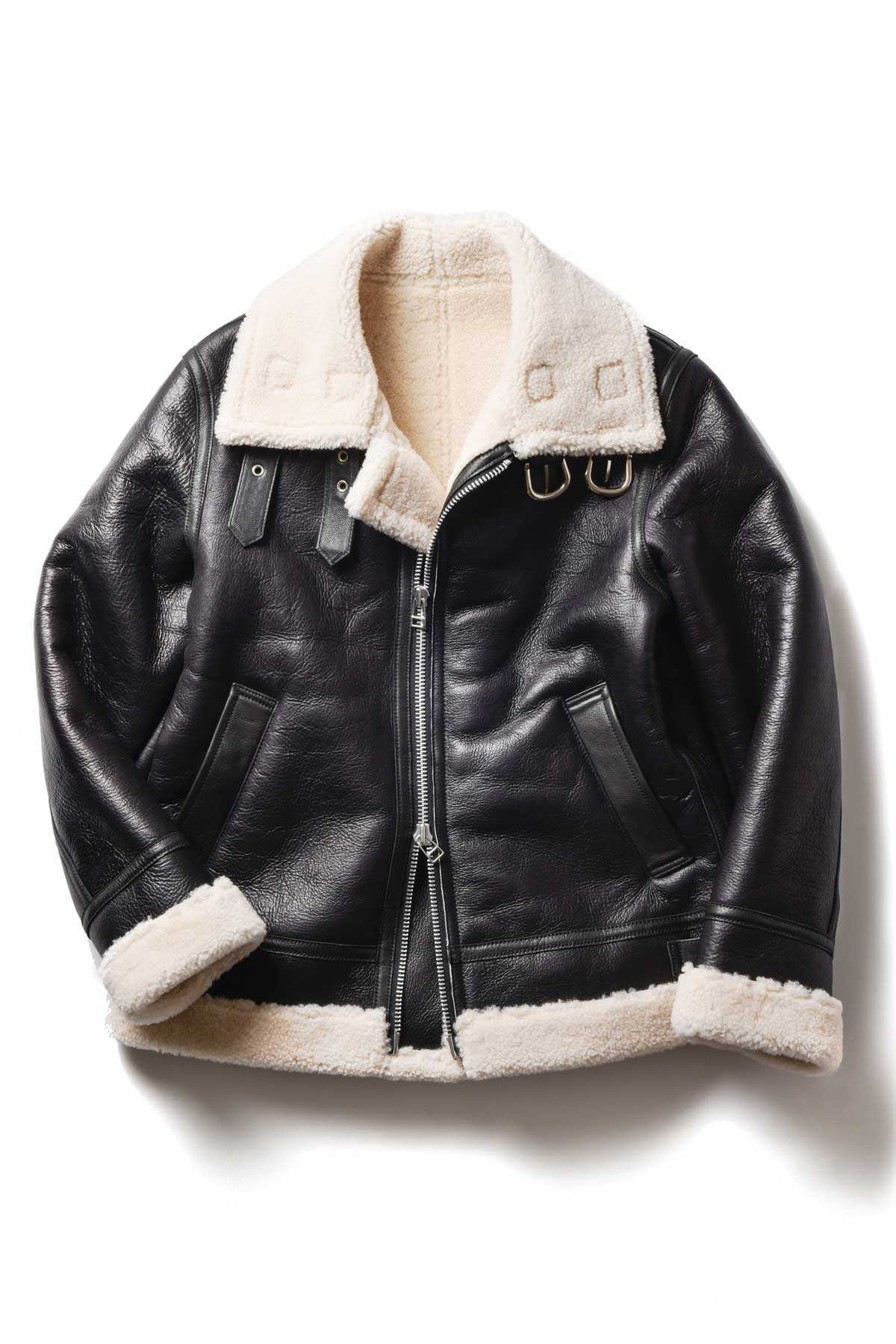 ミリタリーがトレンドの今季のアウターに、シープスキン製の本格派B-3ジャケットなんてどう? 内側もファー仕立てになっているのでかなり温かく、思わずTシャツの上に羽織りたくなるほどフワフワの肌触り。襟元のベルトを締めると表情が変わるだけでなく、風邪の侵入を防ぐので防寒性もさらにアップする。