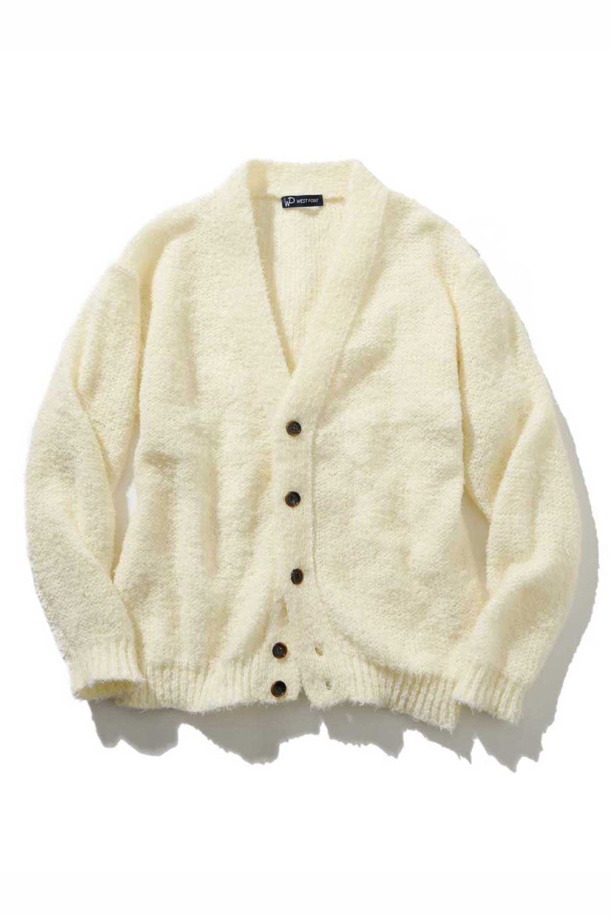 気軽にさらっと羽織れるカーディガンは、今から春先まで活躍する優れもの。しかもこちらはカシミヤのような柔らか〜い肌触りで着心地も抜群。思わず触れたくなるようなフワフワの風合いもポイントで、クリーンな白と相まって着こなしに抜け感を演出できる。どこか懐かしいクラシカルなボタンにも注目を。