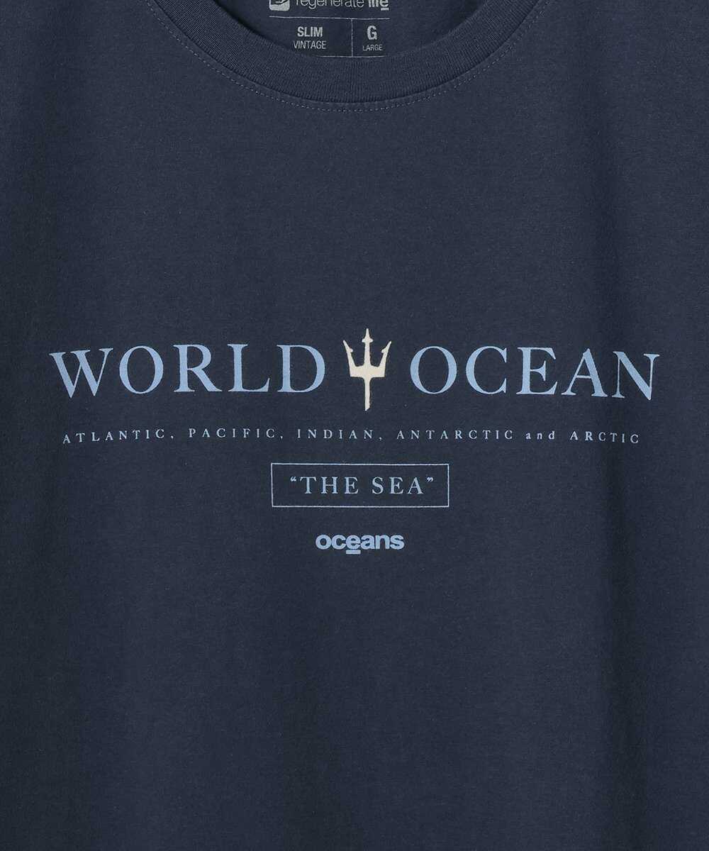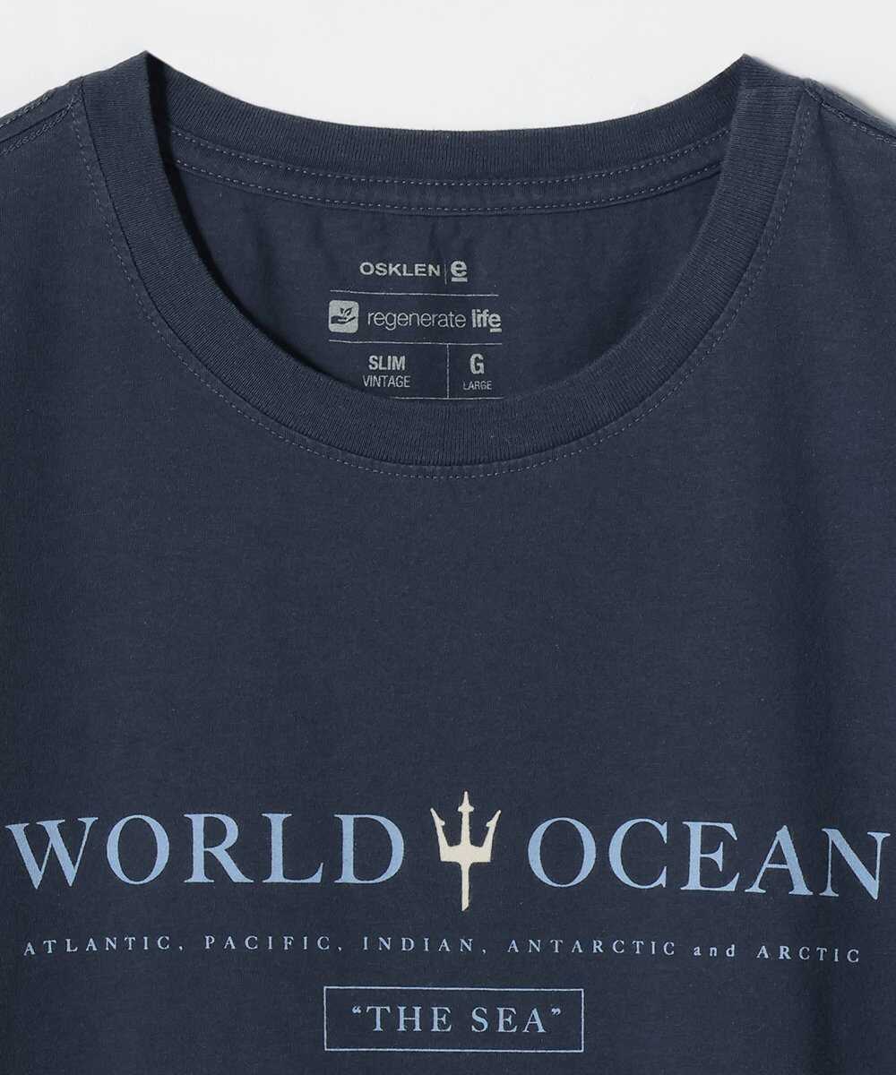 「世界の海」という文字と、海の神ネプチューンが持っているトライデントのマークをプリントしたTシャツ。母なる海、グレートオーシャンへのリスペクトをこめた1着だ。なんといってもその褪せたネイビーが海好きに刺さる仕上がり。