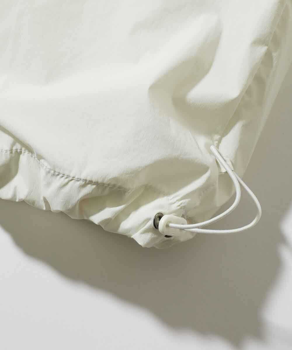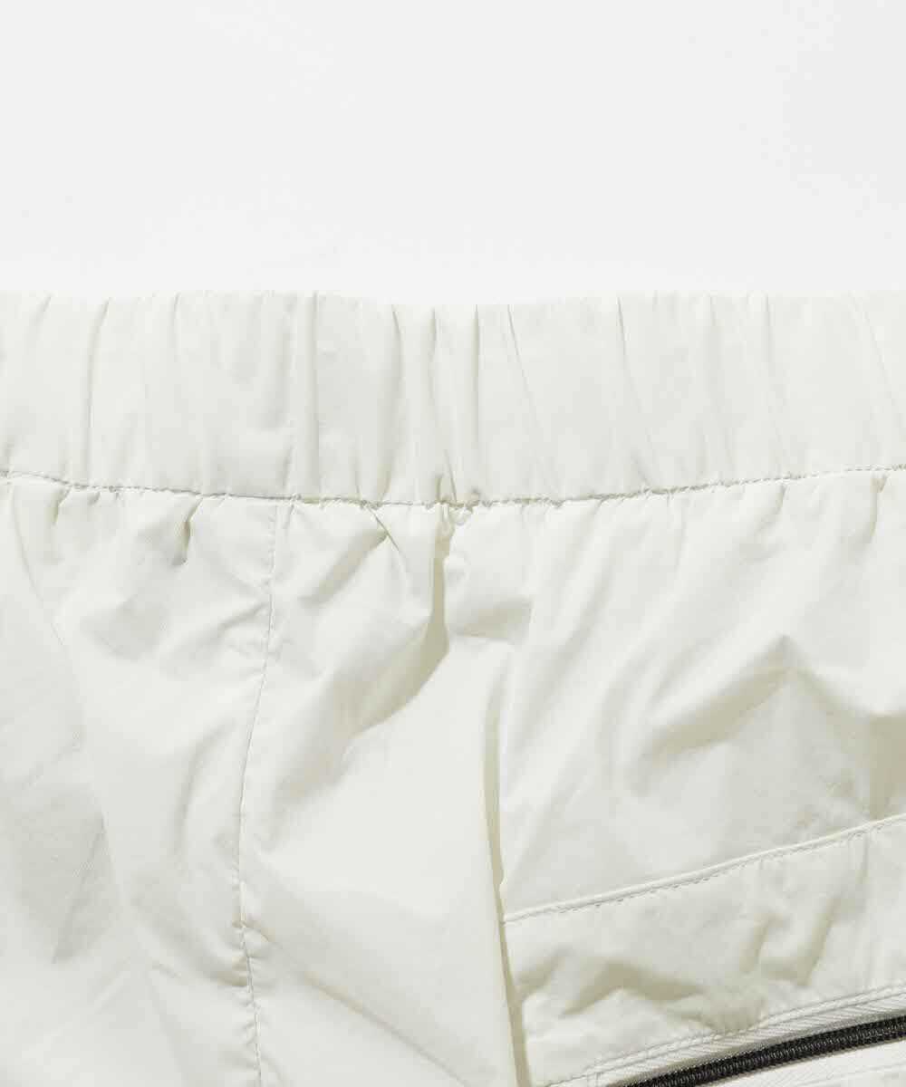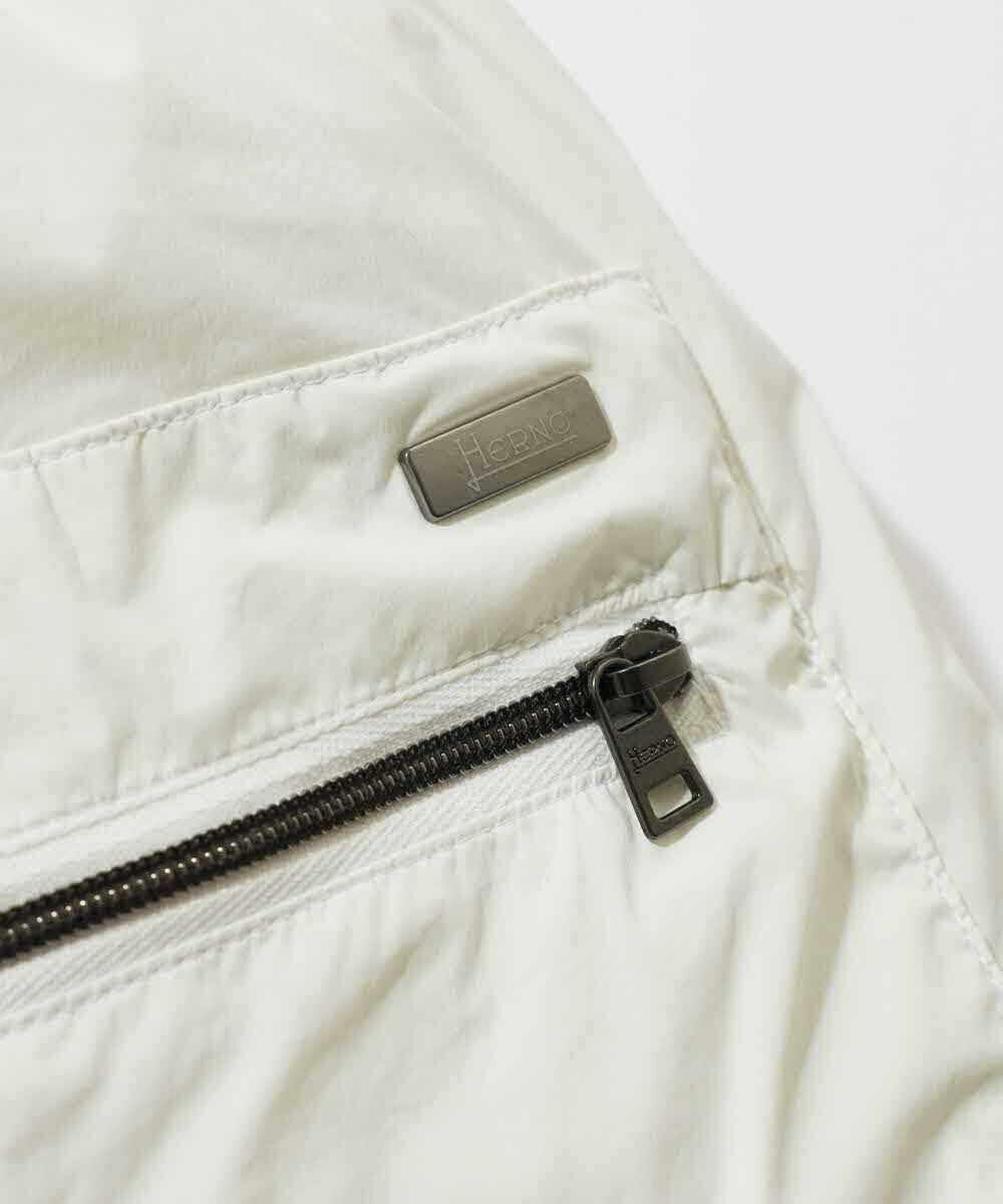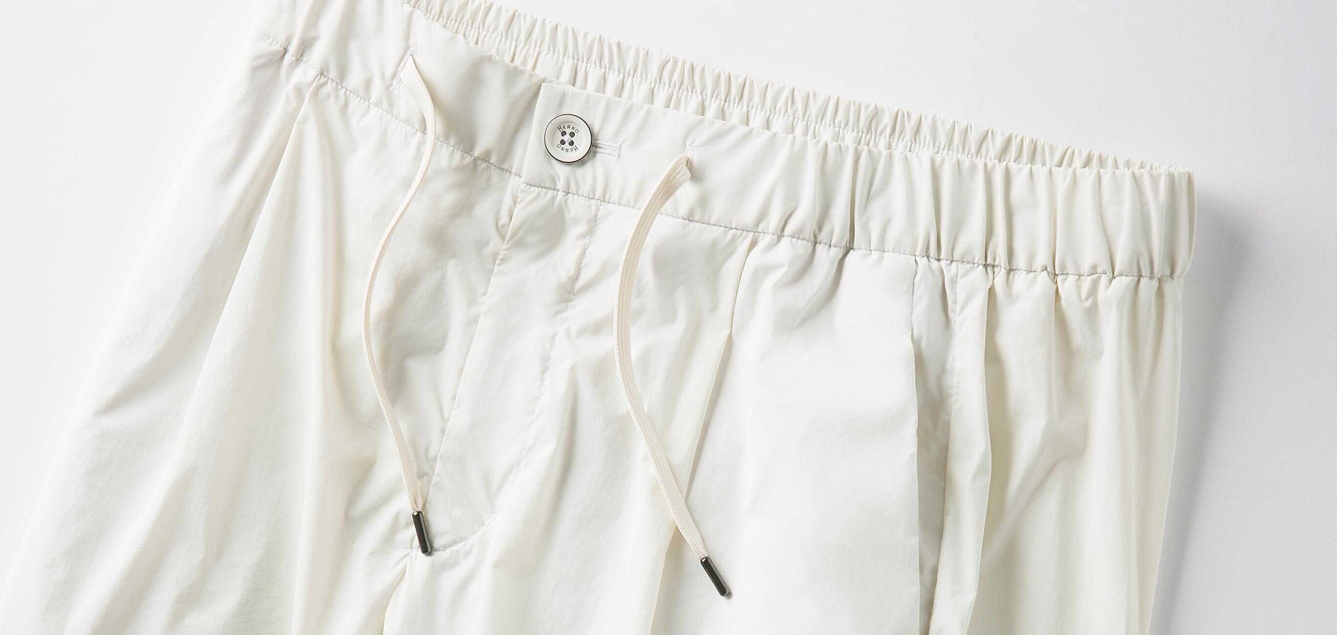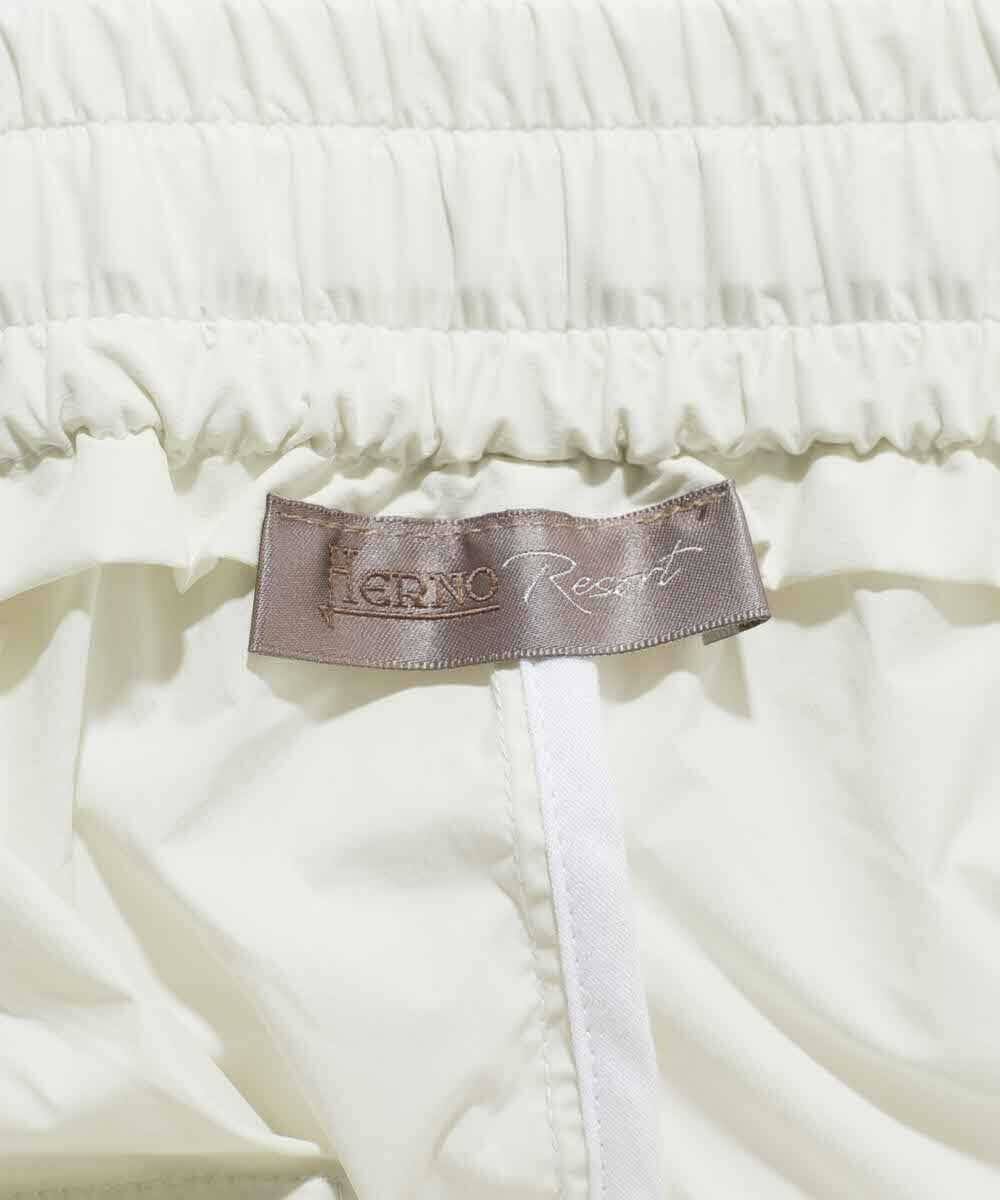 旅をキーワードに、ラグジュアリー&コンフォータブルに特化した"ヘルノ リゾート"コレクションから登場したのがこの白パン。一見普通に見えて並々ならぬこだわりが詰まっている。まず素材。ドライタッチで薄く柔らかい質感のナイロンはありふれた安っぽいものではなく、軽量で柔らか、高級感ある生地感に加え、耐久性のあるナイロン地と光沢を抑えたマットな色味が特徴。バックポケットの中にコンパクトに収納できるパッカブル仕様で、持ち運びにも便利というのもすごい。