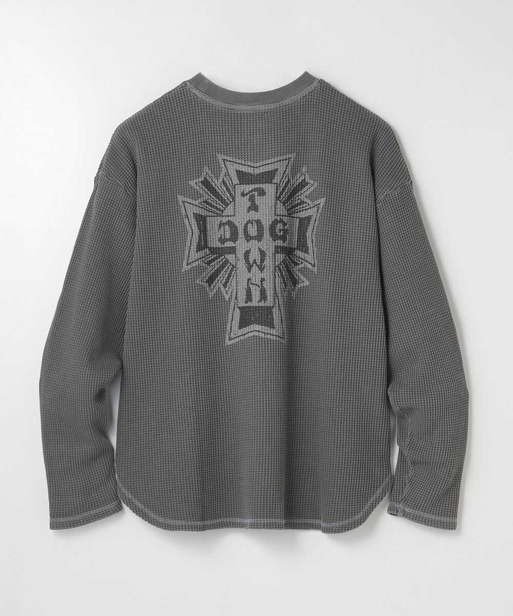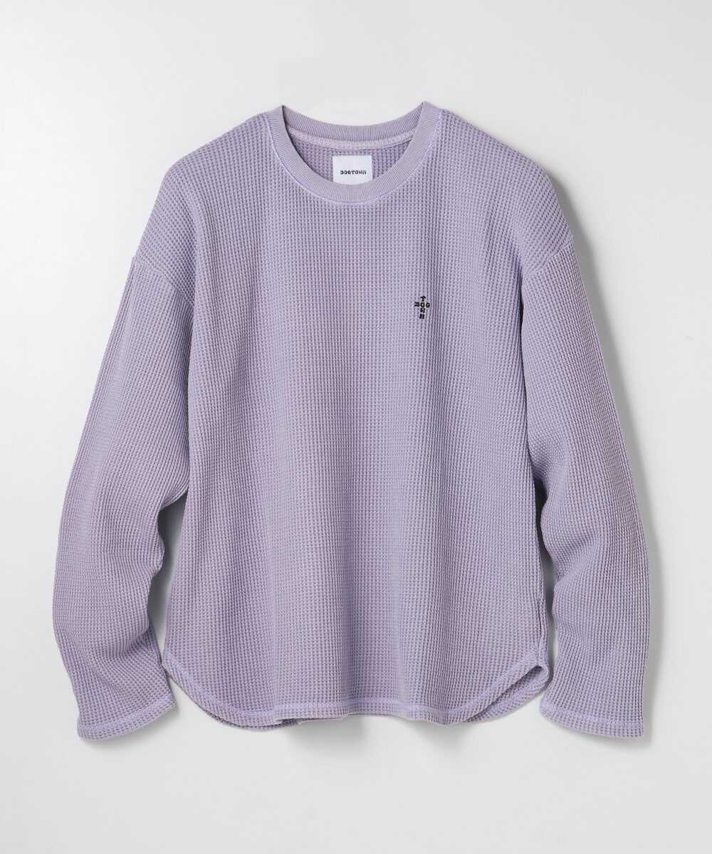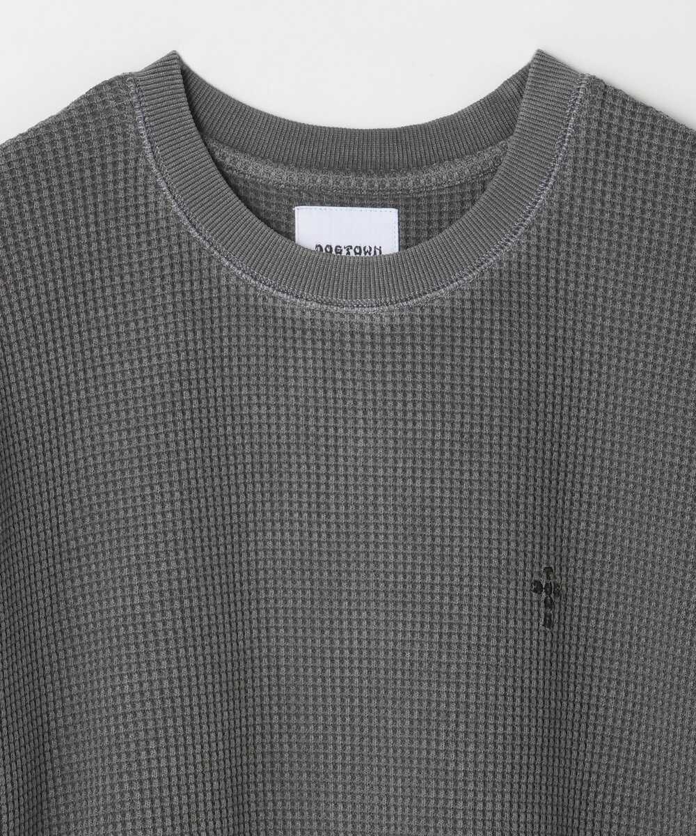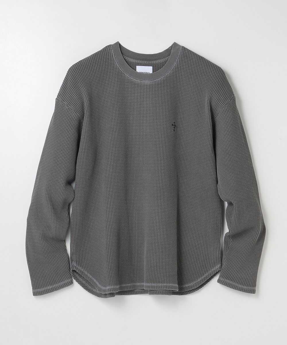 ワッフル生地にピグメント加工を施し、褪せ感ある表情に仕上げたロンT。発色を抑えた見た目なんで大人でも着こなしやすいのが嬉しい。背面には大きくアイコンのクロスをプリント。単色にすることでワッフルに馴染んで落ち着いた印象になっている。