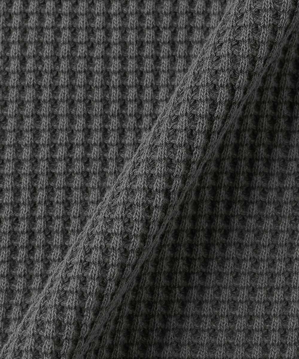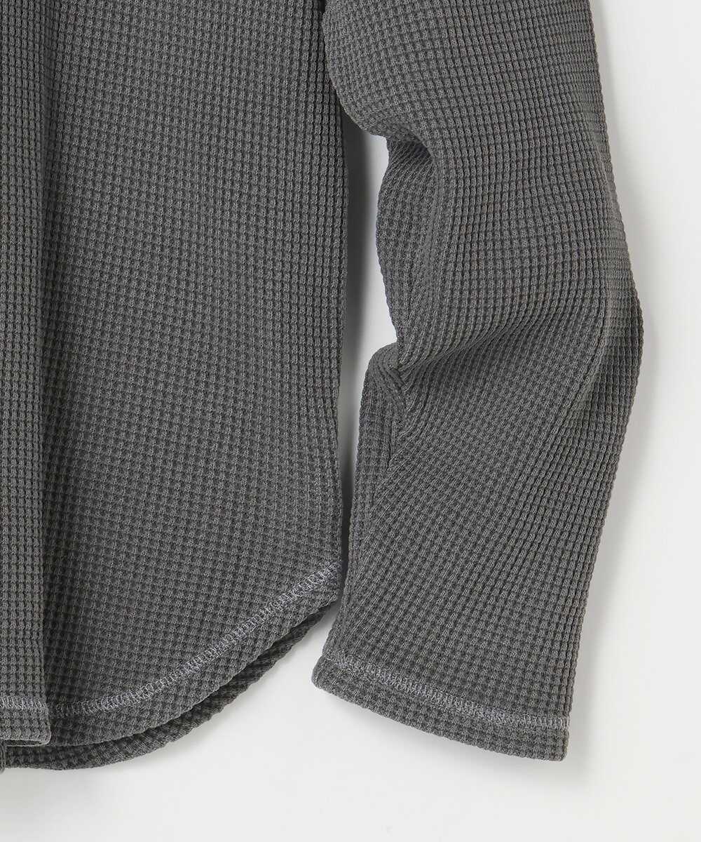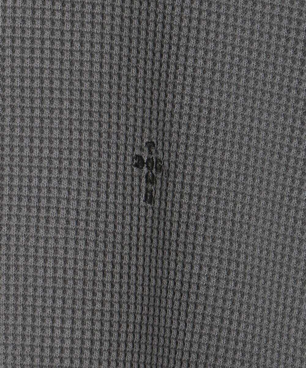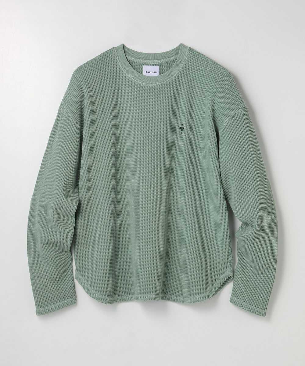 ワッフル生地にピグメント加工を施し、褪せ感ある表情に仕上げたロンT。発色を抑えた見た目なんで大人でも着こなしやすいのが嬉しい。背面には大きくアイコンのクロスをプリント。単色にすることでワッフルに馴染んで落ち着いた印象になっている。