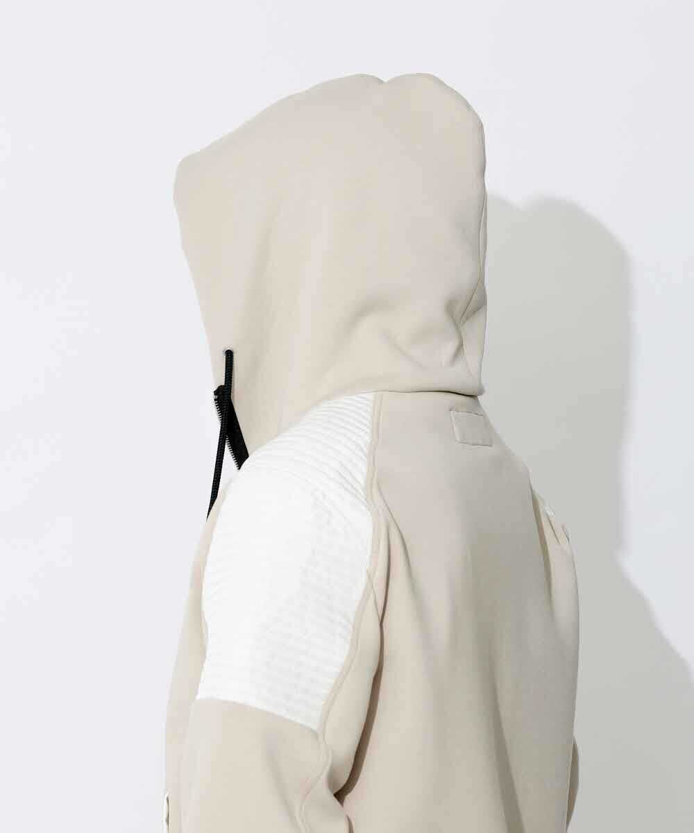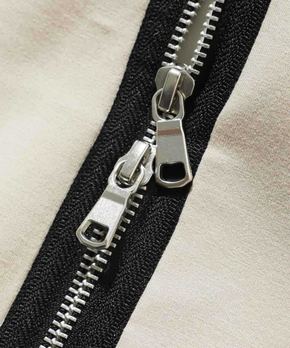 ダラシなく見えない張りのあるダンボールニットを採用し、柔らかなベージュカラーで上質な雰囲気に仕上げたジップパーカ。スウェット生地と違い、羽織ものとして見栄えする1着になっており、さりげないバイカーモチーフがちょうどよい塩梅のアクセントに。ダブルジップでニュアンスも自由自在。