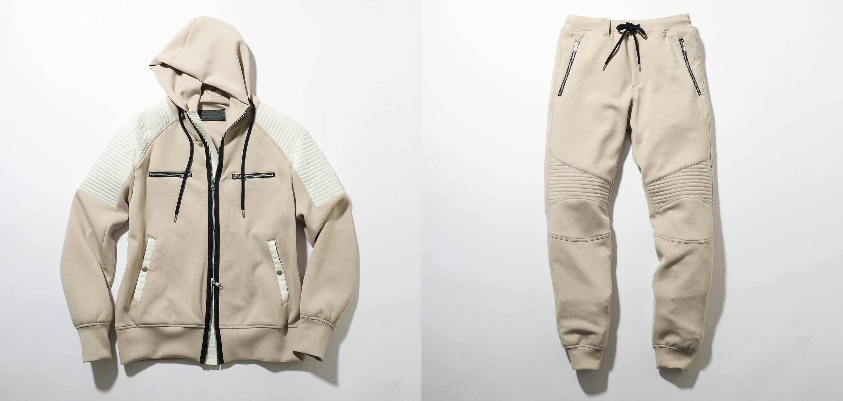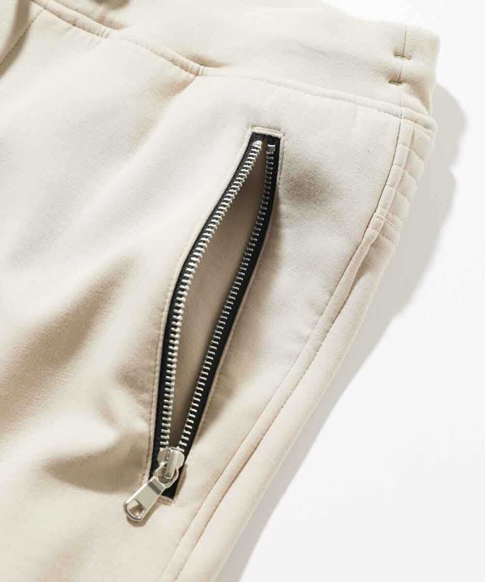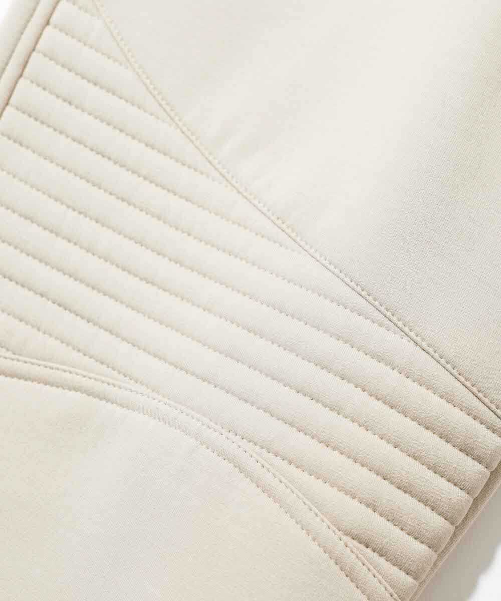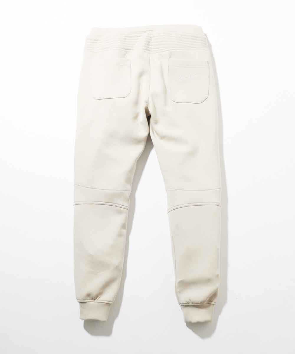 スッキリとしたシルエットに、パーカと同じ素材を取り入れ、膝まわりにバイカーアクセントを加えたジョガーパンツ。デザイン性に富んでいるためいわゆるスポーティな1本とは一線を画す仕上がりになっているのが嬉しい。