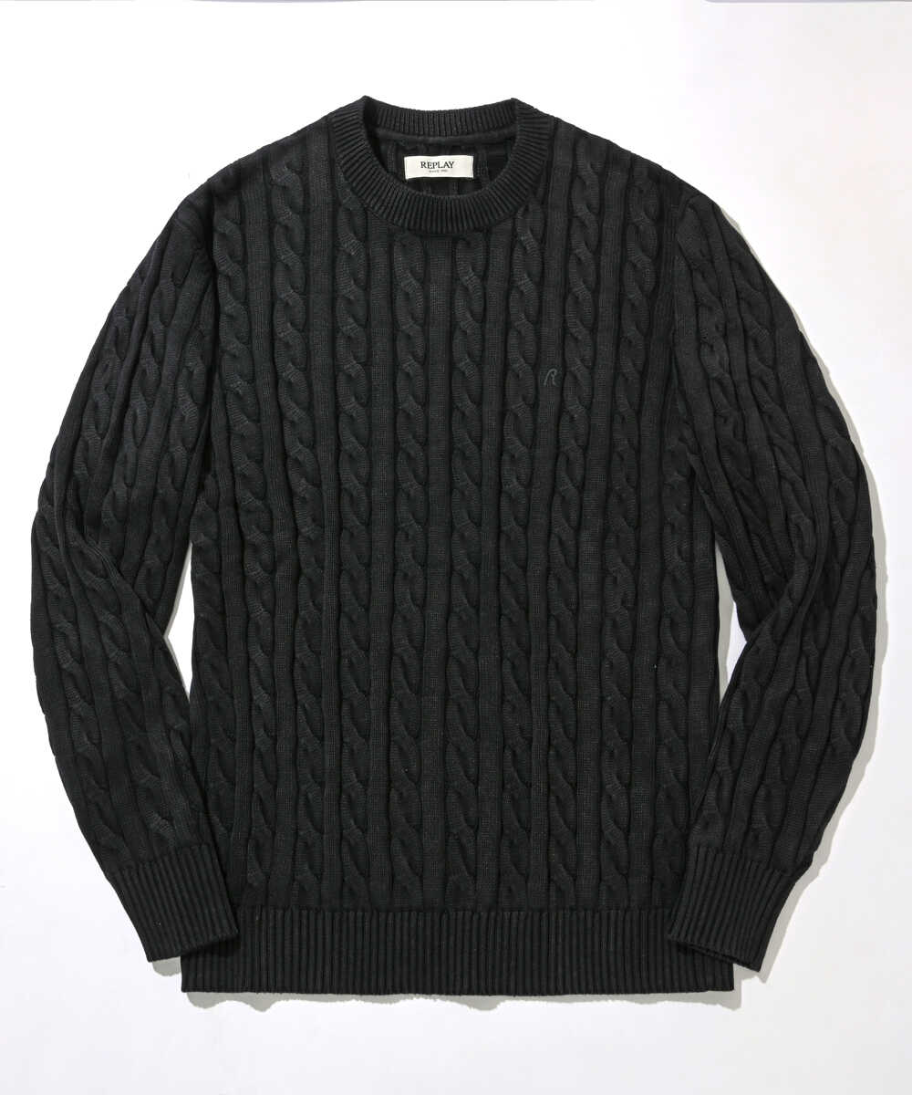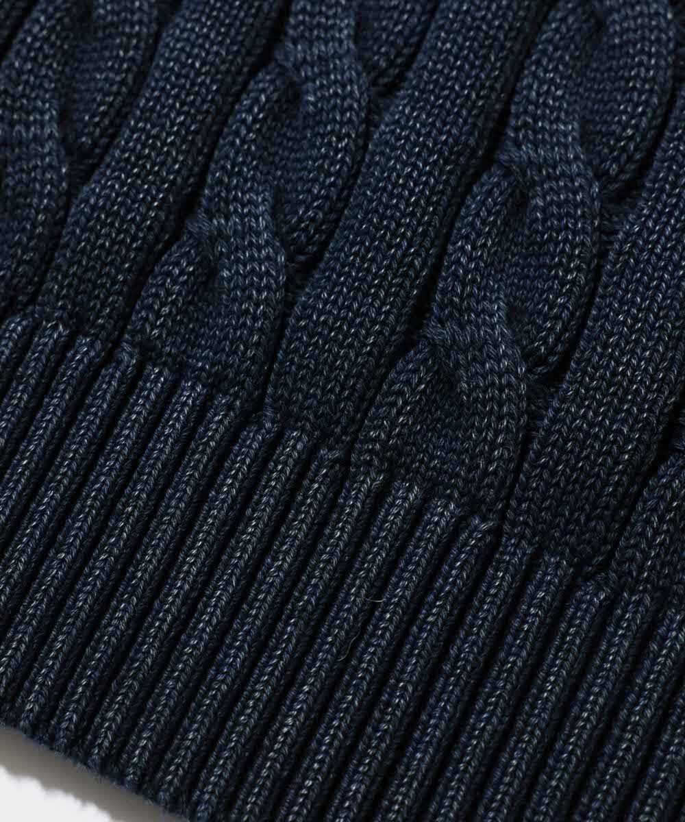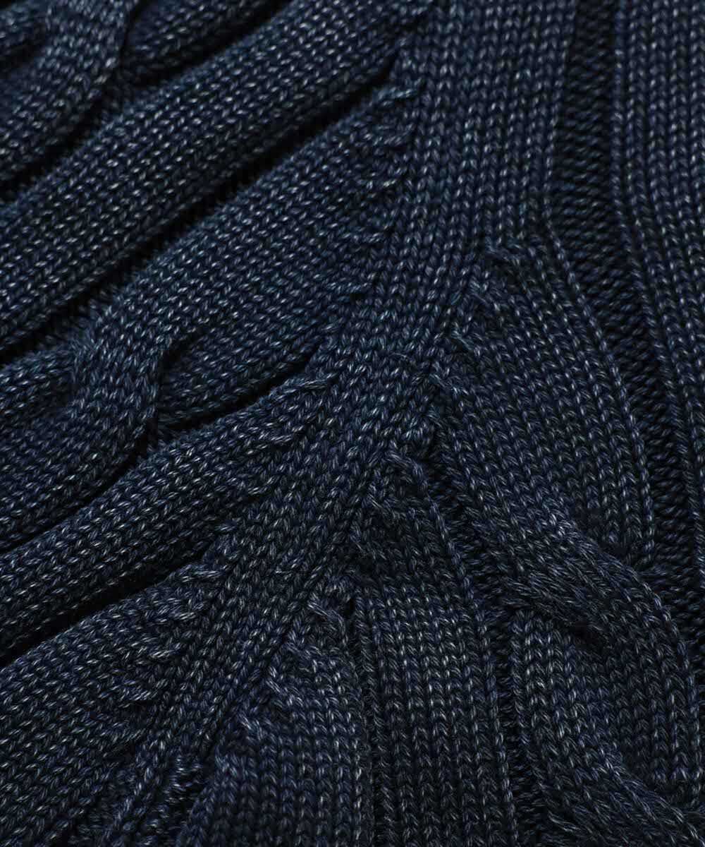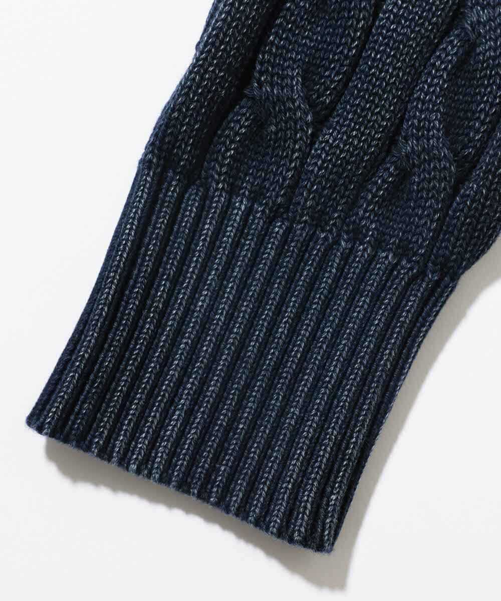 一見、シンプルなケーブルニットと思いきや、ガーメントダイによってケーブルニットに見事な褪せ感を表現した1枚。お利口さんになりがちなケーブル編みを、染め加工で抜け感あふれる仕上がりにした優秀作。