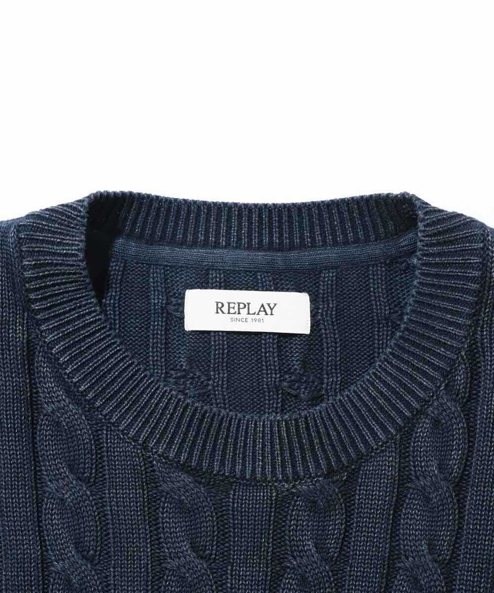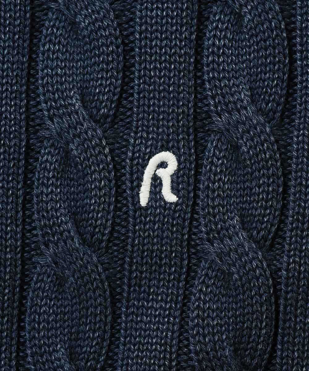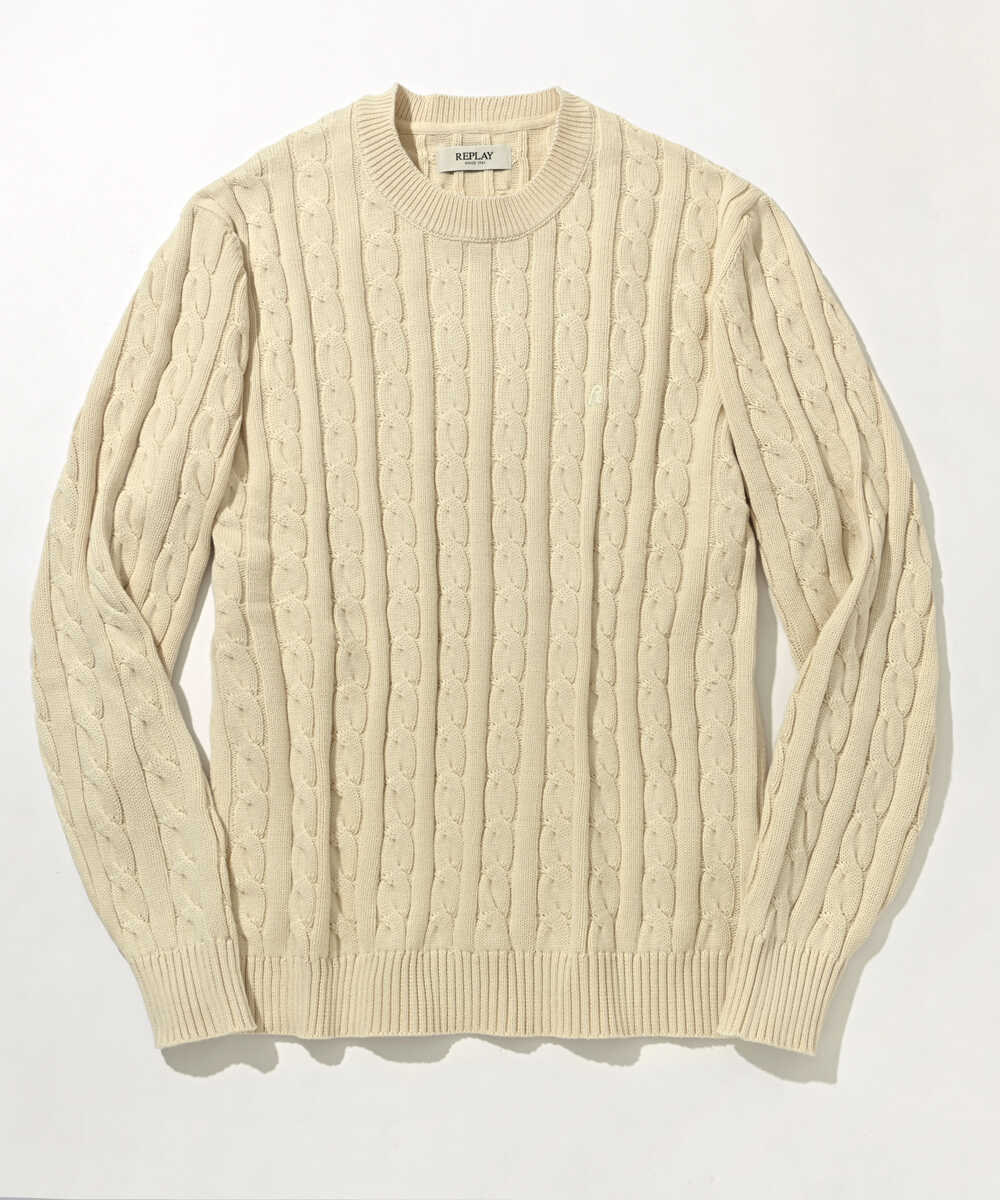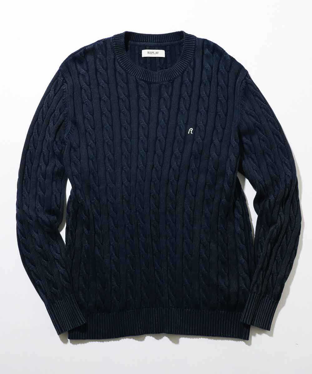 一見、シンプルなケーブルニットと思いきや、ガーメントダイによってケーブルニットに見事な褪せ感を表現した1枚。お利口さんになりがちなケーブル編みを、染め加工で抜け感あふれる仕上がりにした優秀作。