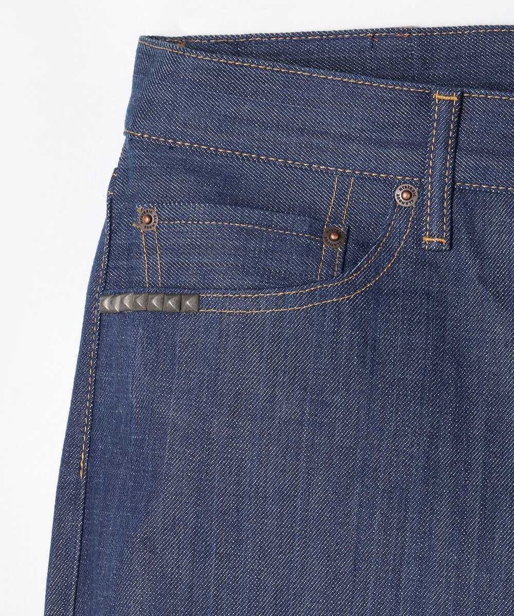 そんなデニムジャケットの対になるボトムは、古きよき仕様にこだわり、1960年代のデザインを再現した代物。潔いストレートシルエットで、同じく徳島の伝統的な阿波正藍染めを施した生地の美しさが映える。一見、普通のデニムに見えて履くとまったく普通に見えない1本だ。