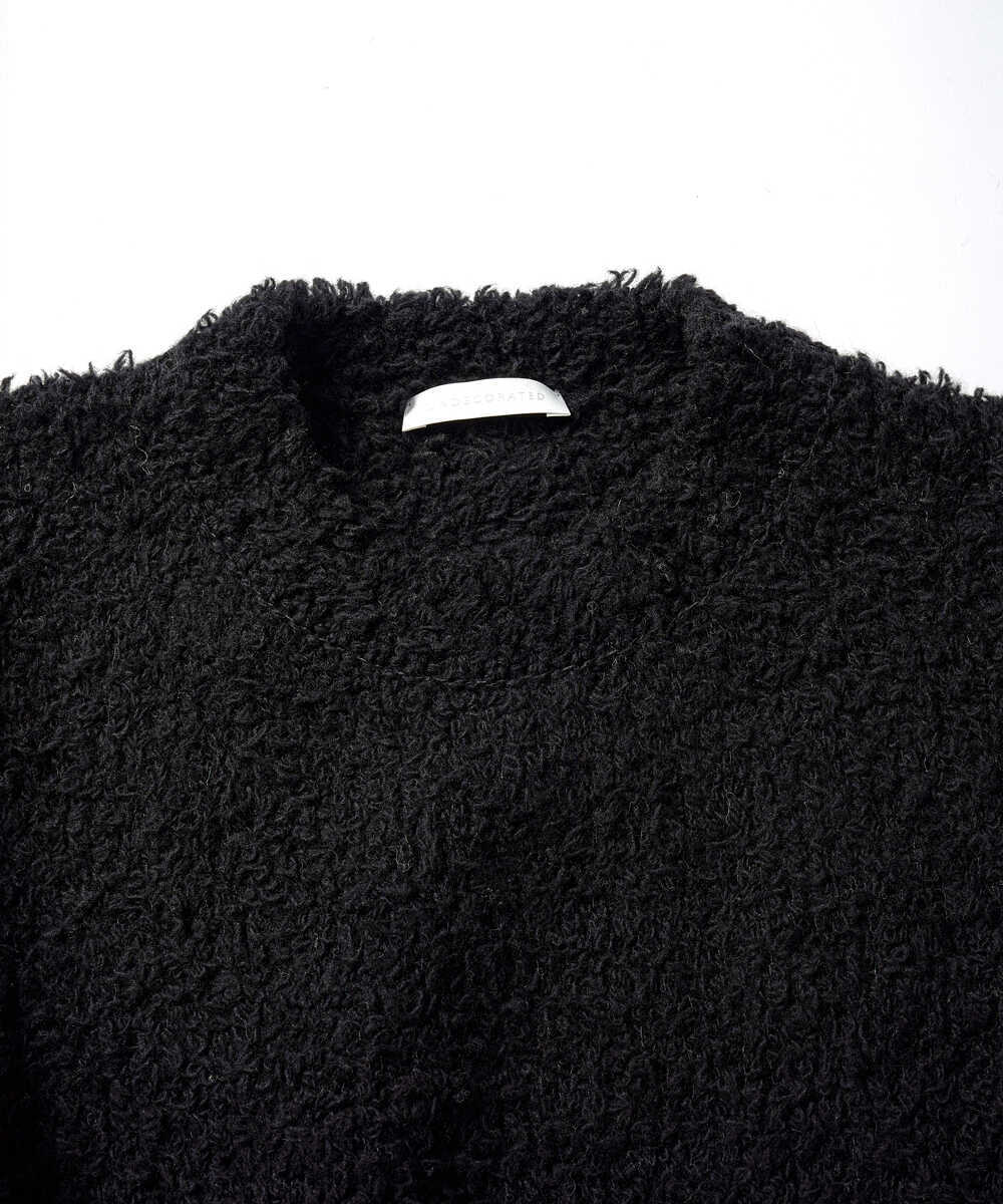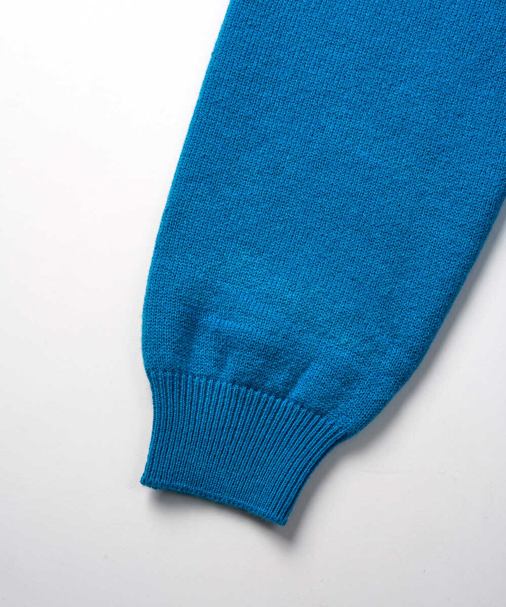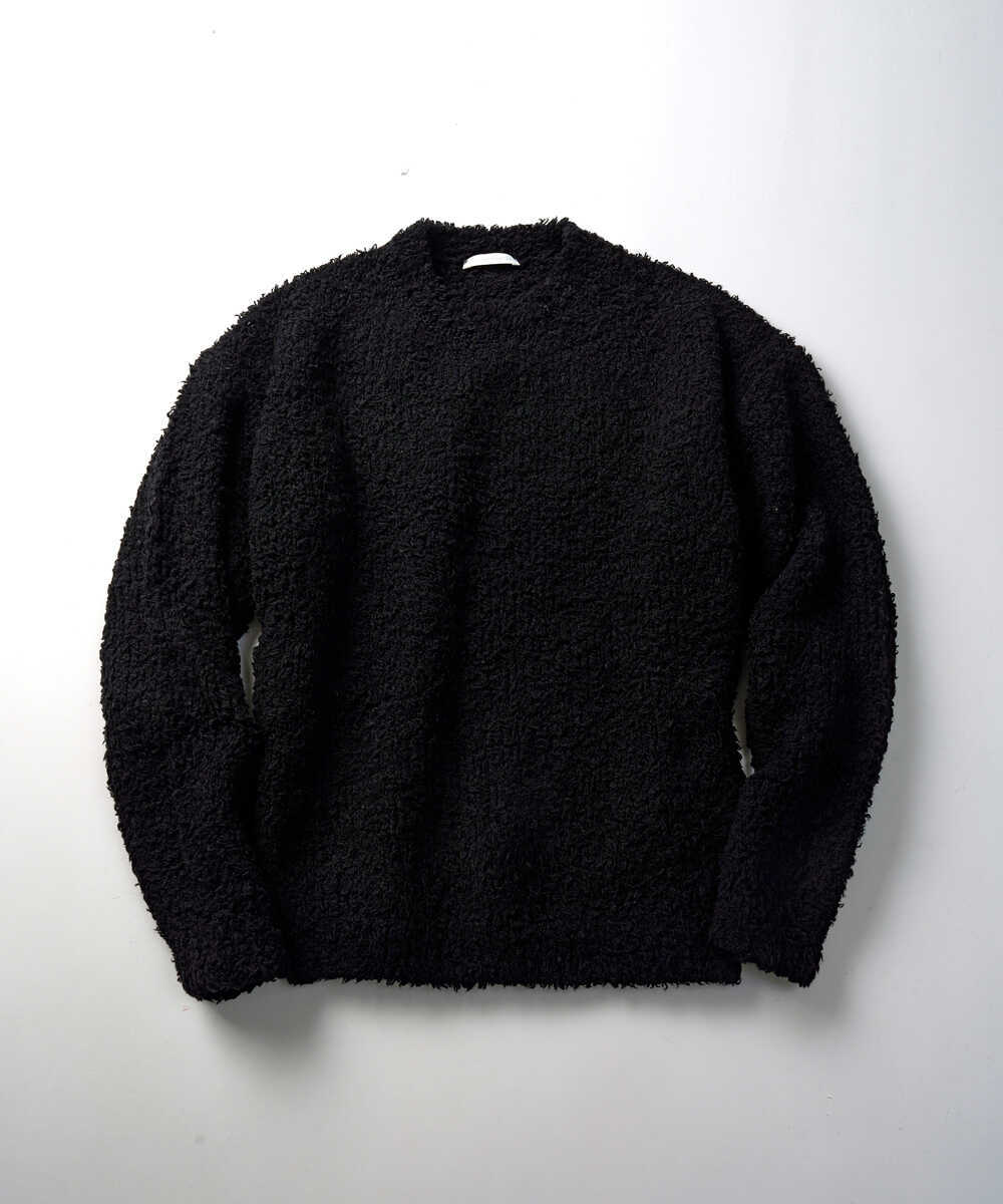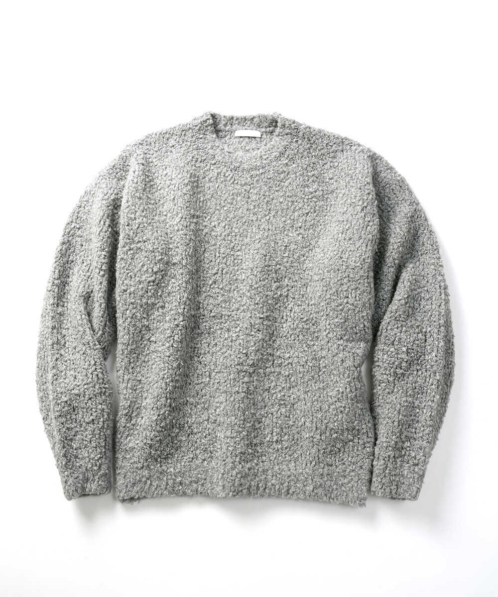 ベーシックながら、そのファーのような生地感でさりげなく主張もできるのがこのニット。厳選されたラムウールの細い糸を膨らませ太糸にすることで、通常の太い糸に比べて中に空気がこもっている分、軽く、暖かいのが特徴。生地作りから丁寧に行うブランドだからこそ作られた1枚だ。