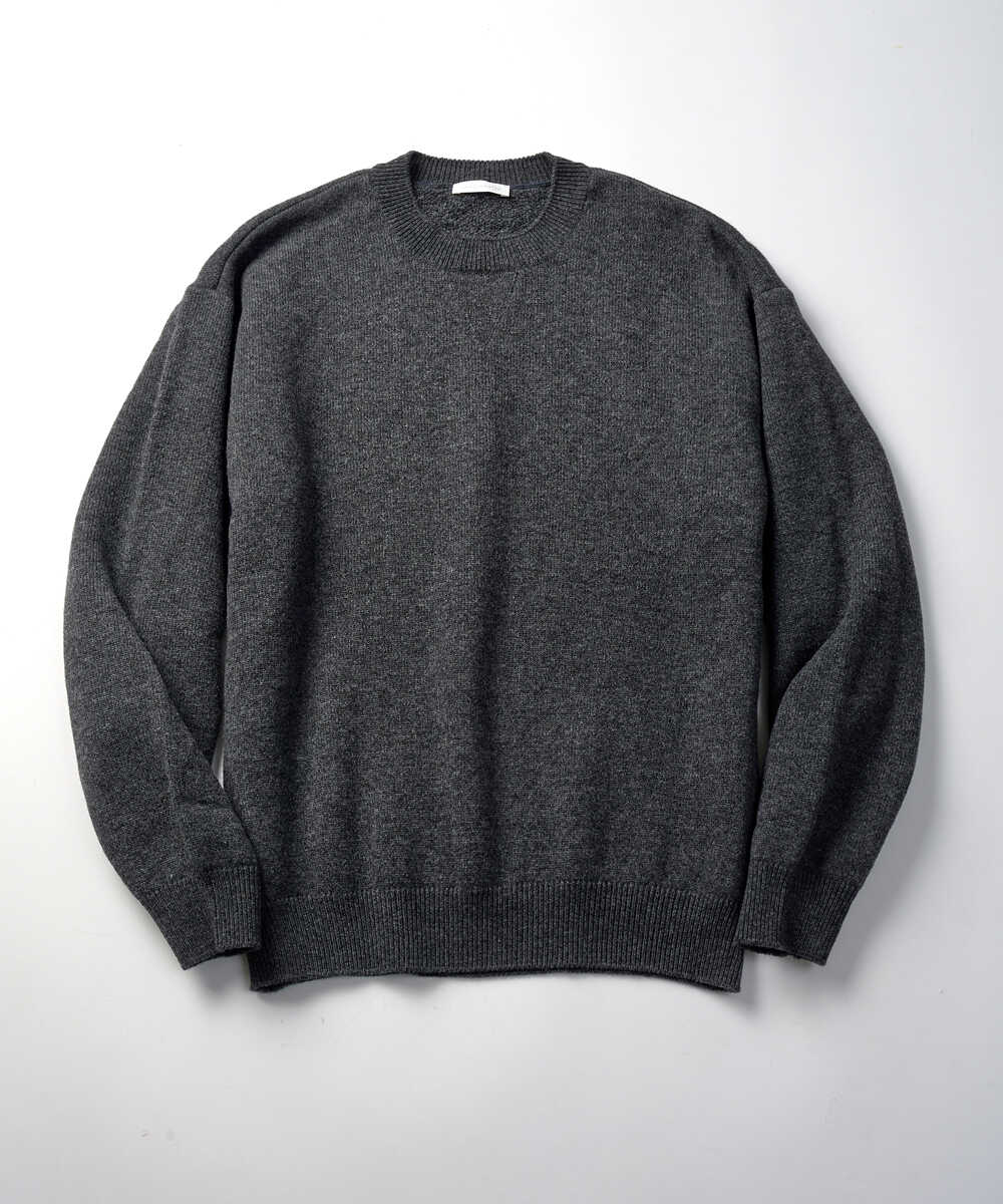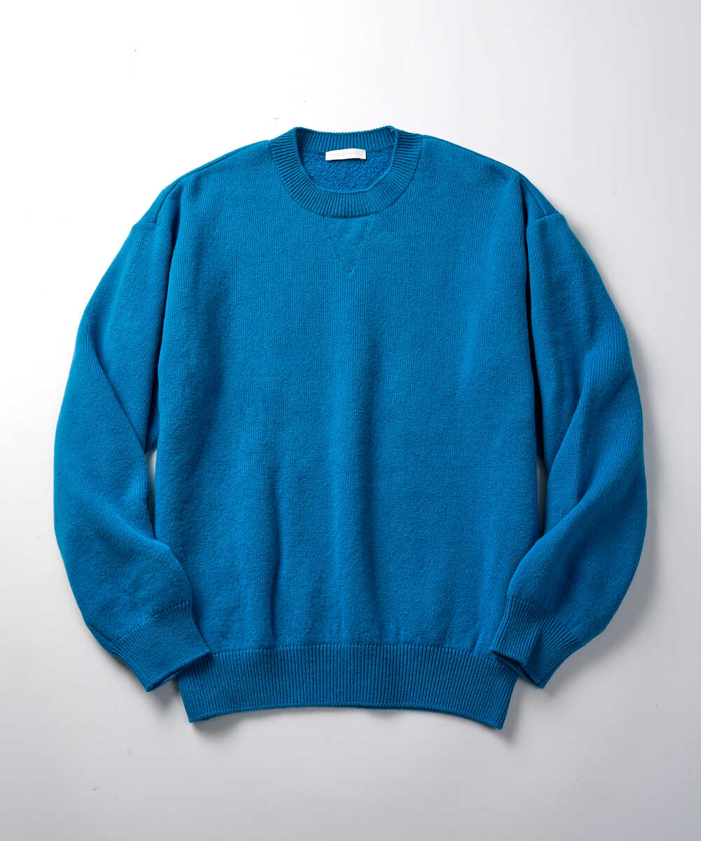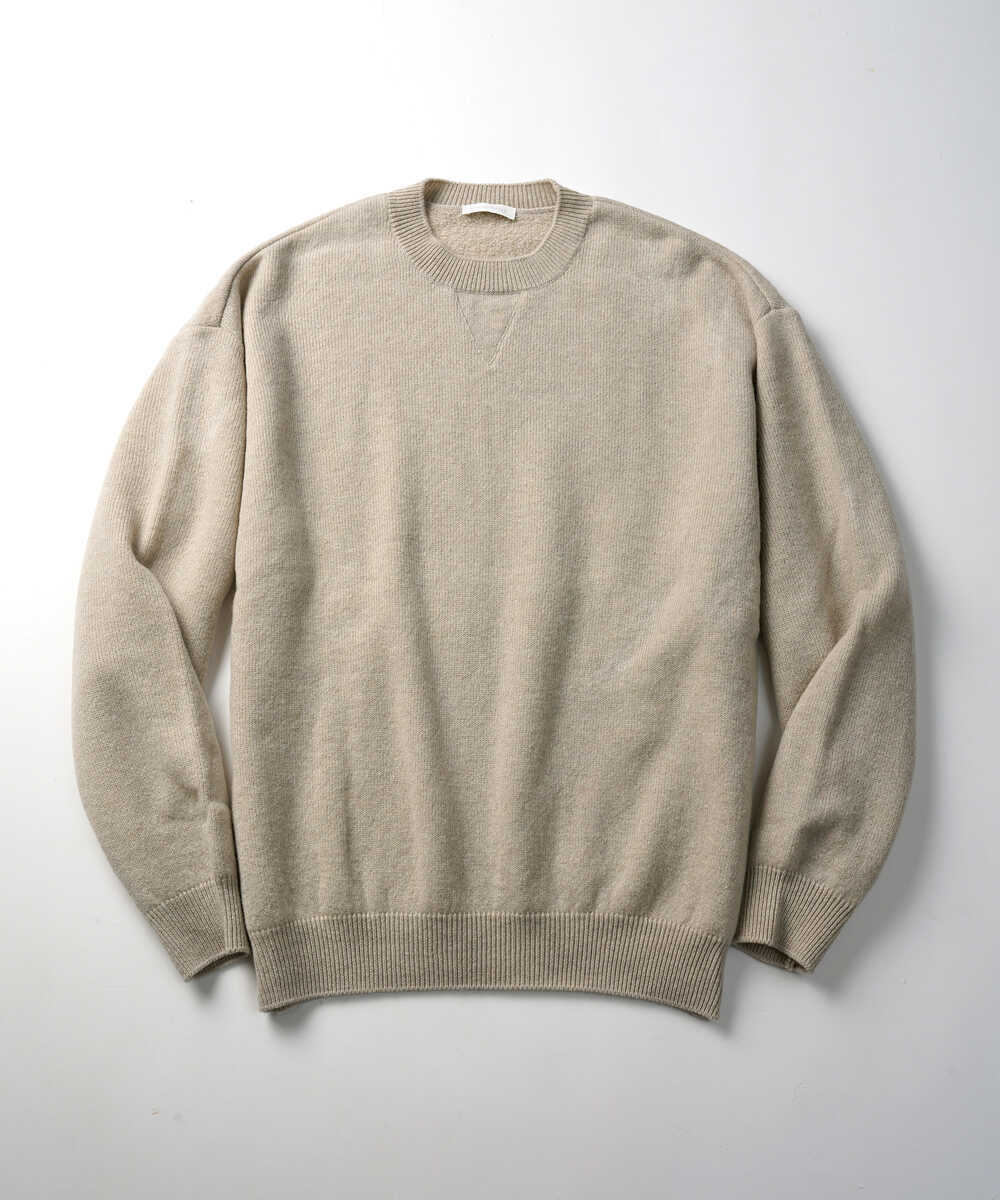 先ほどのジップニットと同じ、裏面パイルの生地をクルーネックニットに仕立てたのがこちら。普通のようで普通じゃない仕上がりは、これ見よがしにならない大人の余裕に繋がること間違いなし。ふんわりとした独特の着心地を是非味わってほしい。