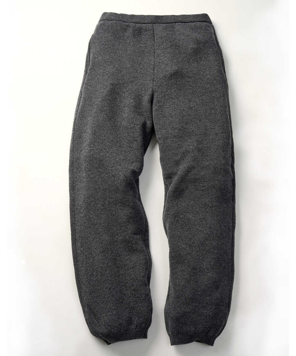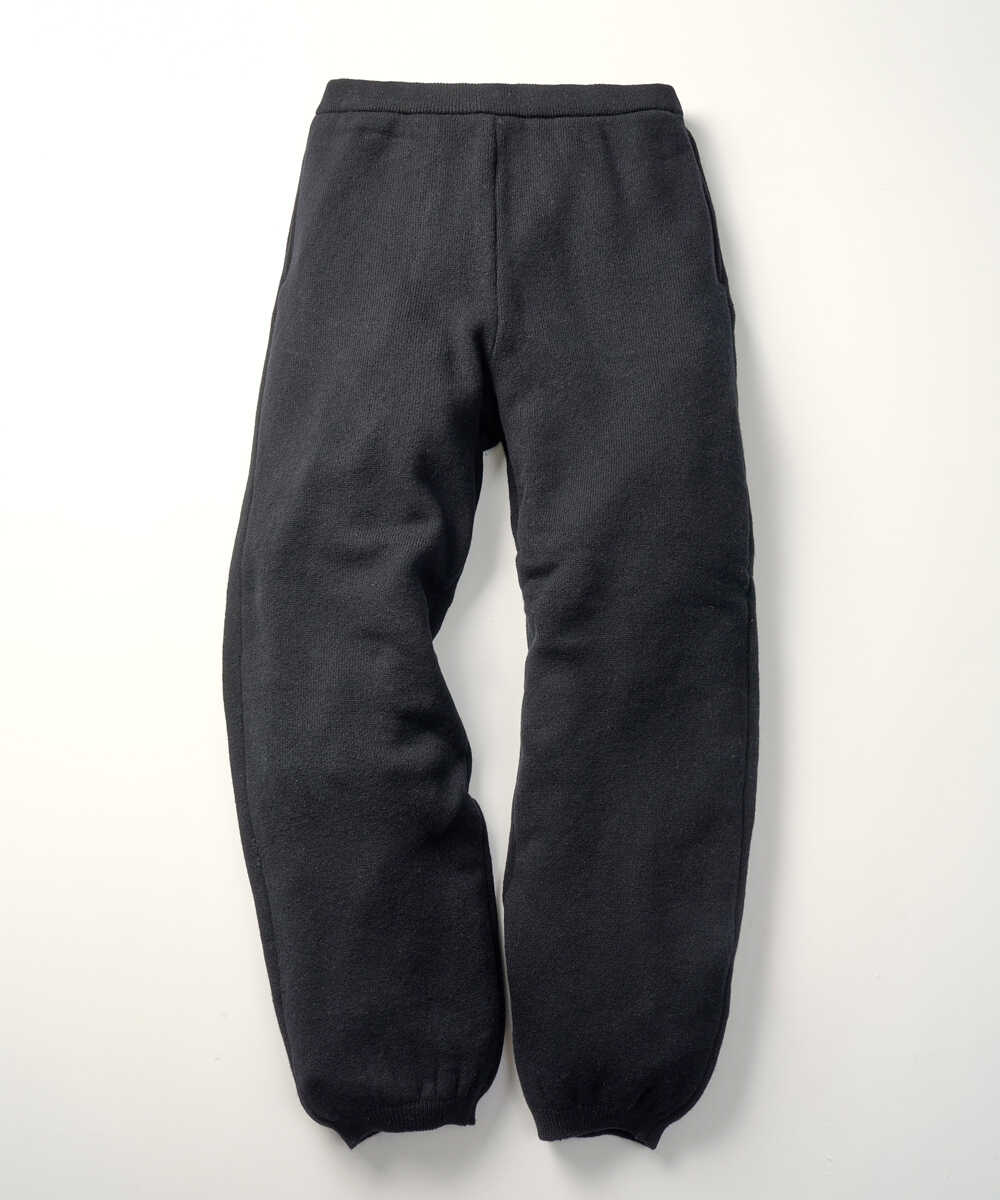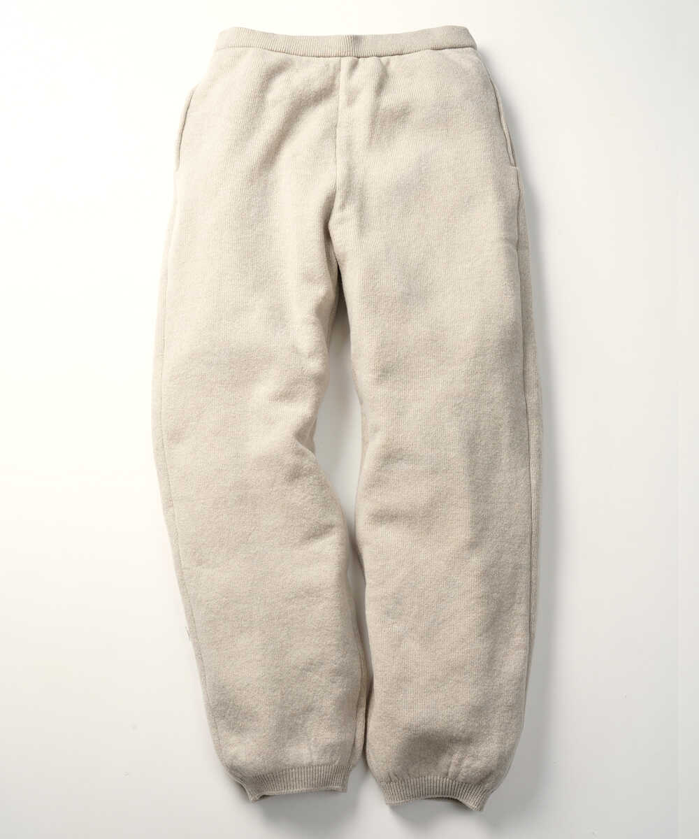 先ほどの生地を大胆にボトムで仕立てたニットパンツがこちら。スウェットパンツのような抜け感に加えて、上質さを醸し出すことができる大人のための1本だ。カシミヤの様な上質なふくらみ感や軽量感のある仕上がりは、チルアウトに最適では?