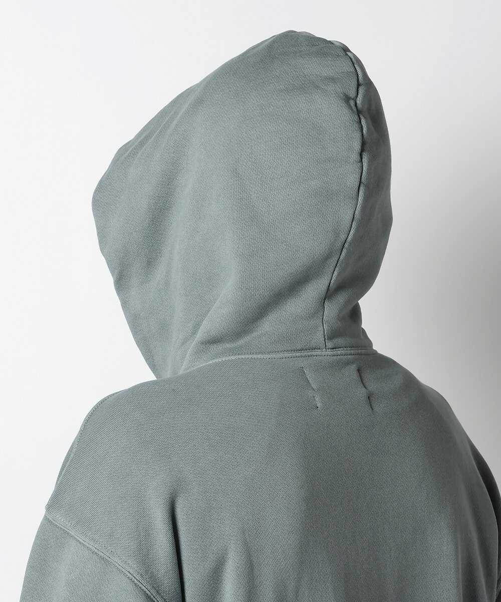 高級感を演出するためにゴールドの鳩目を採用。そしてドローコードはあえて省き、首まわりをすっきりした印象に! 洗い加工を何度もかけた裏起毛はふっくらとして心地よさ抜群だ。