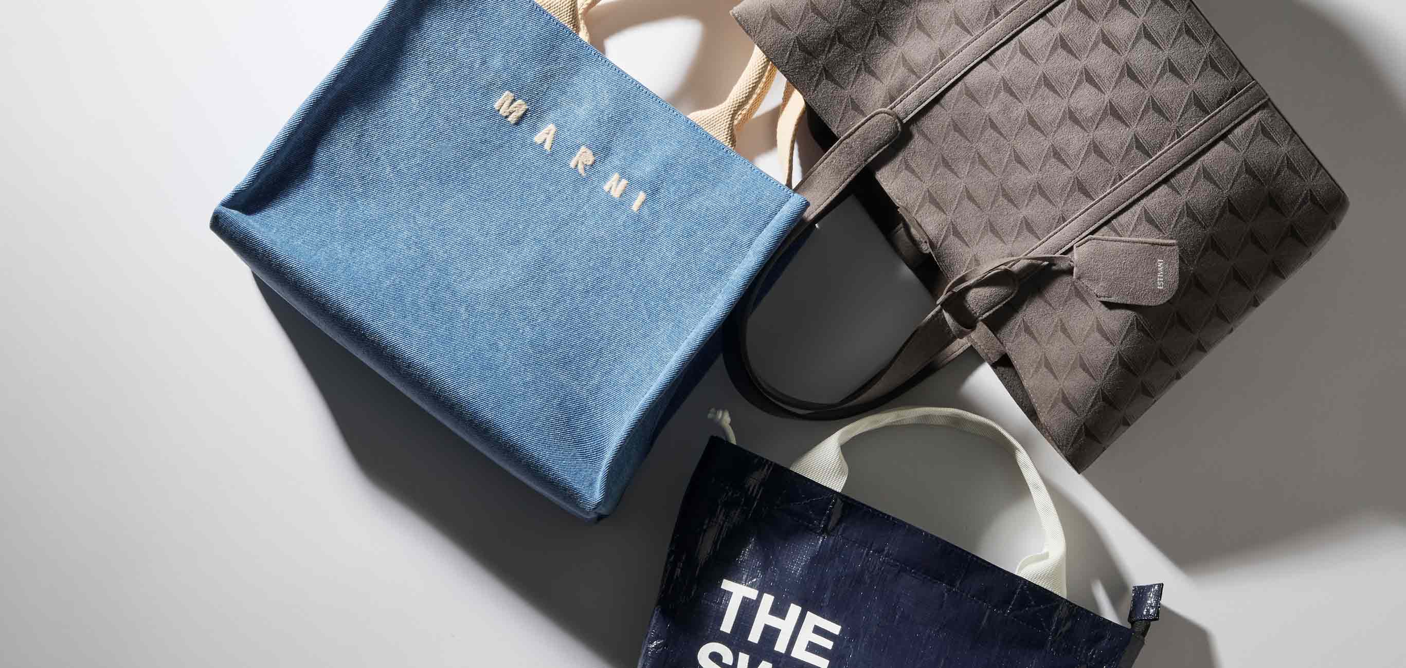 ブランドで人気の形に新作としてライトウォッシュのデニム生地を使用した〈マルニ〉のトート。ご覧のとおり肩掛けと手持ちのストラップがあり、2WAYで使えるのがポイント。ラフさはありつつもそこはハイブランド。丁寧なロゴ刺繍や作りのよさに惚れ惚れすること請け合い。