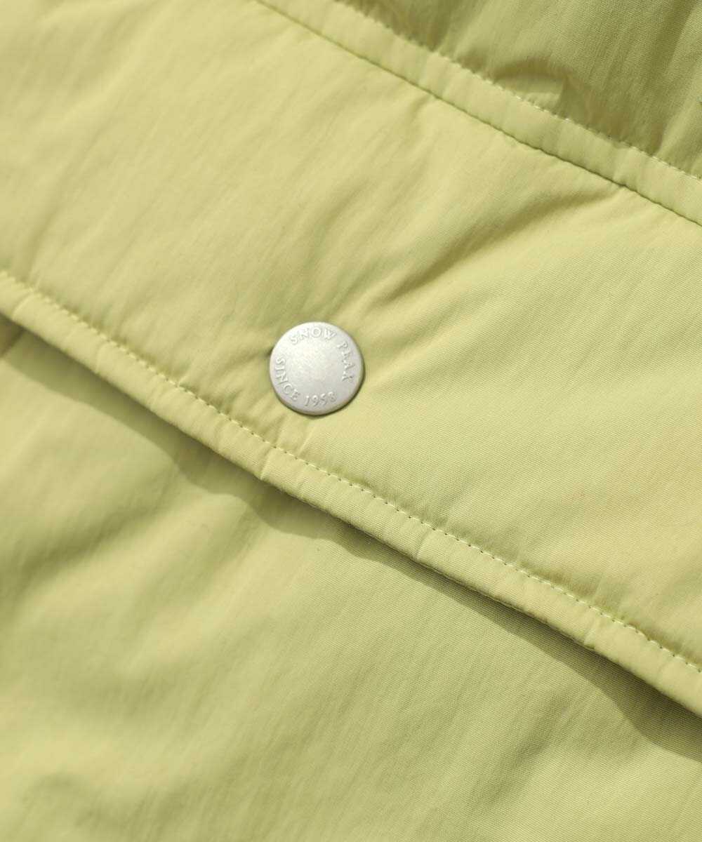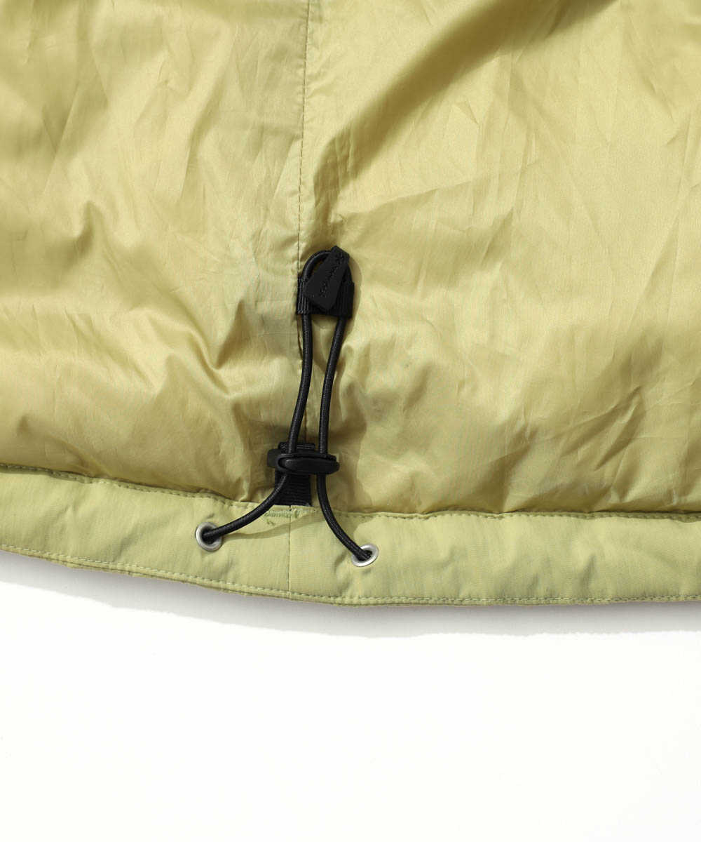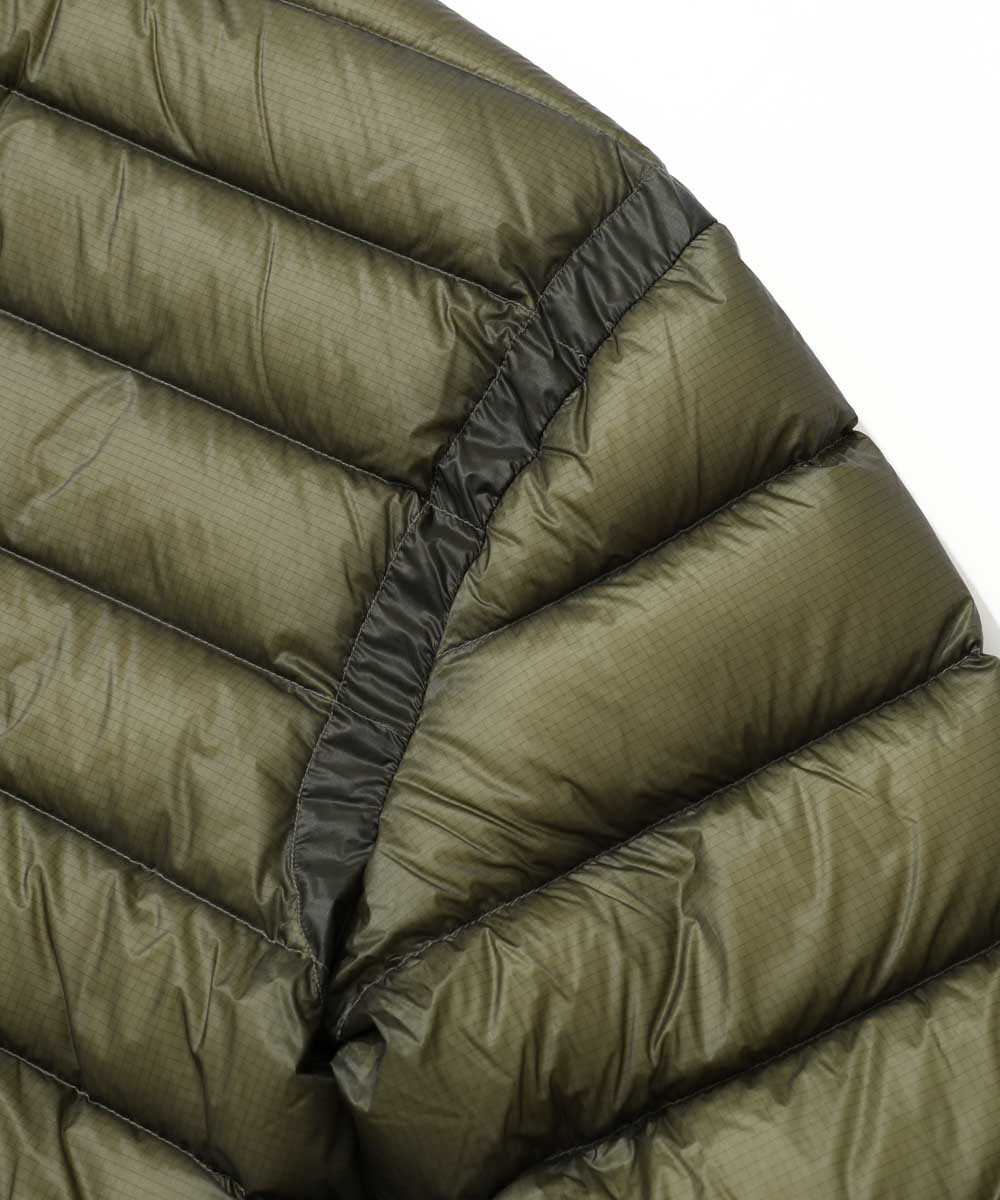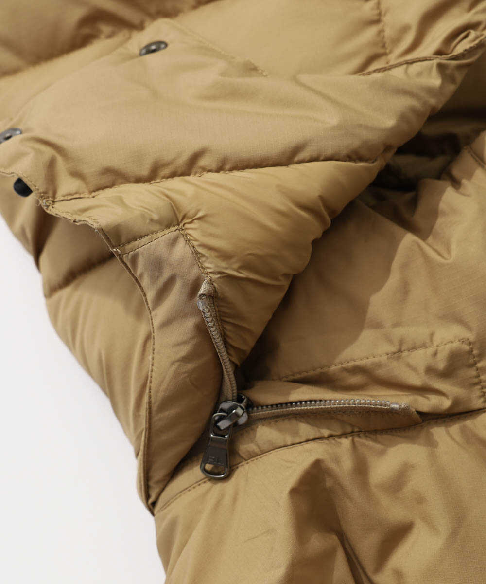 リサイクルナイロンを使用した軽量タフタ素材をベースに、製品染め加工を施したヴィンテージテイストが魅力のダウン。ナイロンならではの軽量性、形態安定性があり、様々なシーンで着やすい。Lサイズで約762g程度の重さなので着用時に動きやすく、前立てや袖口など冷気を通しにくい仕様により、しっかりと保温してくれる。