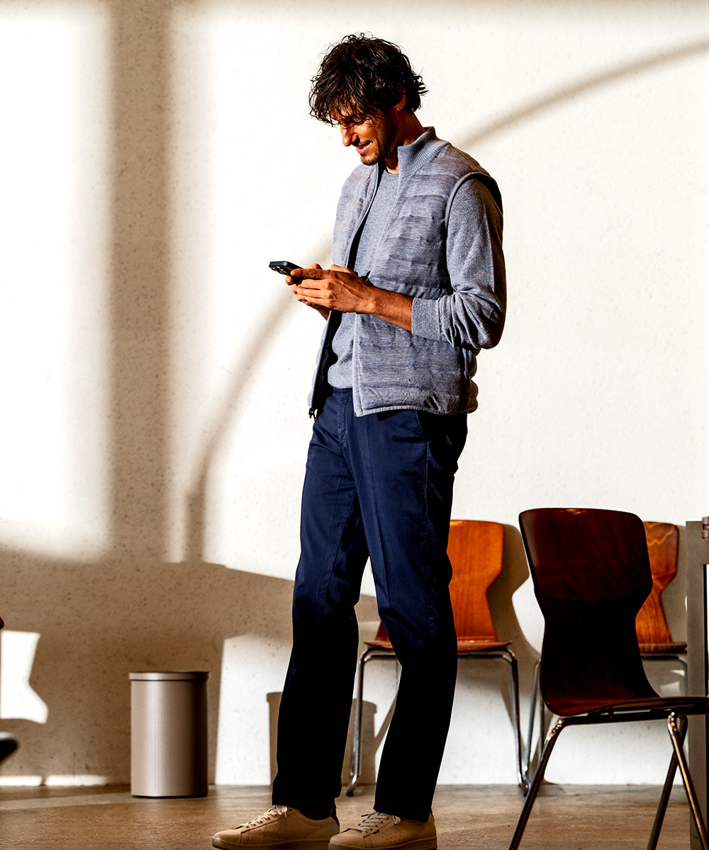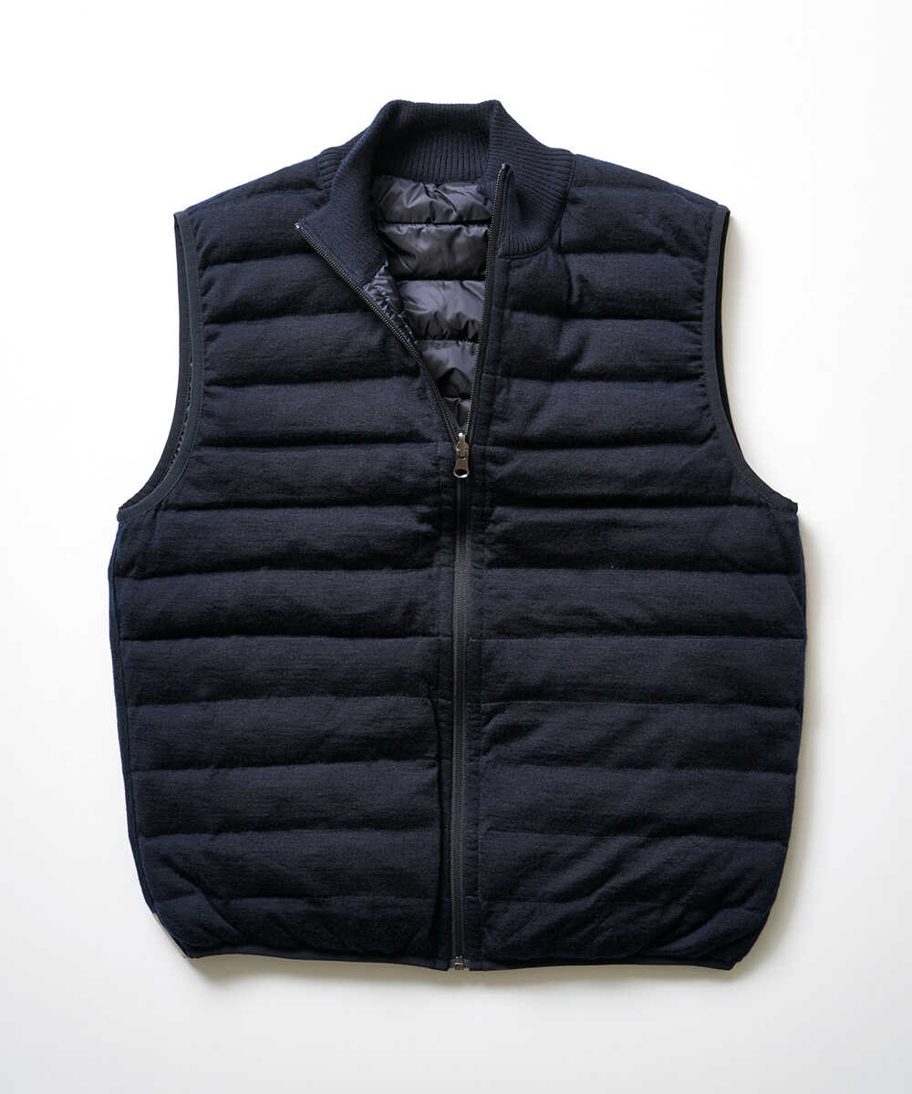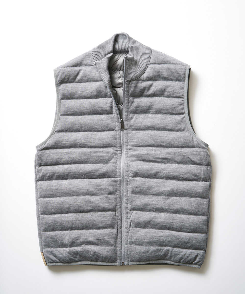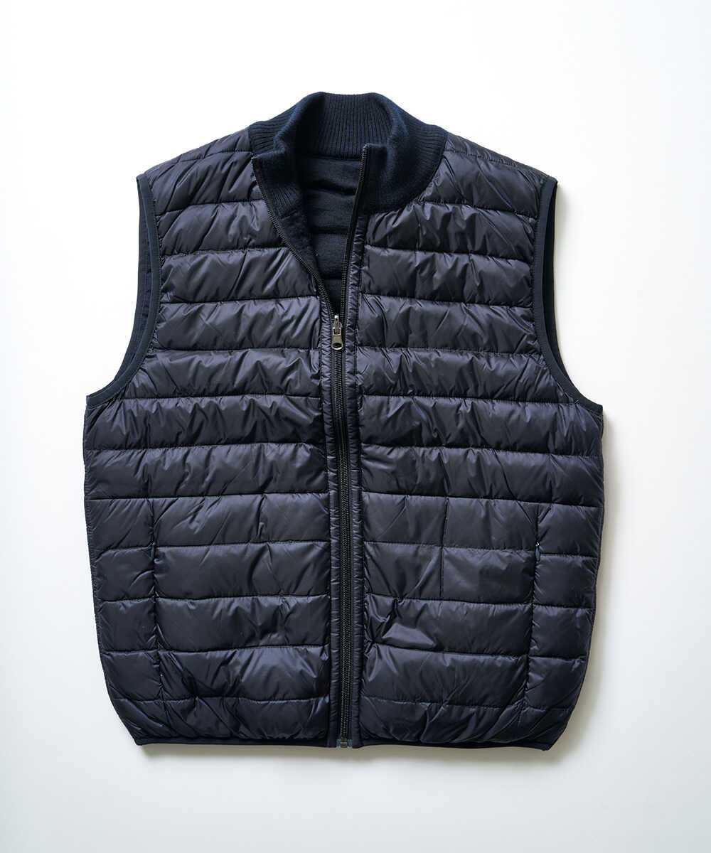 表と裏が同色でありながら、カシミヤとナイロンという違った素材で作られたリバーシブルベスト。極上の肌触りとシャカシャカしたタッチ。ひとつのアイテムで、まるで異なる素材感を2通り楽しめる。スポーティな着こなしではナイロン面を使えばいいし、大人の上品カジュアルならカシミヤを前面に。1枚でここまで違った着こなしに対応してくれるのはありがたい。アウターとしてだけでなく、真冬にはインナーダウンとしても活躍してくれる。