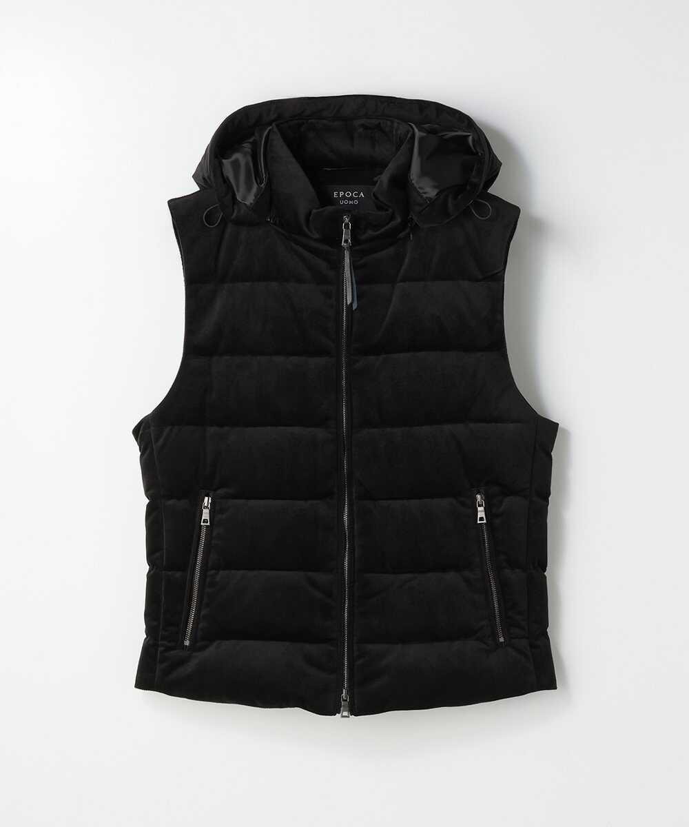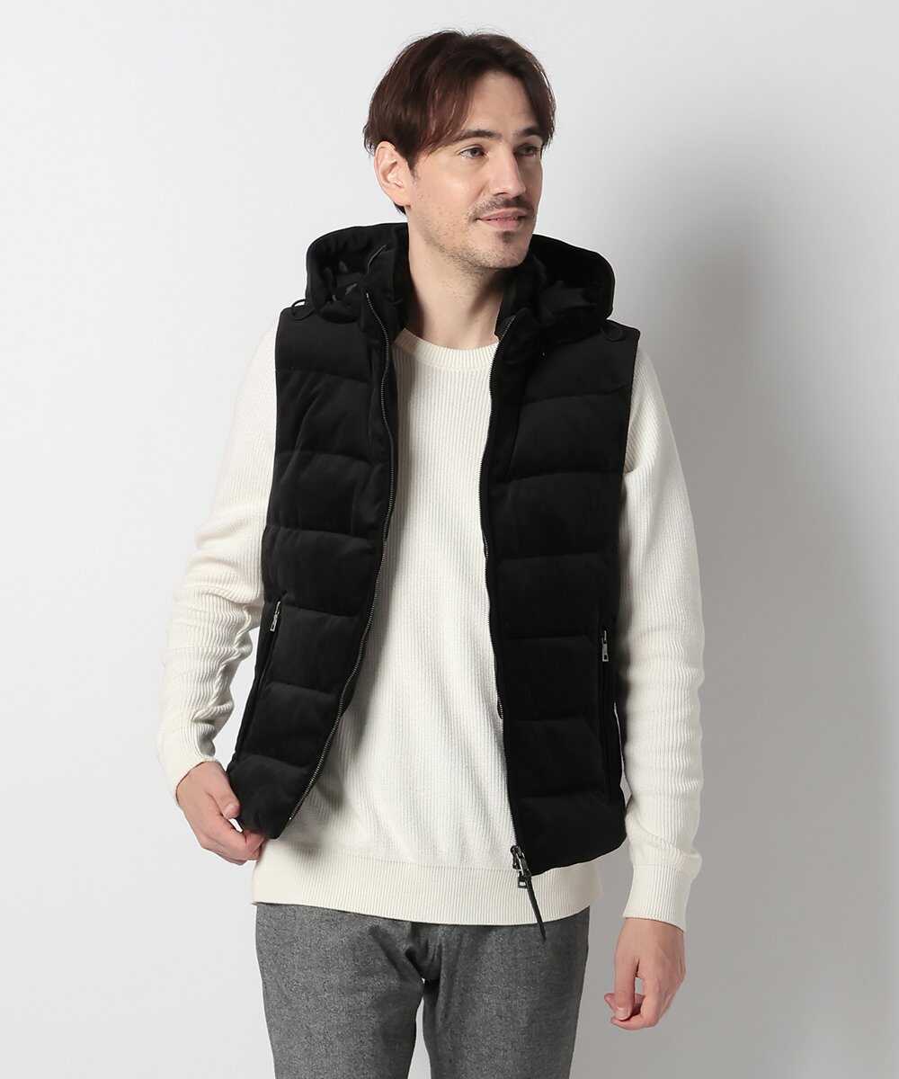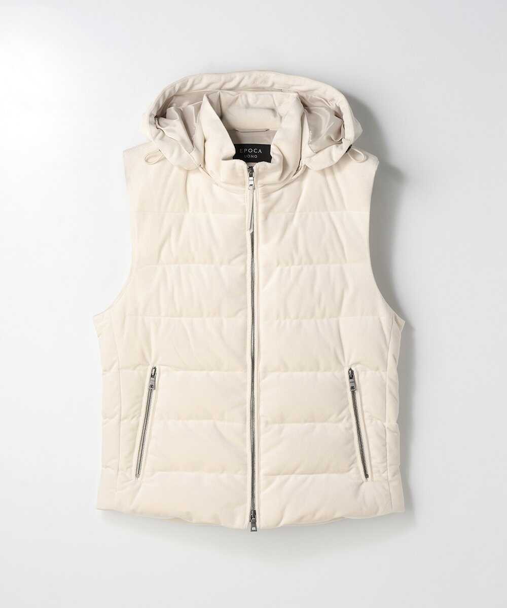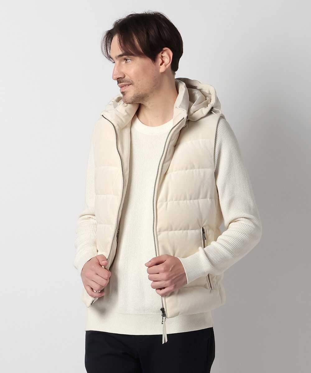 ダウンベストというと、どうしてもアメカジ的なスタイルを思い浮かべる人も多いと思う。かつてはそうだったかもしれないが、いまやダウンベストも多様性の時代。いろんなタイプが出揃っている。こちらは表がベロア素材となっていて、フーデッドタイプなのにドレスなテイストが感じられる。デニムというよりはトラウザーズと合わせて、上品に着こなしたい。フードは取り外し可能となっている。