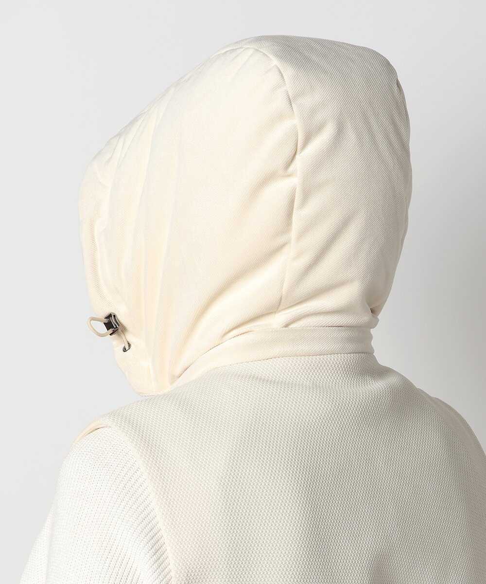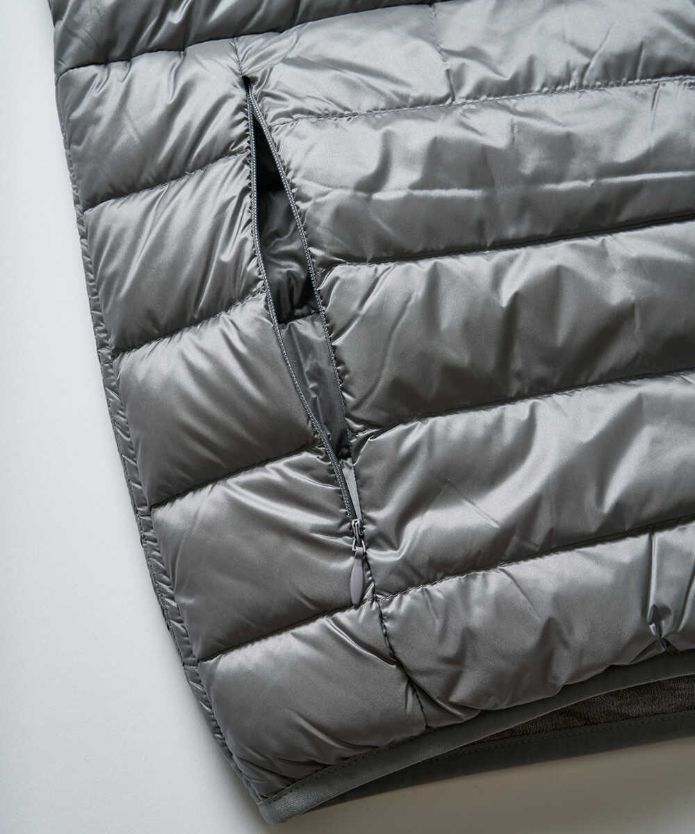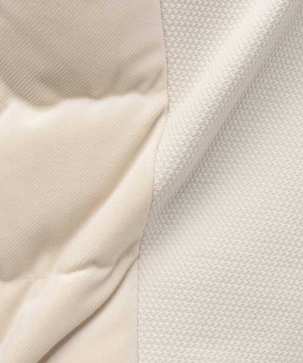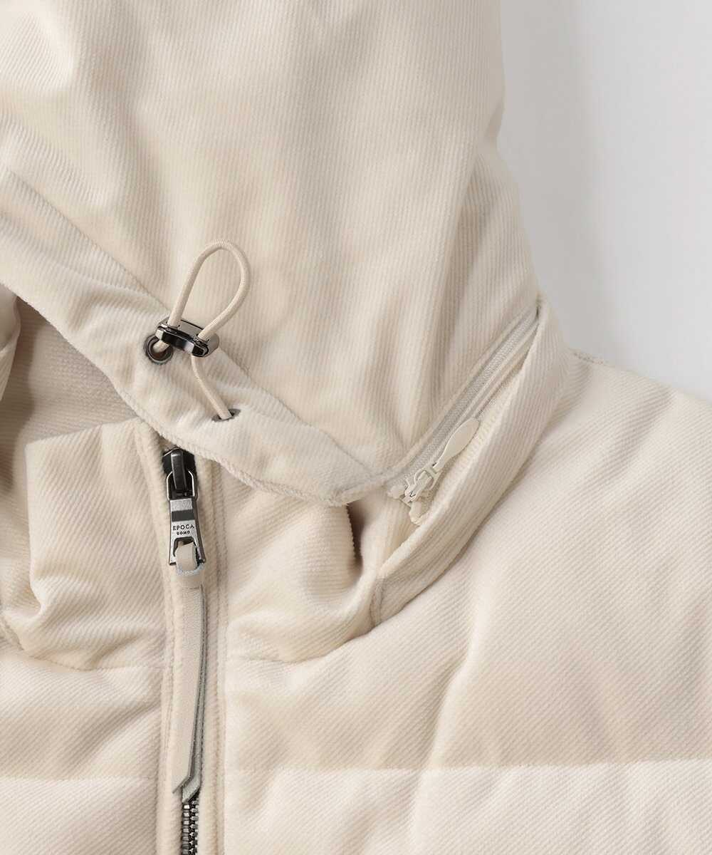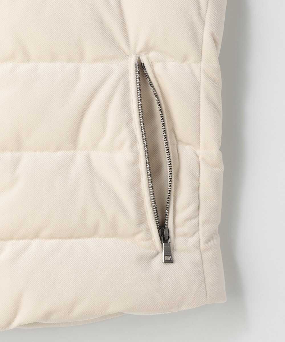 ダウンベストというと、どうしてもアメカジ的なスタイルを思い浮かべる人も多いと思う。かつてはそうだったかもしれないが、いまやダウンベストも多様性の時代。いろんなタイプが出揃っている。こちらは表がベロア素材となっていて、フーデッドタイプなのにドレスなテイストが感じられる。デニムというよりはトラウザーズと合わせて、上品に着こなしたい。フードは取り外し可能となっている。