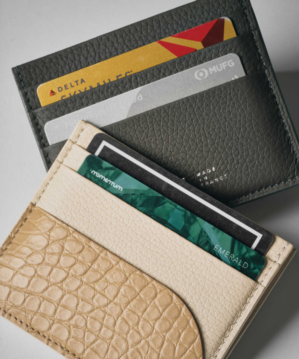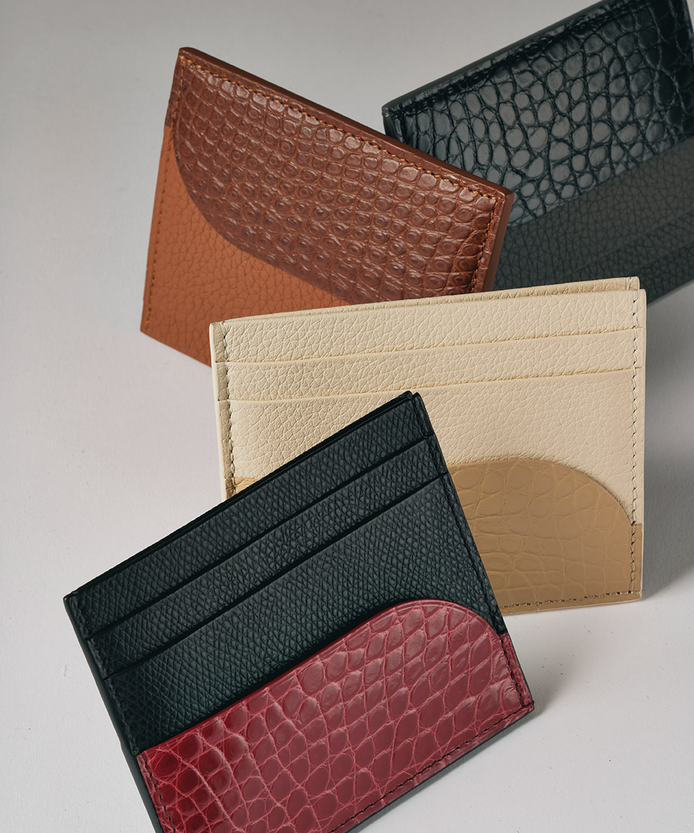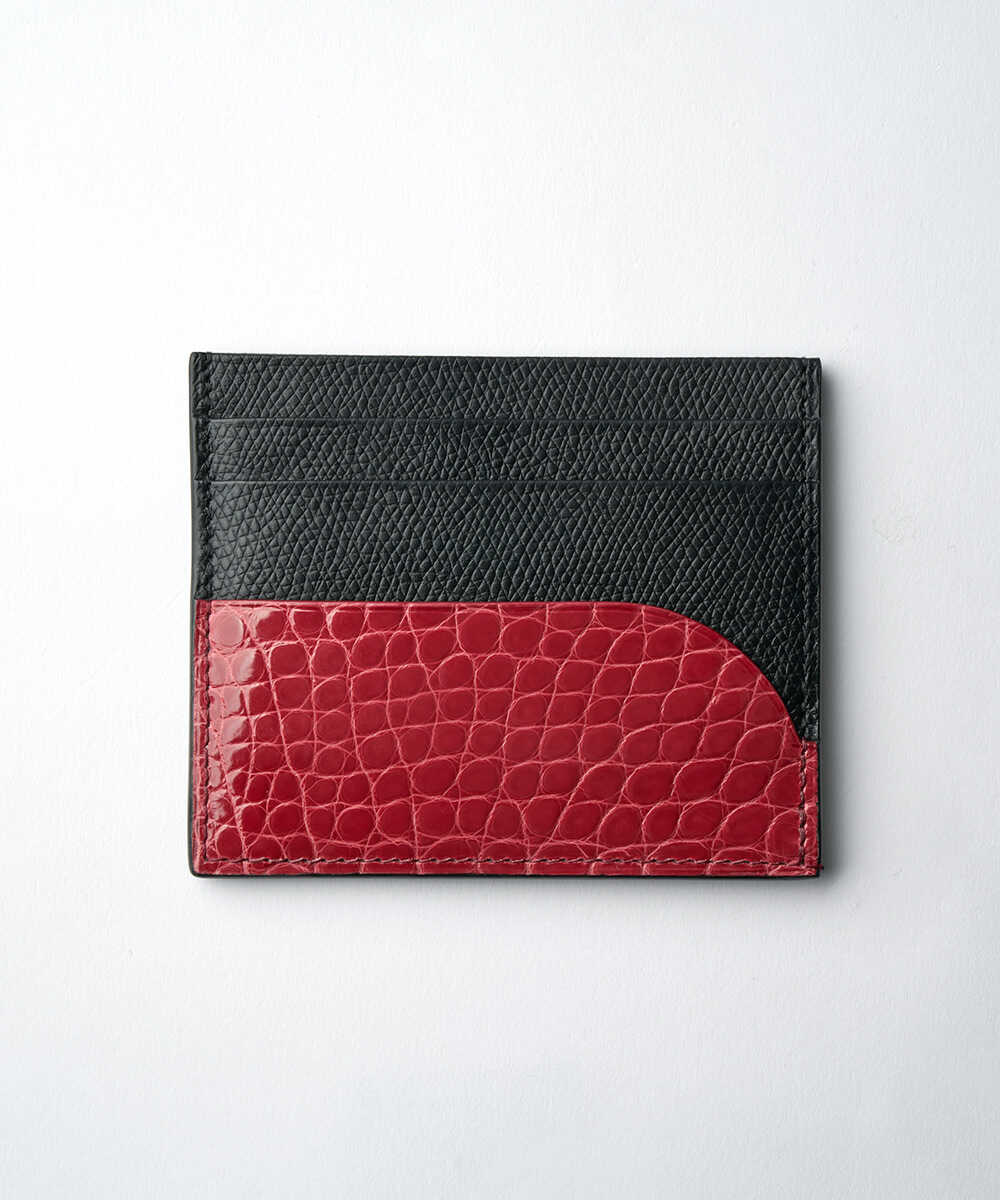 ジャケットの内ポケットやブルゾンのポケットにも収まる、絶妙なサイズ感。しかも見た目のバランス感が美しい。さすがはフランスのブランドのカード財布。左右の両面にクレジットカードを5枚収納でき、そこに挟まれるようにしてあるスリットにはお札やメモを入れられる。基本、キャッシュレスなライフスタイルを送っているなら、これくらいのサイズで十分だ。バイカラーになったカラーリングやリアルなアリゲーター仕様になったポケットも唯一無二なデザイン。フランスの職人の手によるステッチなども美しい。