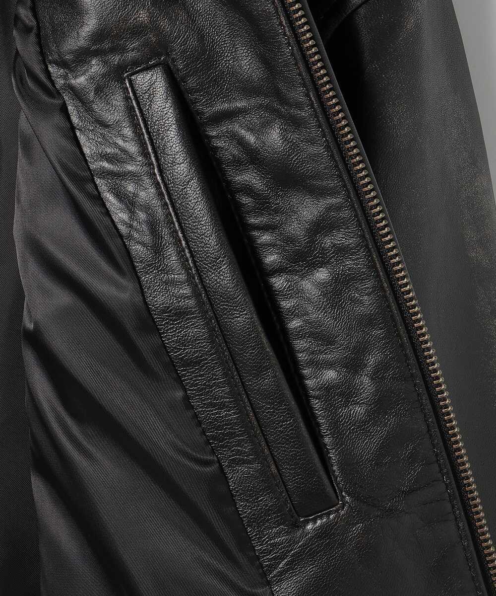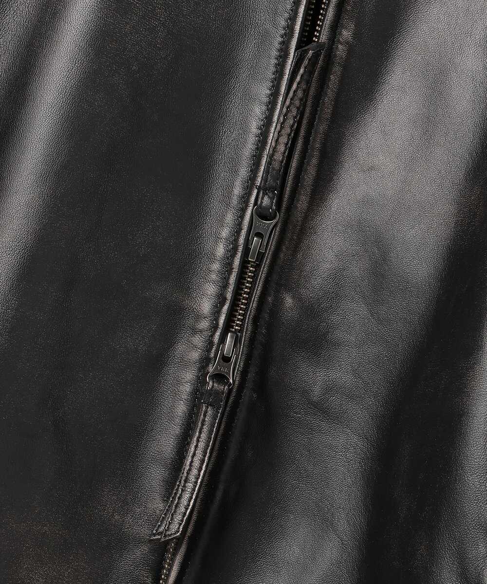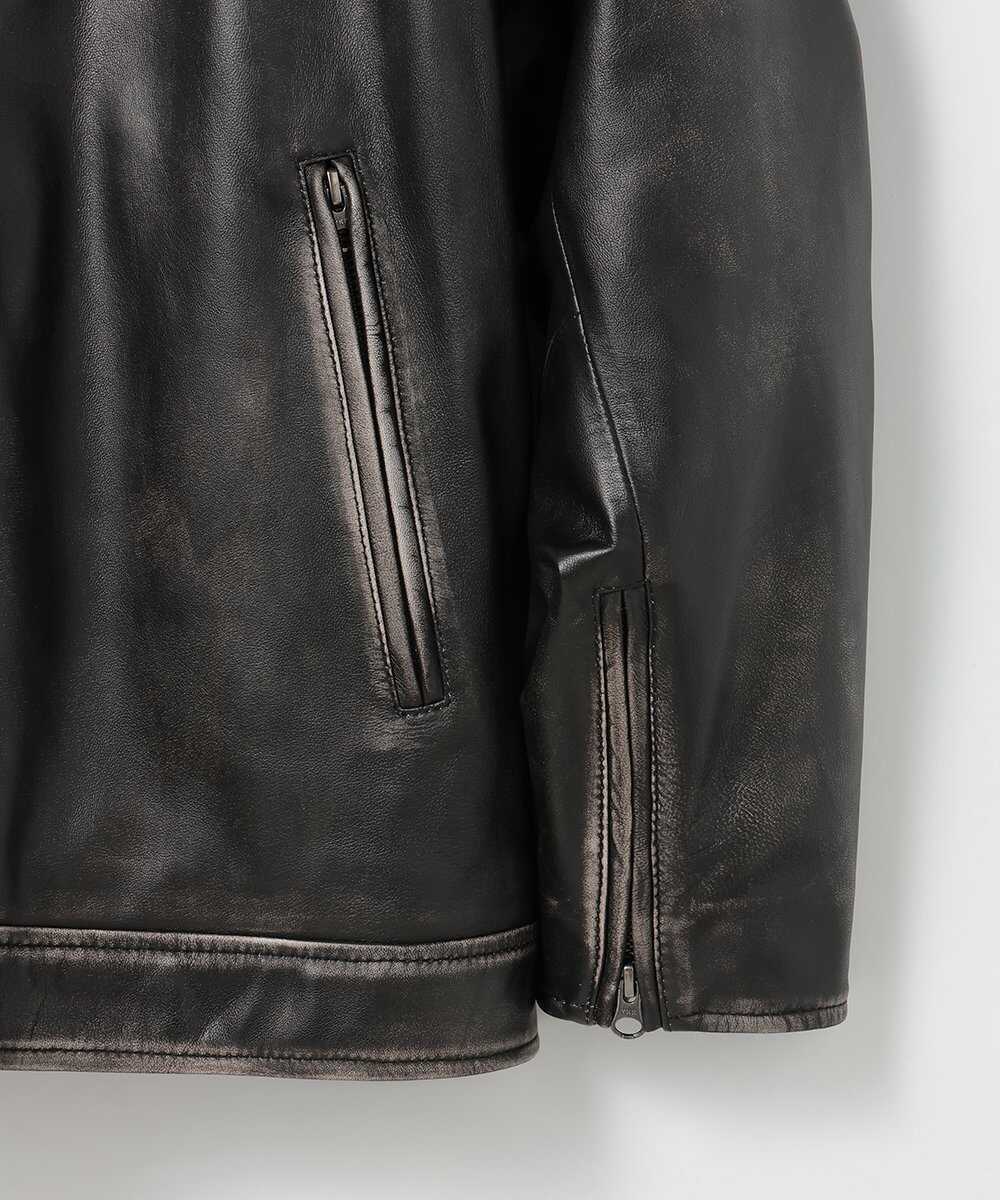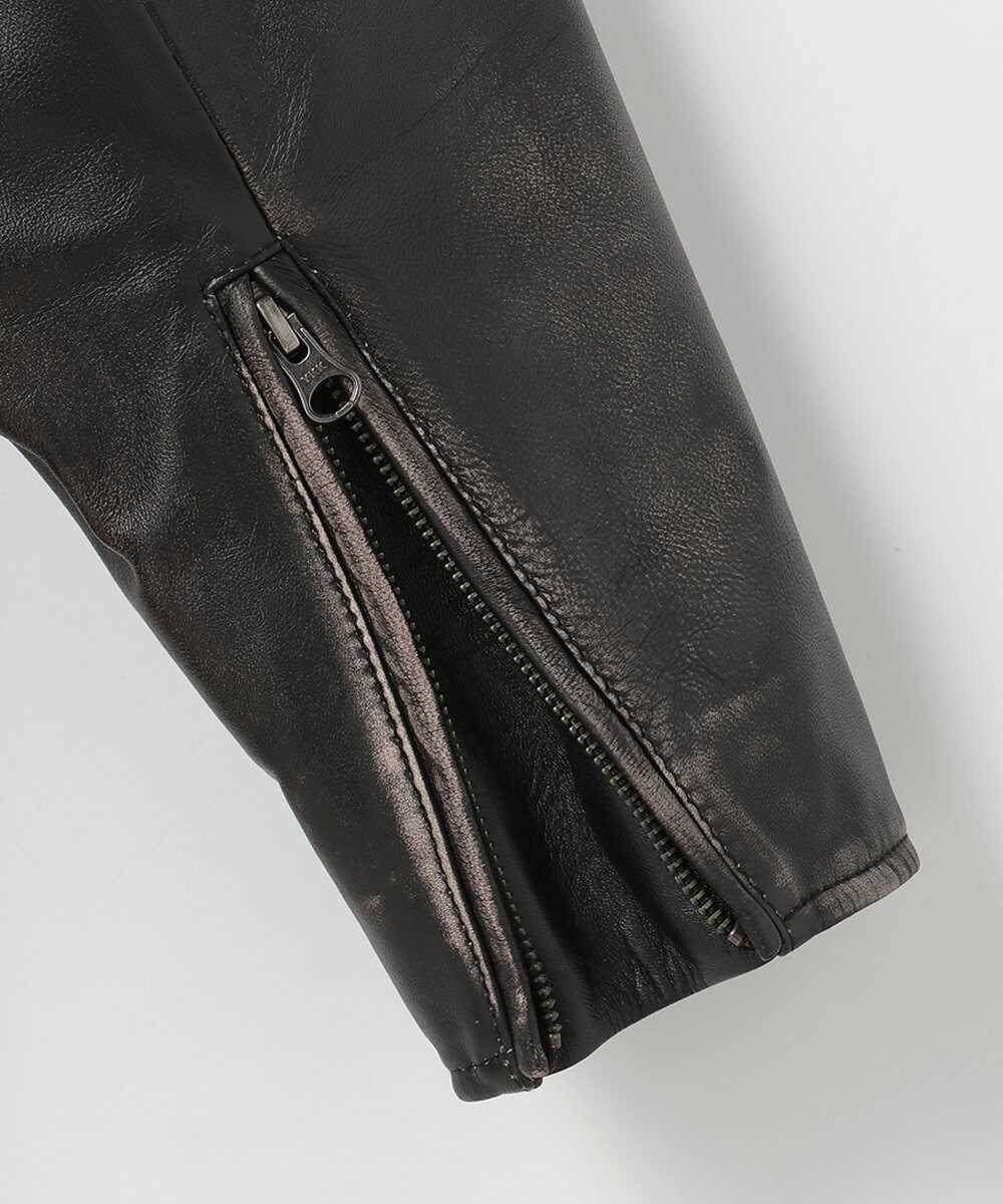 一見、柔らかな羊革で上品に仕上げた上品なシングルライダース。でも、実はベースの革を薄いカラーで染色後、黒の顔料で仕上げた"2TONEレザー"を使っているので、着込むほどに表面の顔料が程よく擦れ、下地のカラーが現れてくるギミックが。着込むほどに、まるでヴィンテージレザーのような表情を見せるのが特徴で、着て育てる楽しみが味わえる。