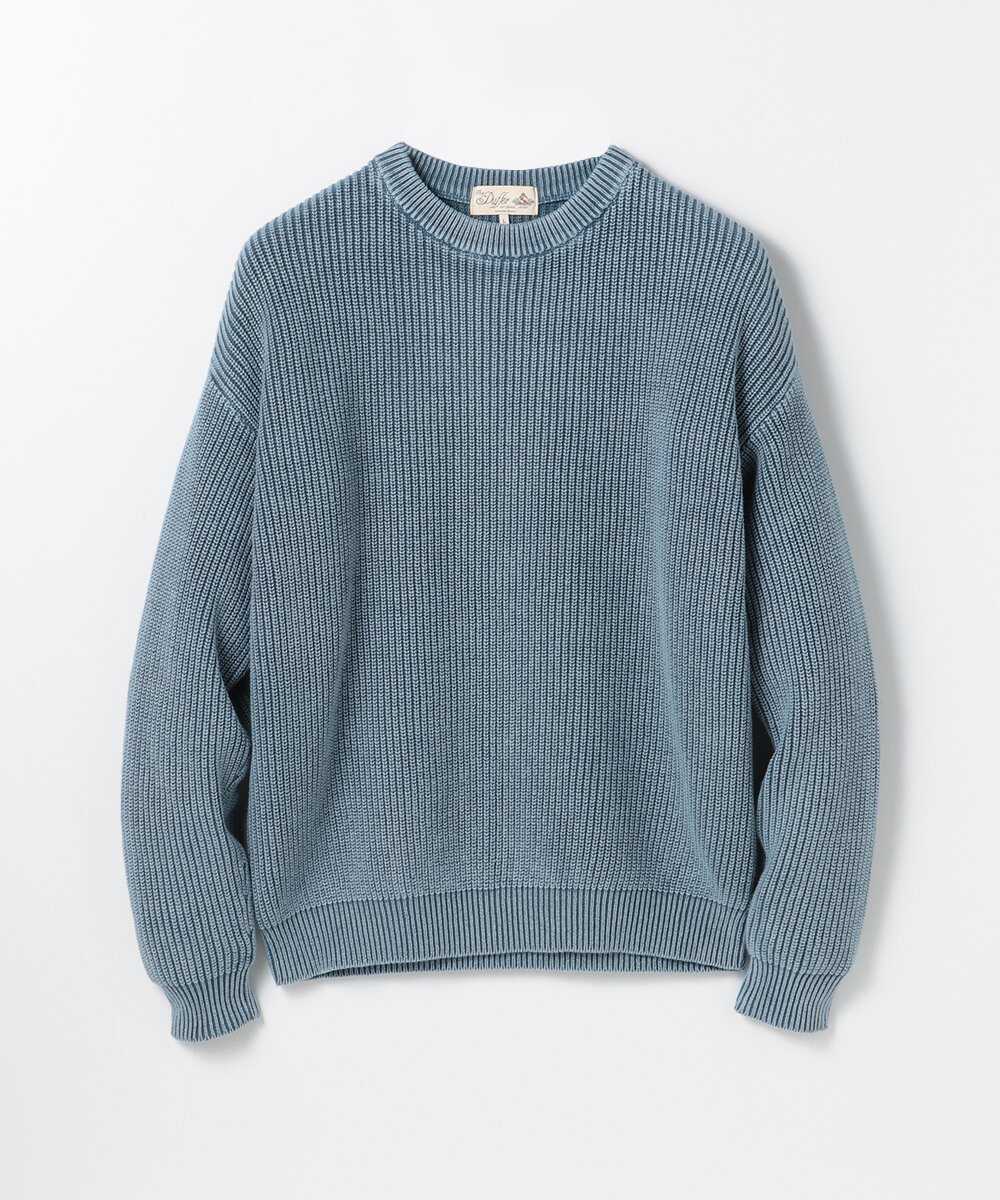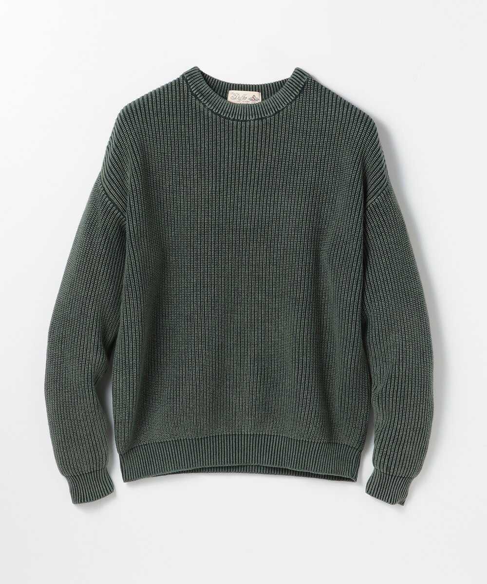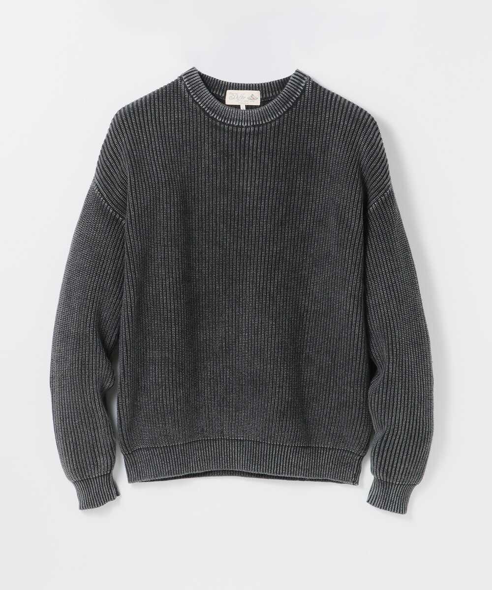 製品染めを施し、さらにストーンウォッシュとバイオ加工で表面をフェードさせたニットは見事な褪せ感。着るだけでアクセントになる、ほどよいヴィンテージ感を演出できている。飽きのこないベーシックなクルーネックで、畦編みが冬らしい見た目を演出。