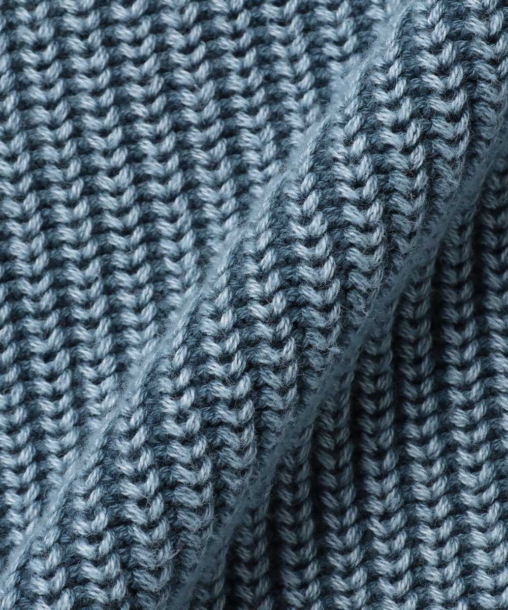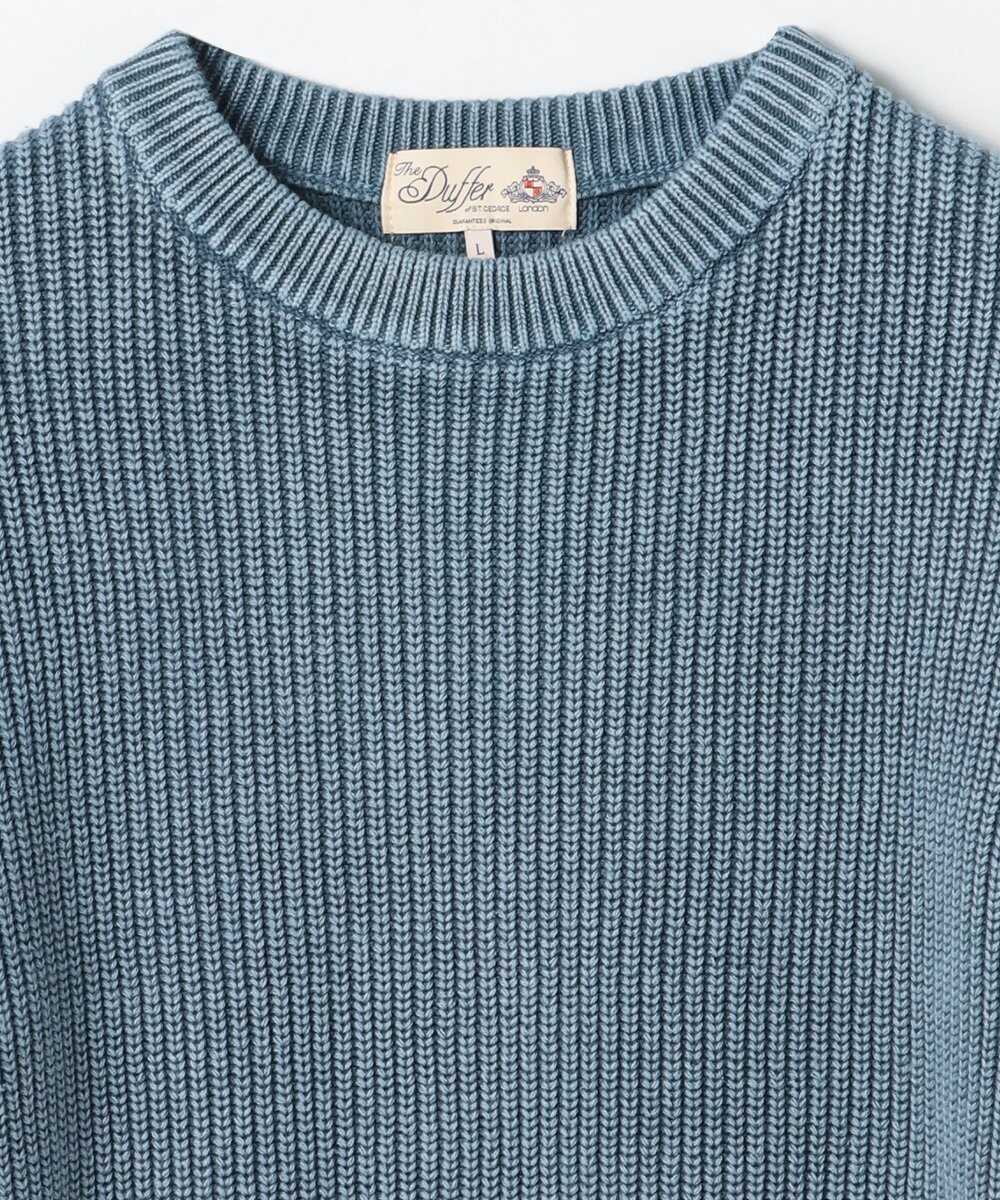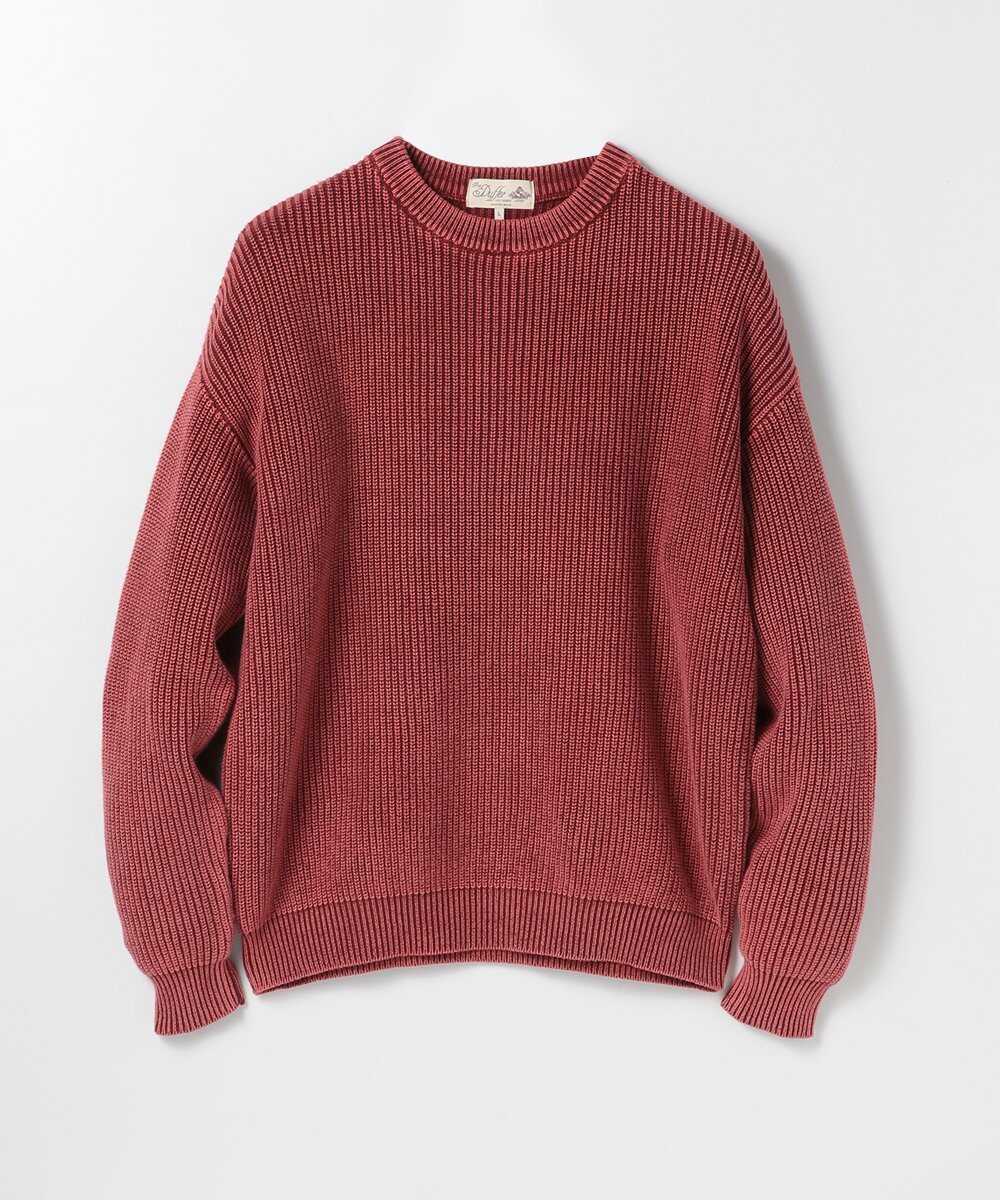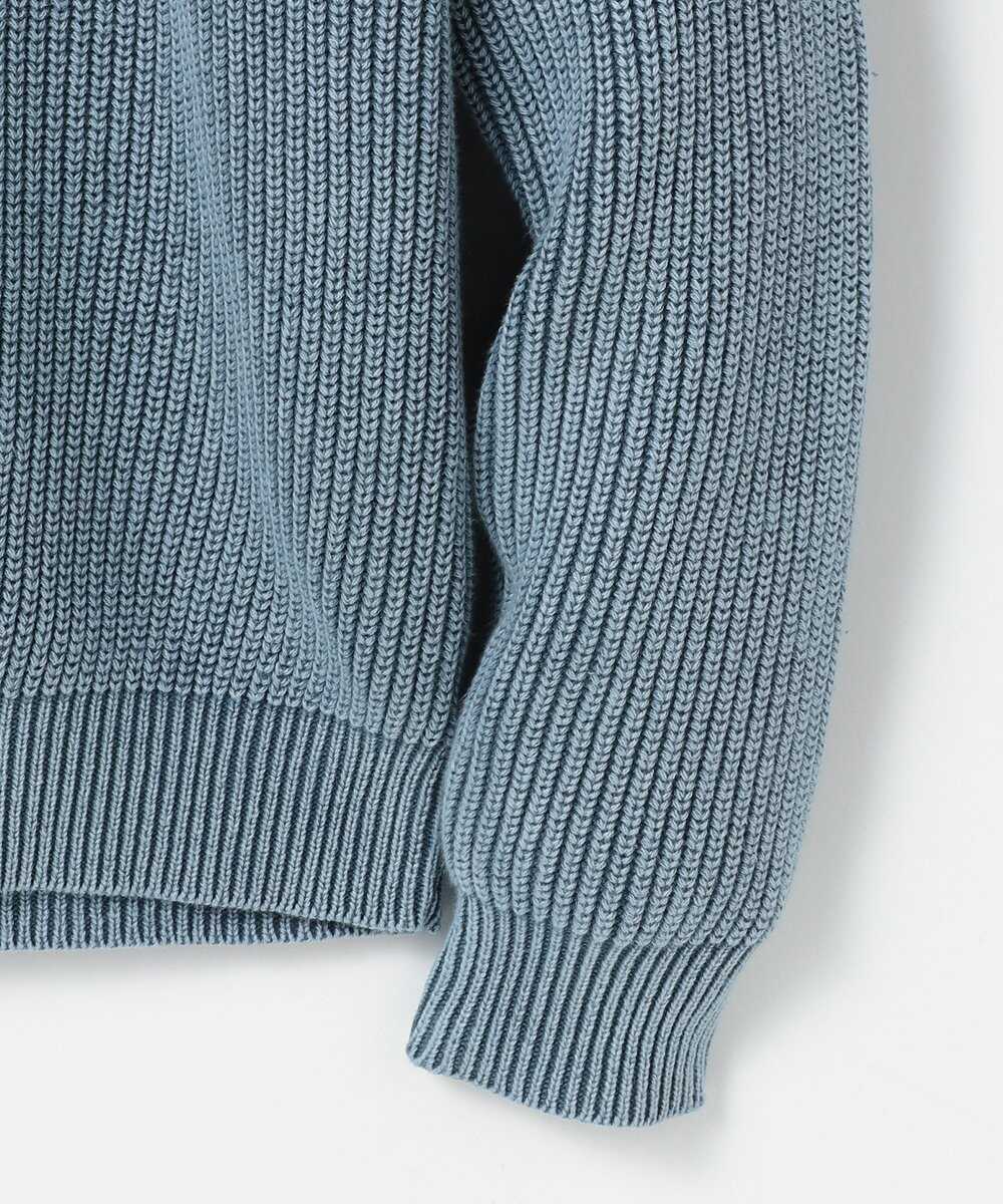 製品染めを施し、さらにストーンウォッシュとバイオ加工で表面をフェードさせたニットは見事な褪せ感。着るだけでアクセントになる、ほどよいヴィンテージ感を演出できている。飽きのこないベーシックなクルーネックで、畦編みが冬らしい見た目を演出。
