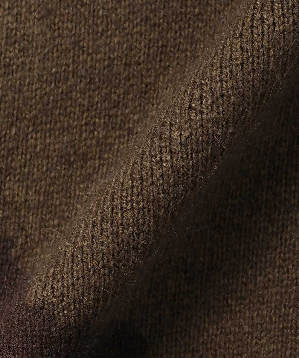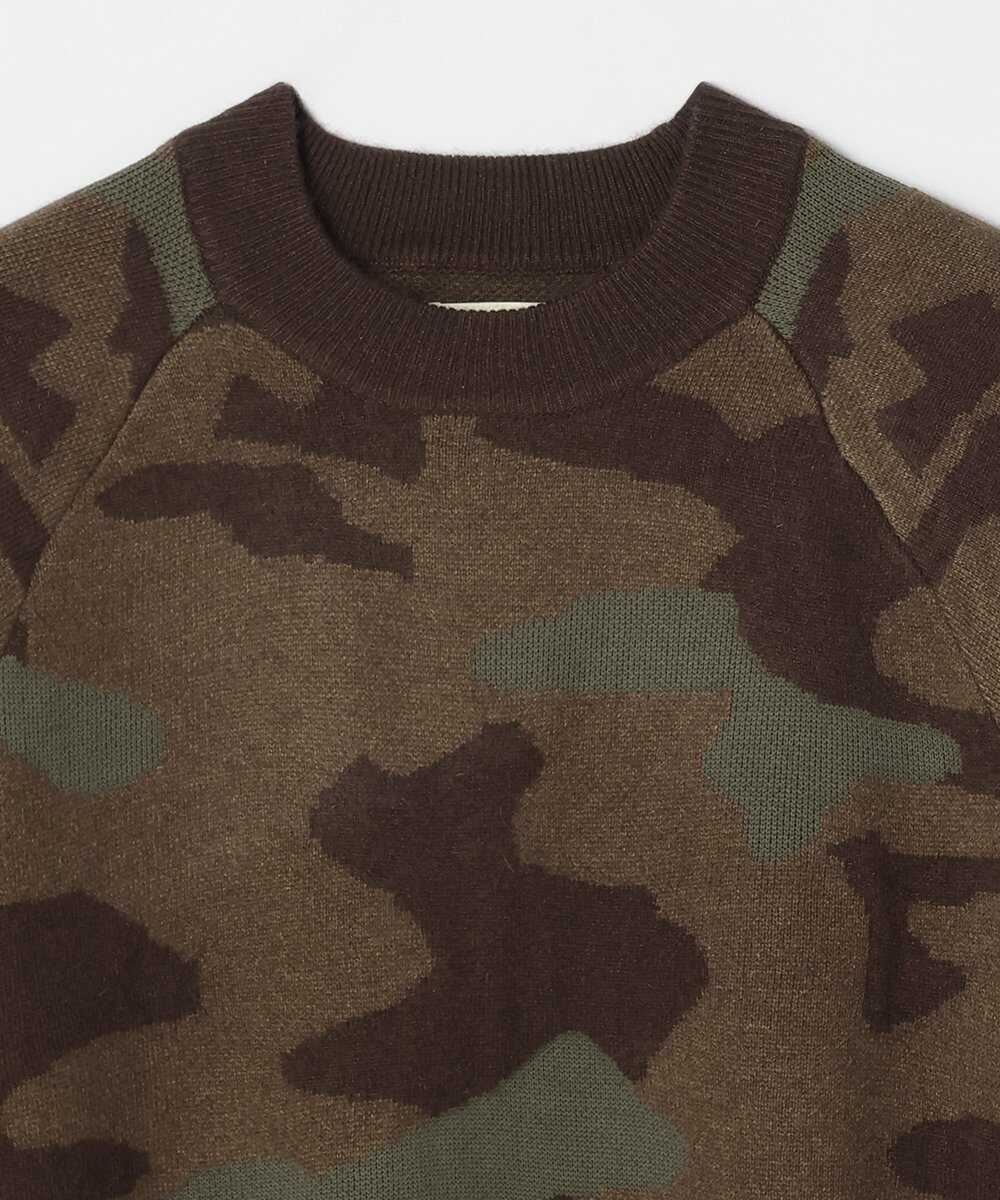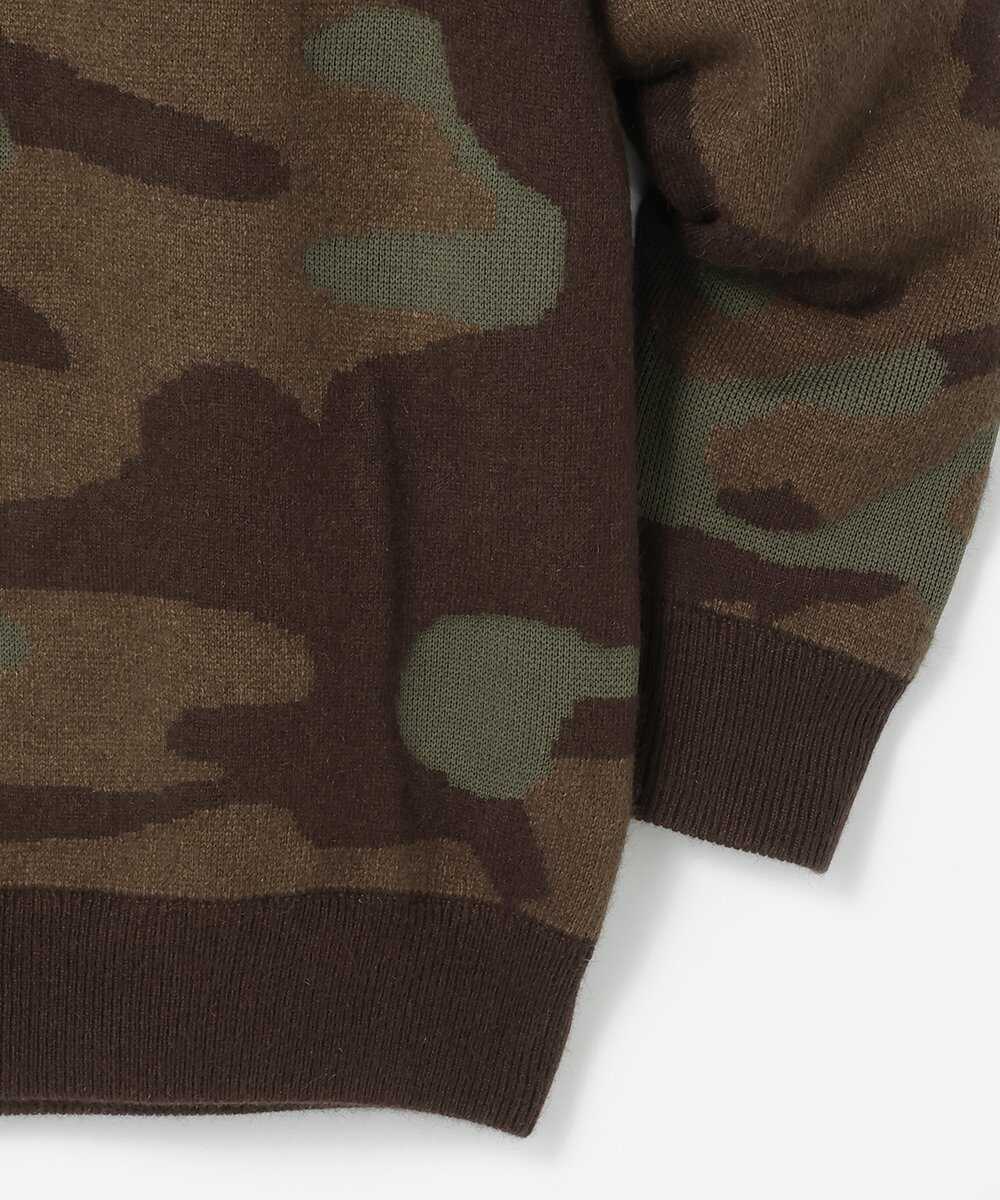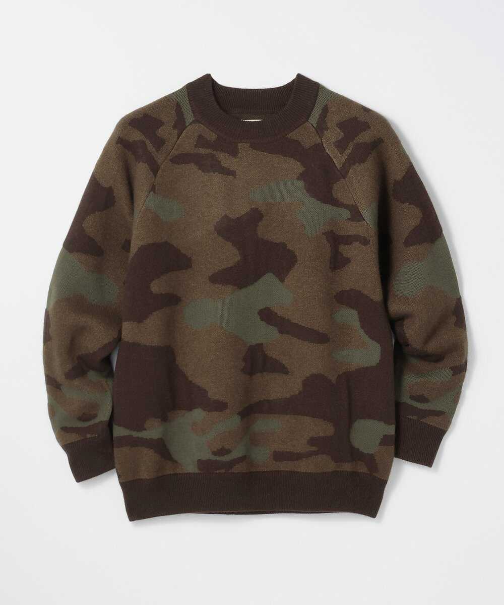 本格的な迷彩柄が目を引くニットは、ウールとポリエステルの異素材を組み合わせた糸を使用することで、奥行きのある柄を表現。ジャカード織りで編み立てたことで、ふんわりとした風合いになり、男らしさはあるが派手すぎない質感になっている。この絶妙な塩梅が、このブランドの得意とするところだ。