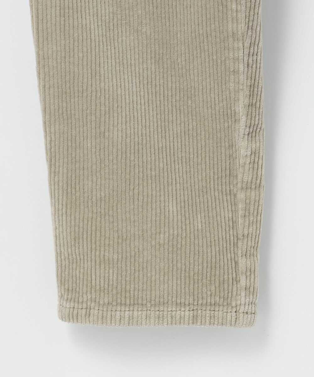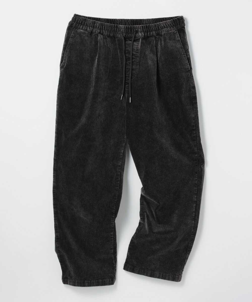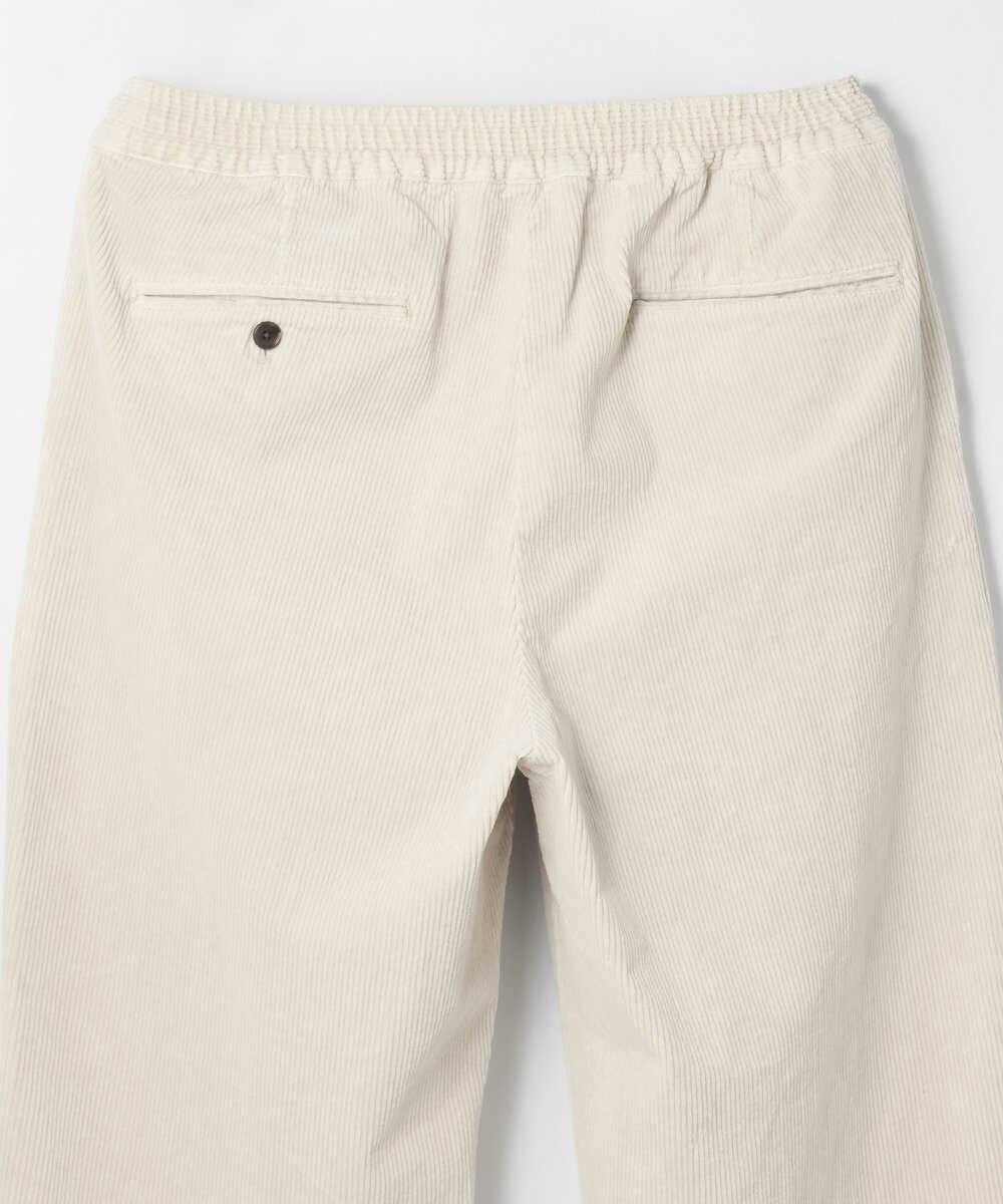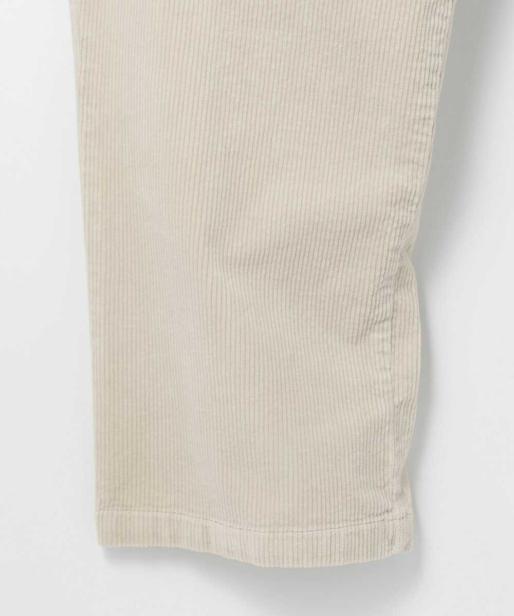 同じく、ストレッチ入りの細畝コーデュロイ素材を採用したワイドパンツ。製品染め加工で柔らかくなった生地の落ち感で品のよさが際立つ一方、味わい深い表情が大人の渋みを演出してくれる。こちらのモデルはウエストが楽ちんなイージー仕様だ。