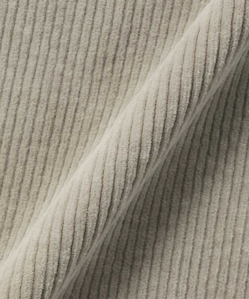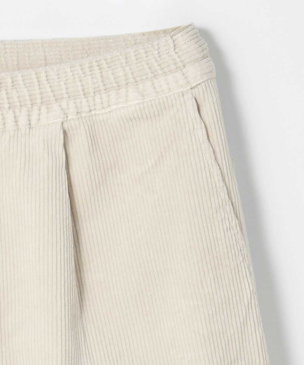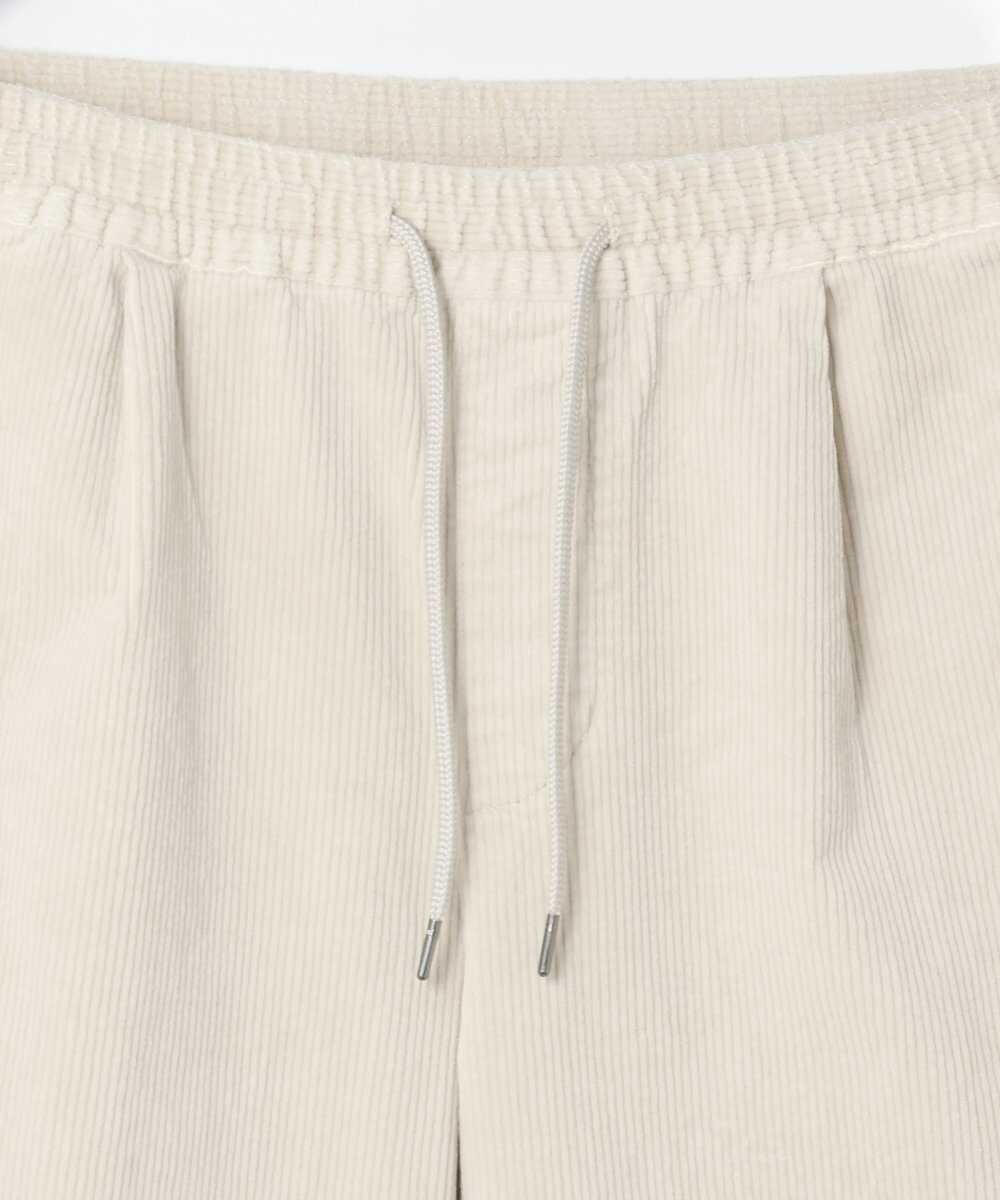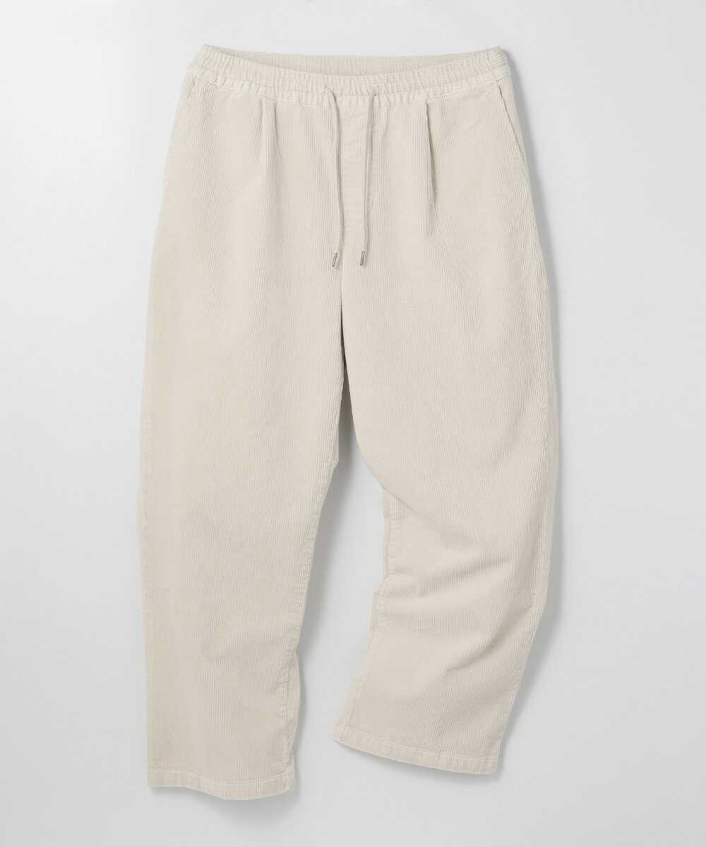同じく、ストレッチ入りの細畝コーデュロイ素材を採用したワイドパンツ。製品染め加工で柔らかくなった生地の落ち感で品のよさが際立つ一方、味わい深い表情が大人の渋みを演出してくれる。こちらのモデルはウエストが楽ちんなイージー仕様だ。