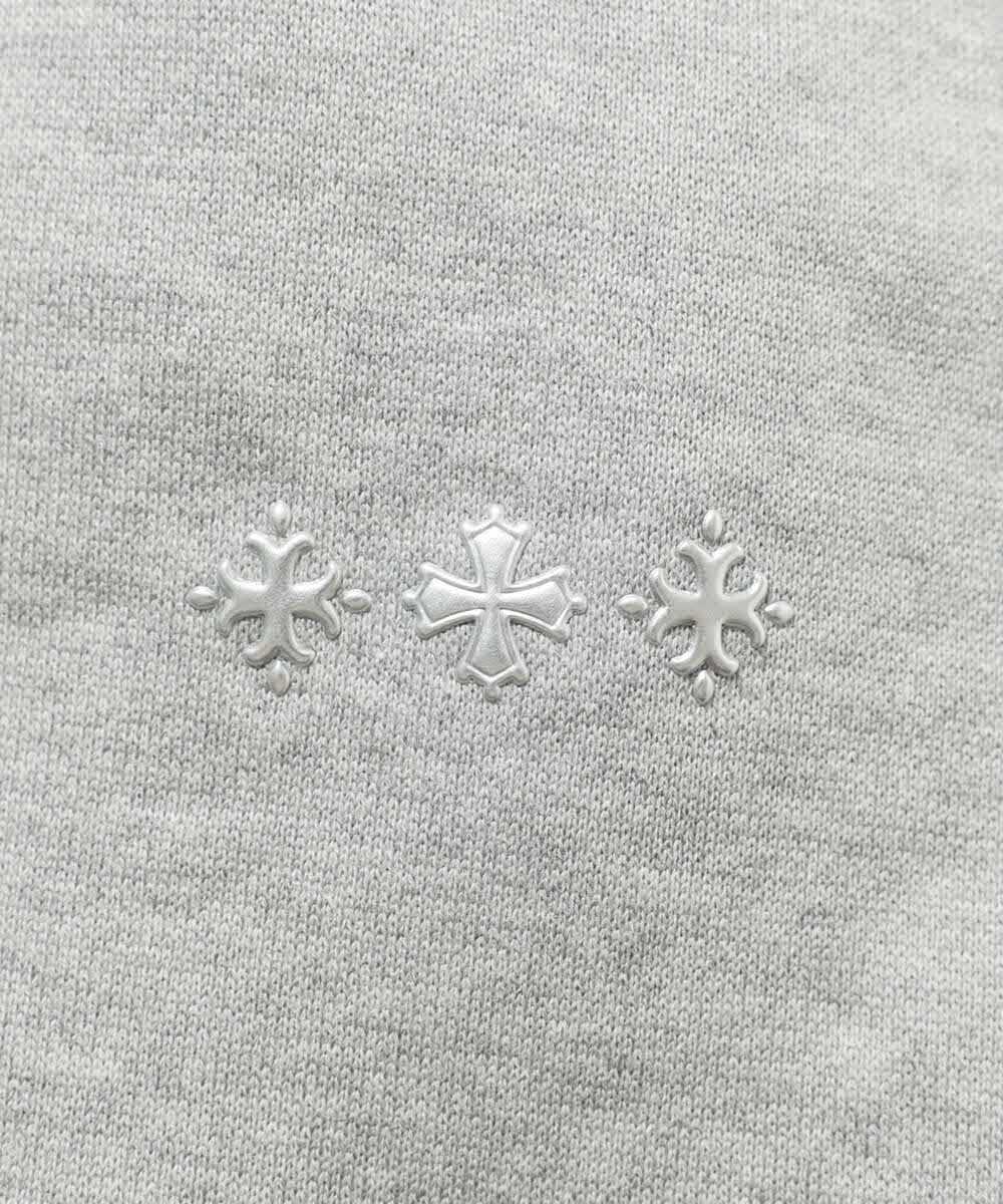 左腿のフロントには小さな同色のロゴ、左ふくらはぎの後ろにクロスアイコンをさりげなく配しアクセントに。