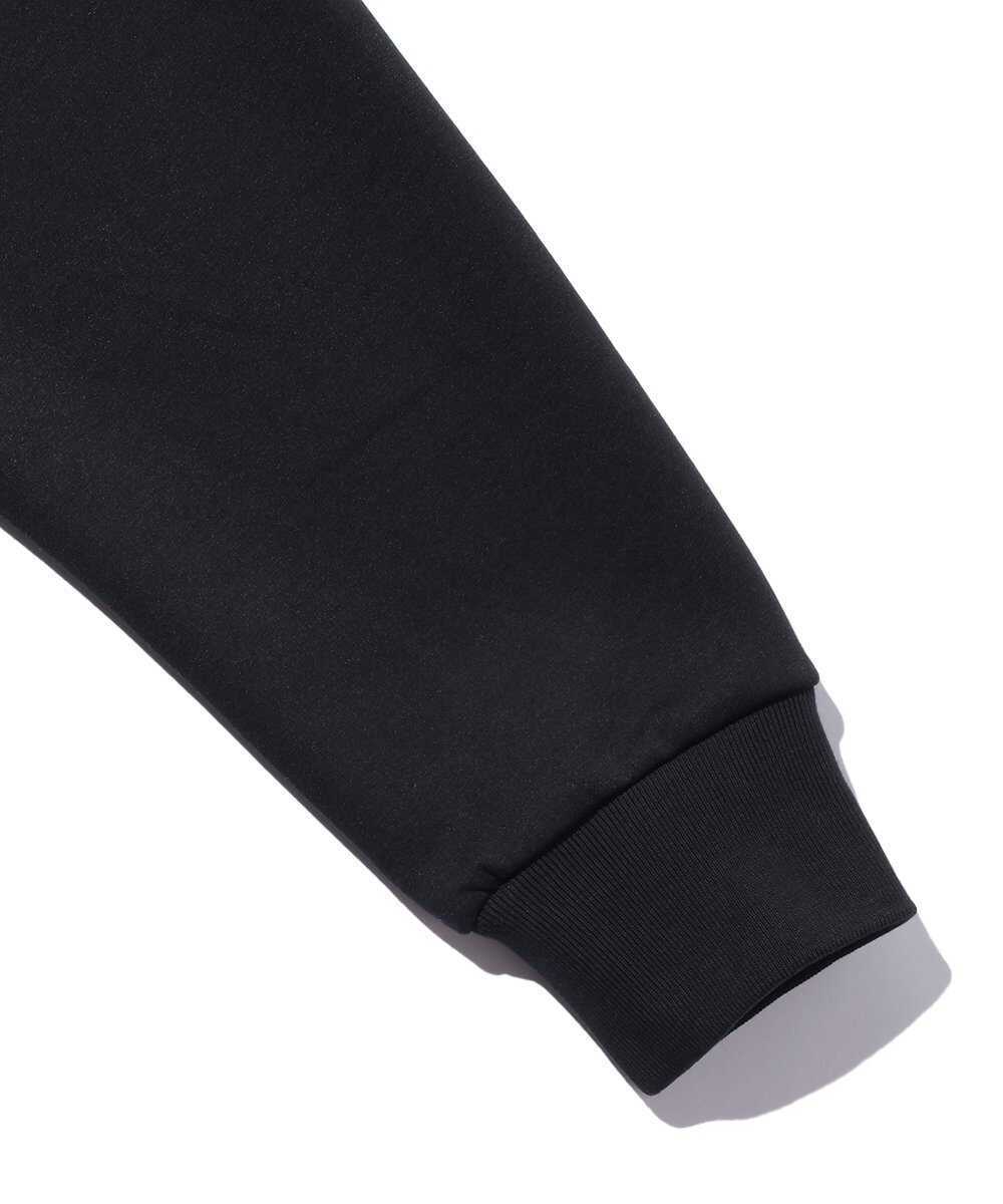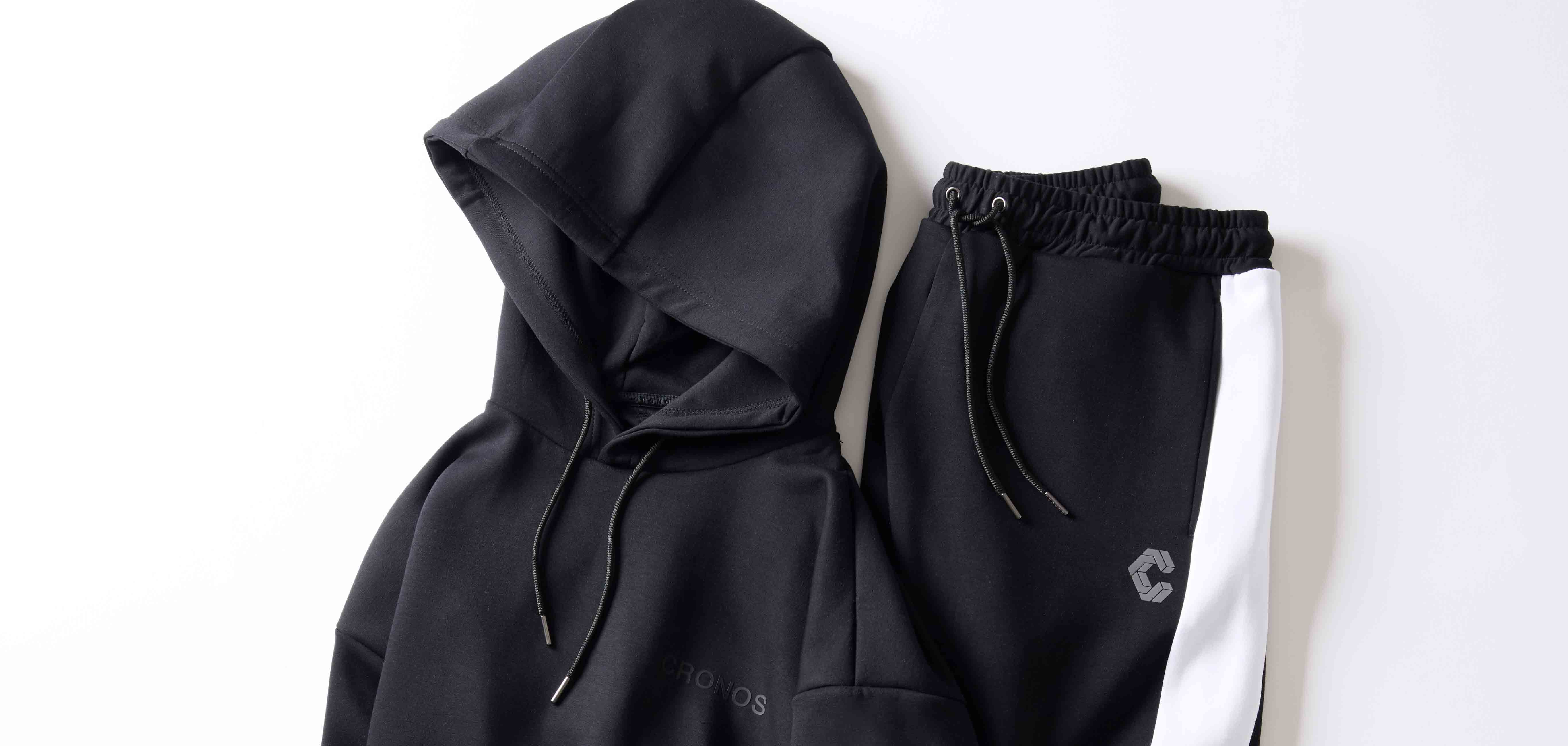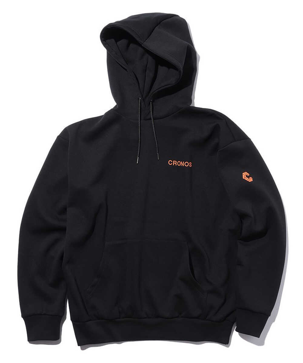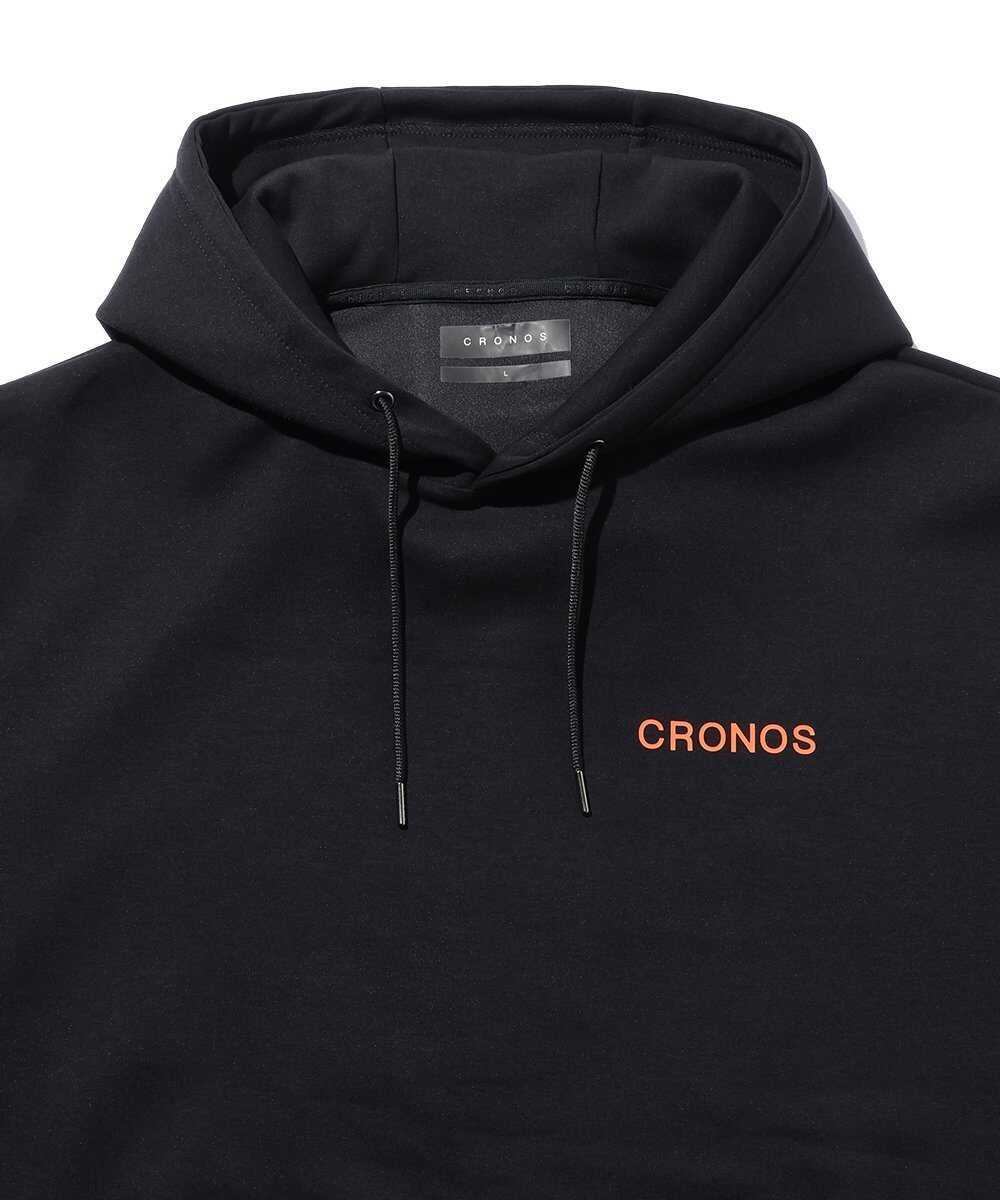 スポーティでモダンな印象のパーカは、素材に艶感のあるダンボールニットを採用することで部屋着に見えないように計算。また、スタイリッシュに見えるように、さりげなくフロントや左袖に加え、背面には円形の〈クロノス〉ロゴを配置した。